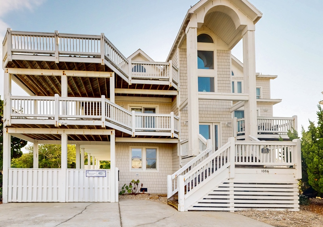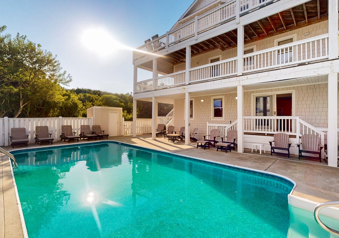 Some of the amazing amenities offered include private unheated pool that's one of the largest private pools in Whalehead, Polywood loungers and Adirondacks, a hot tub, WiFi, nine TVs, two DVD players, Netflix streaming on smart TVs (great room and rec room), a wet bar with a mini-fridge, an additional full-size refrigerator on the ground floor, Ping-Pong, air hockey, foosball, a basketball goal, beautiful sunrise and sunset views from the top deck, and beach access within 190 yards.