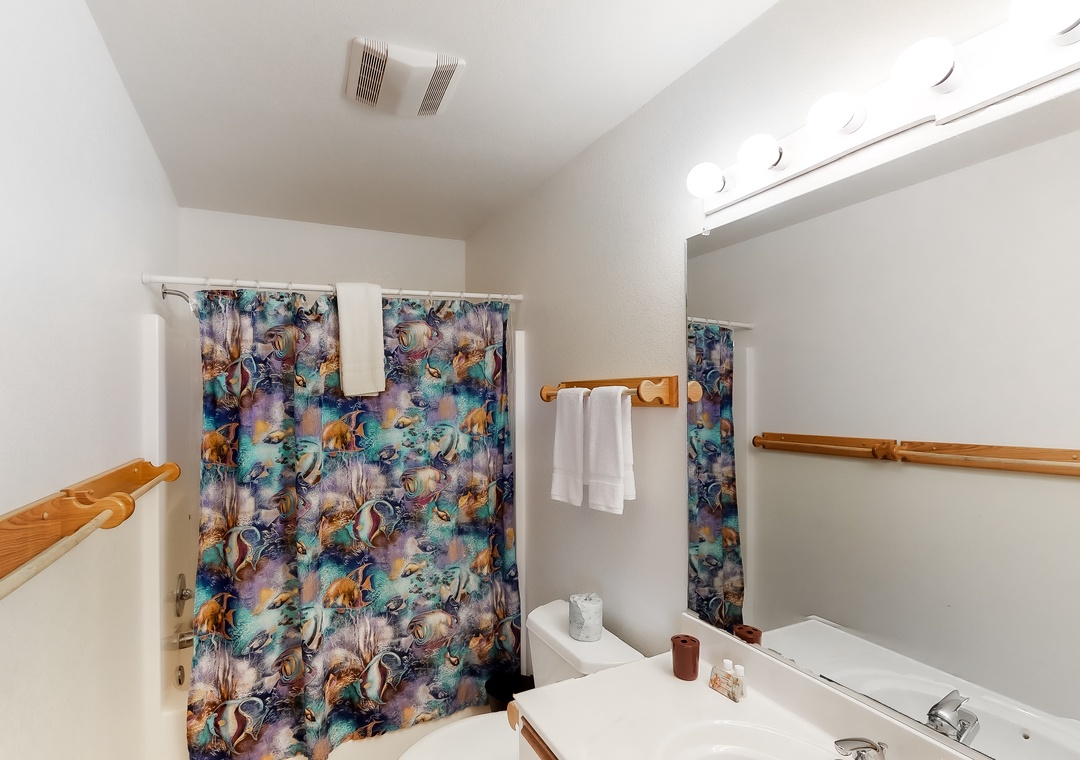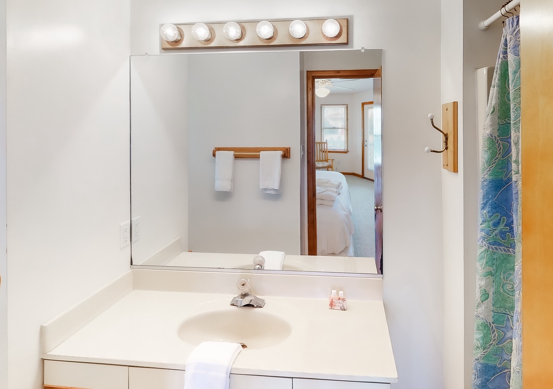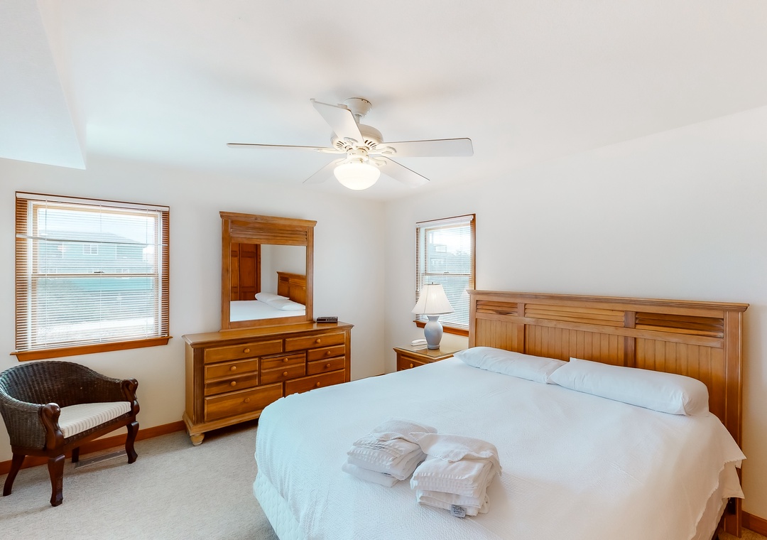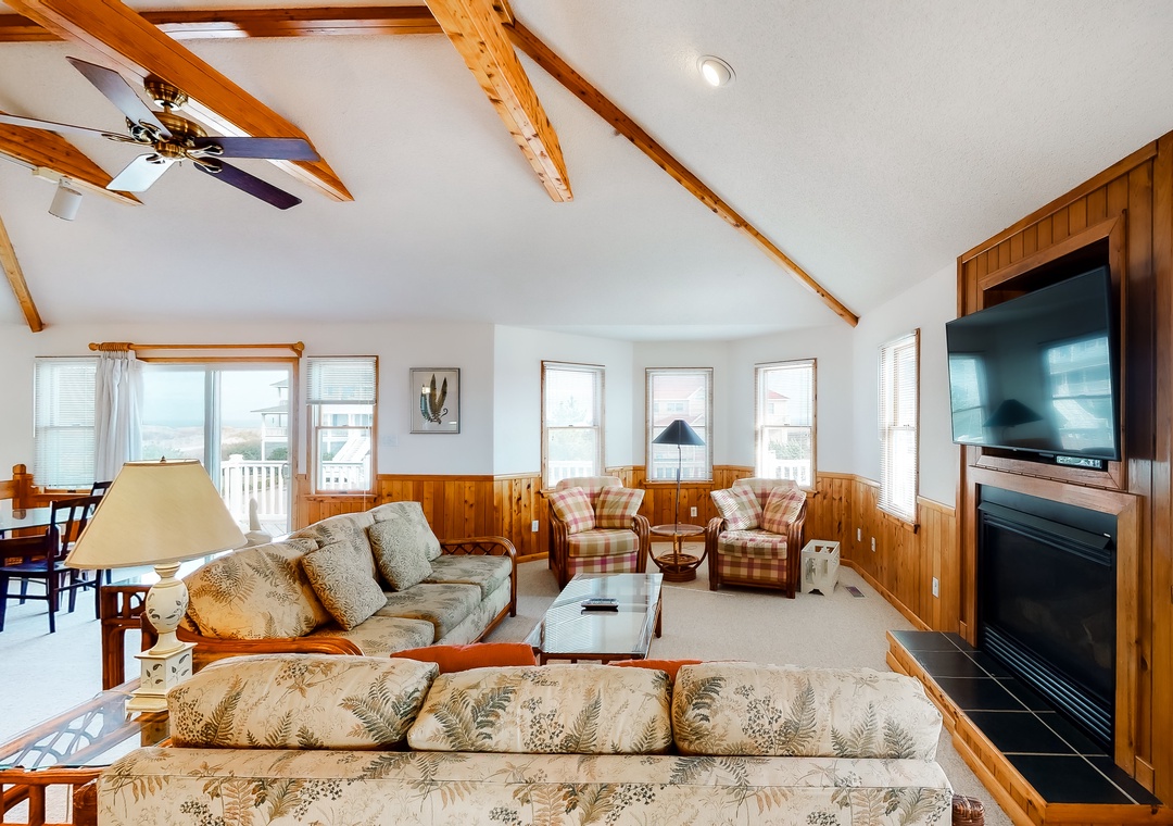 Top Level: The lovely great room with TV/DVD, offers fantastic views, and opens to the sunroom also with TV/DVD. The kitchen is well-equipped for your cooking enjoyment. There is a primary bedroom on this level. The decks overlook the pool area and ocean. A half bath completes this level.