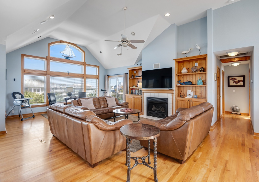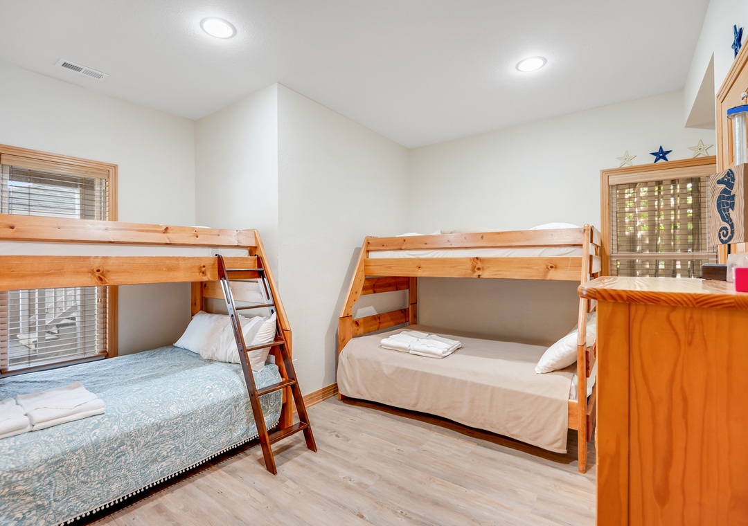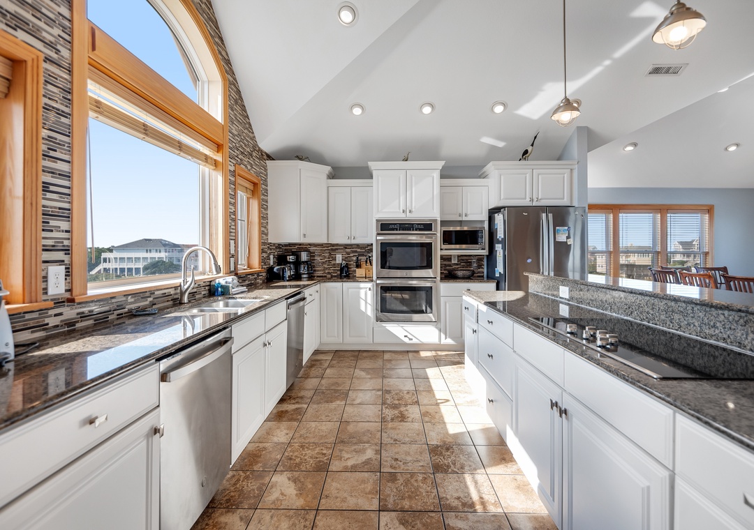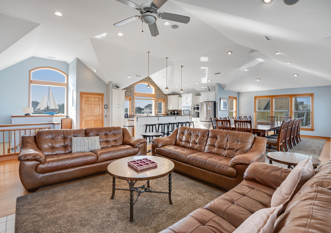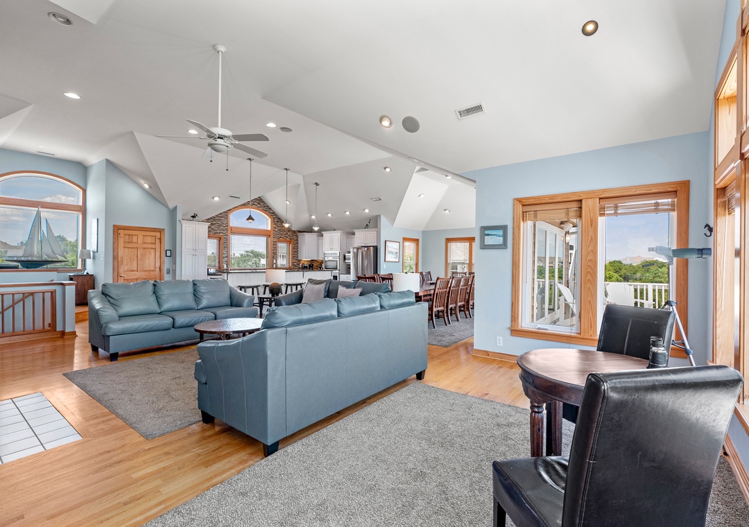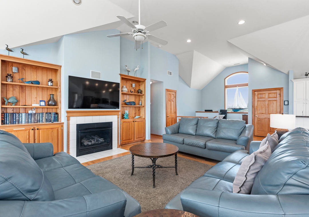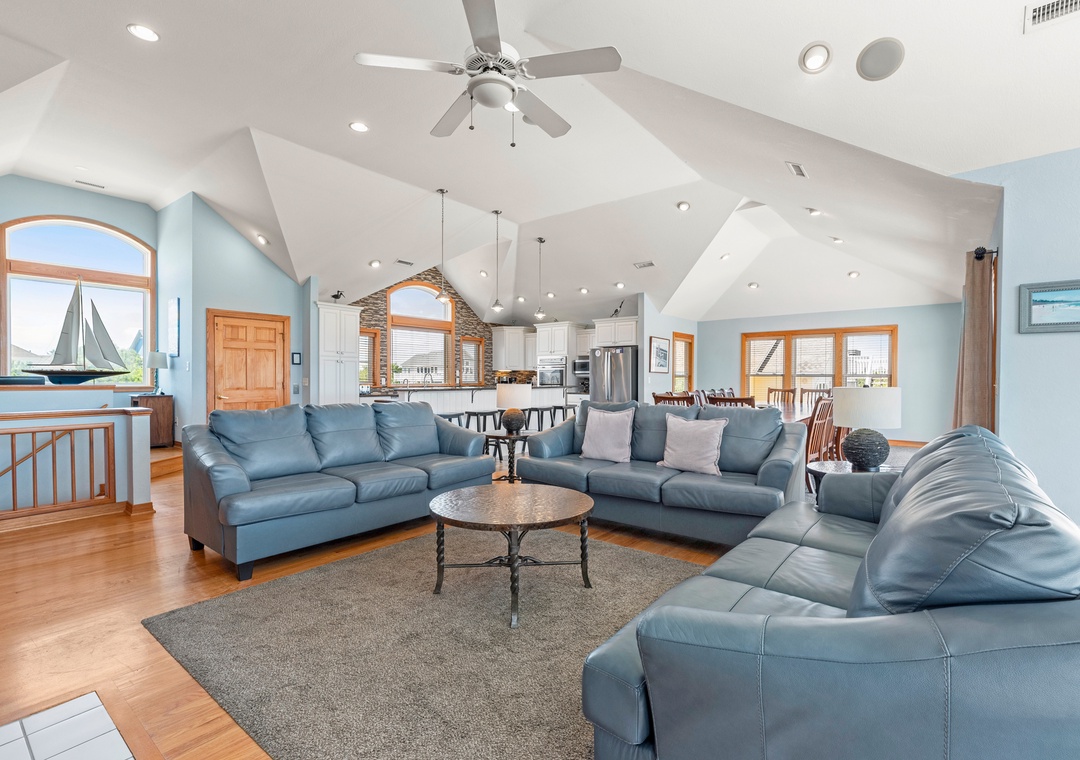 Step inside and be greeted by beautifully curated furnishings and spacious interiors that invite you to unwind. With seven king ensuite bedrooms, one queen ensuite bedroom with a wheelchair-accessible shower, an ensuite bedroom with two pyramid bunk beds, and an extra room with one pyramid bunk, everyone will find their perfect place to rest. The top floor boasts a sun-drenched open-concept living area with a gourmet kitchen, a dining table that seats 16, and a stylish great room with leather couches, a gas fireplace, and a 50” flat-screen TV. Step out onto the wraparound deck to enjoy ocean breezes from multiple seating areas.