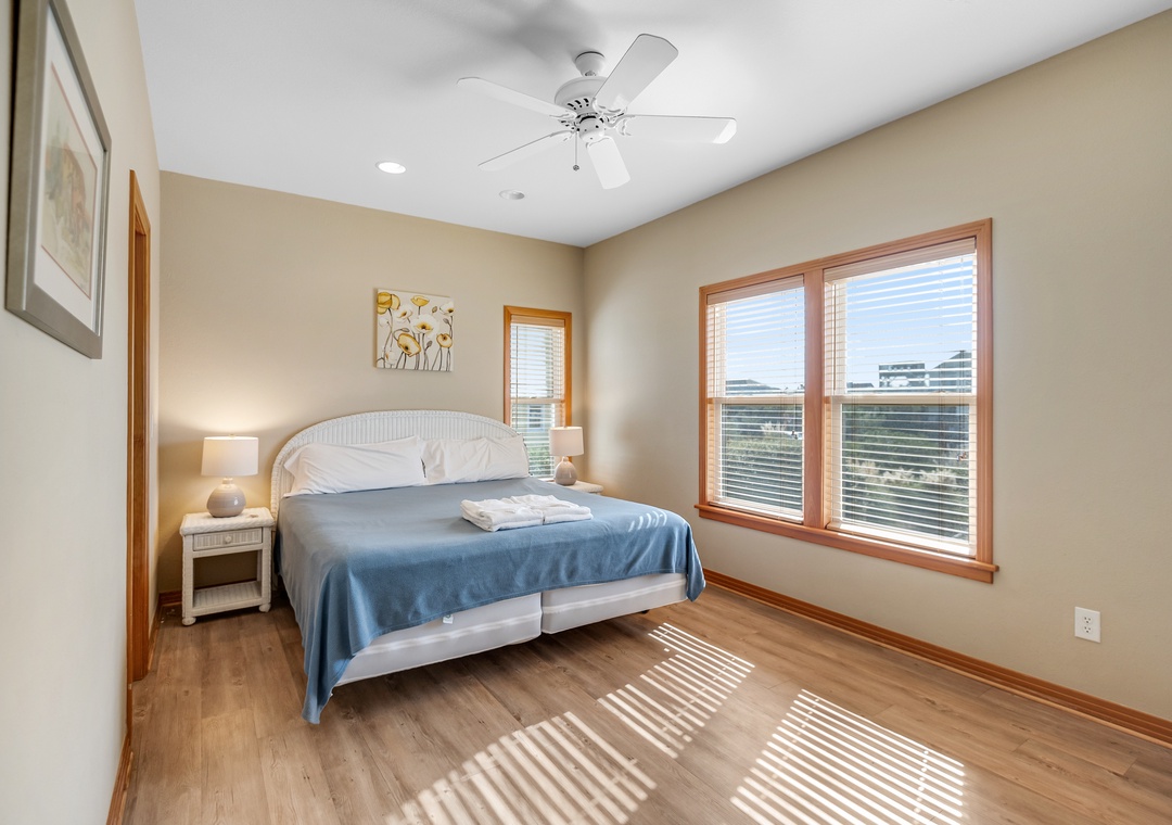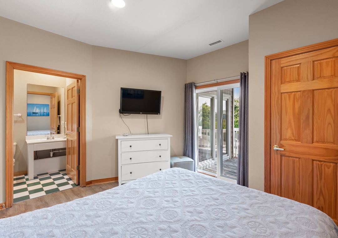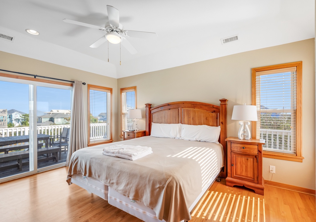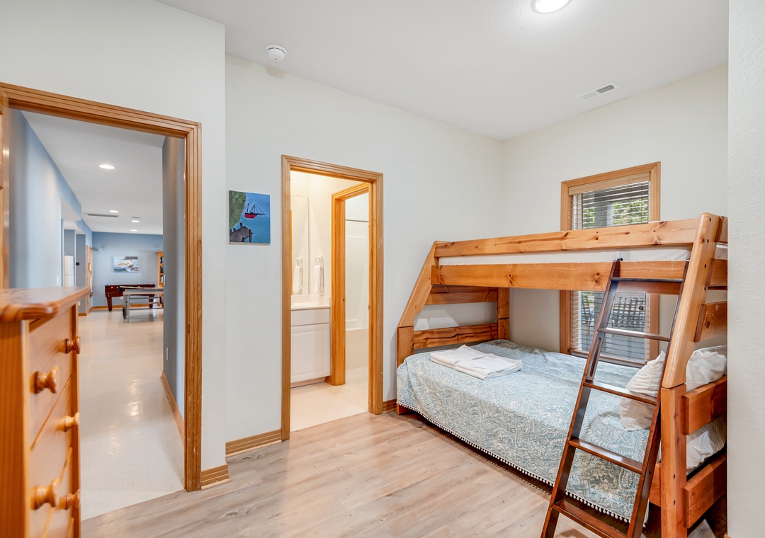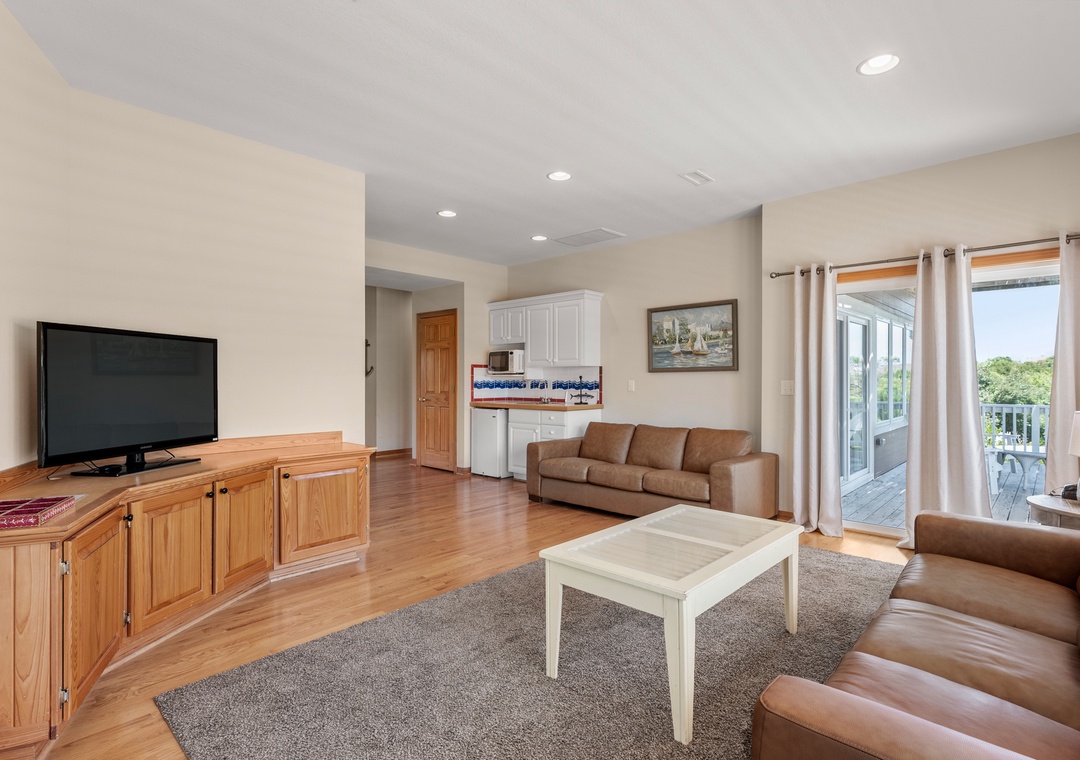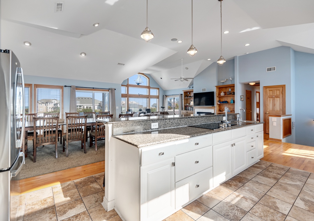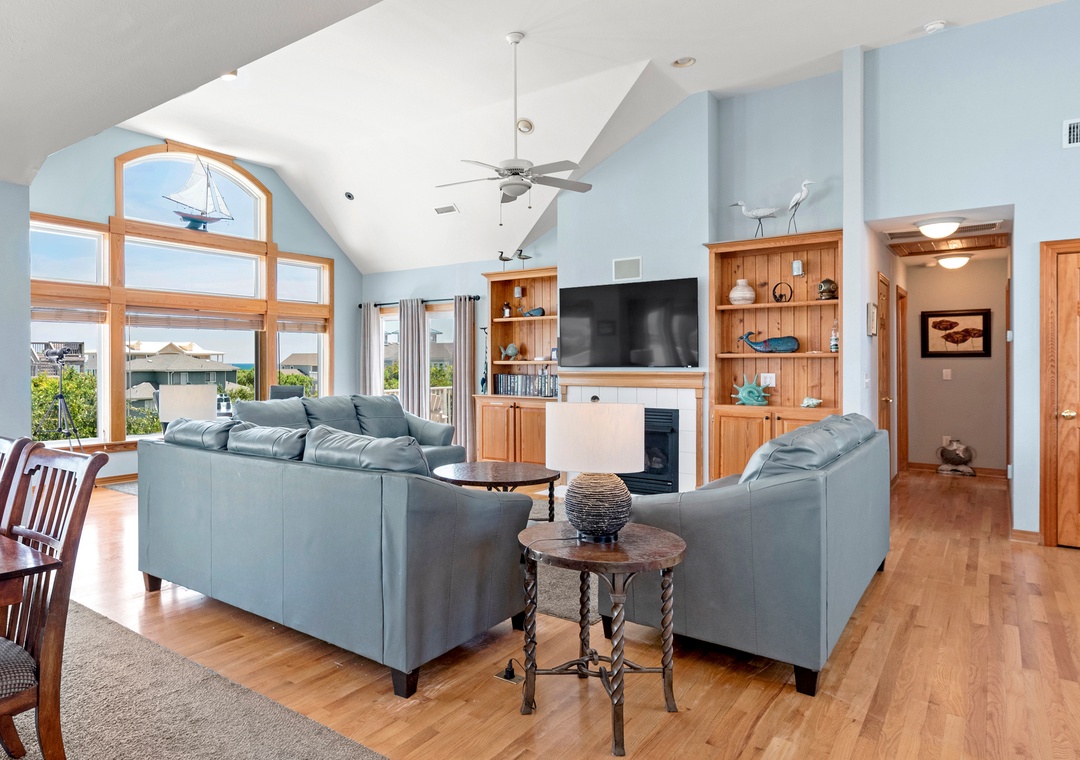 Step inside and be greeted by beautifully curated furnishings and spacious interiors that invite you to unwind. With seven king ensuite bedrooms, one queen ensuite bedroom with a wheelchair-accessible shower, an ensuite bedroom with two pyramid bunk beds, and an extra room with one pyramid bunk, everyone will find their perfect place to rest. The top floor boasts a sun-drenched open-concept living area with a gourmet kitchen, a dining table that seats 16, and a stylish great room with leather couches, a gas fireplace, and a 50” flat-screen TV. Step out onto the wraparound deck to enjoy ocean breezes from multiple seating areas.