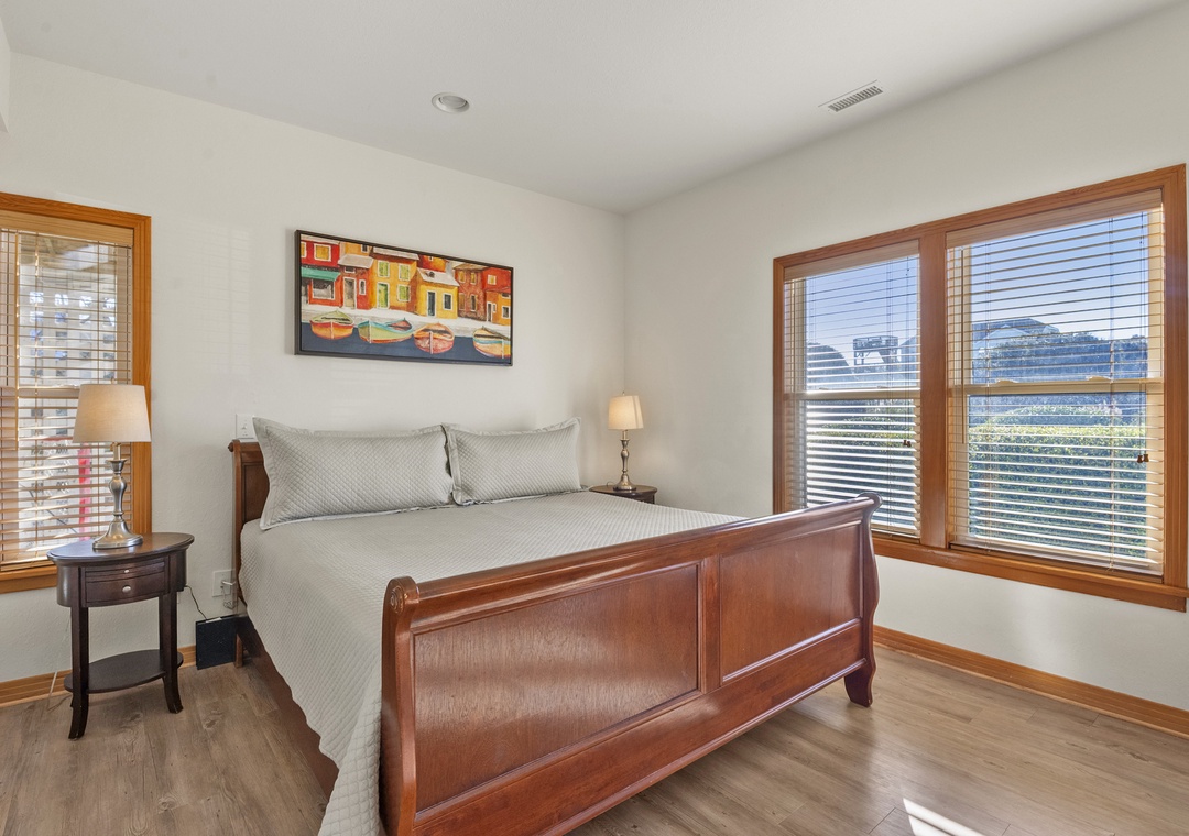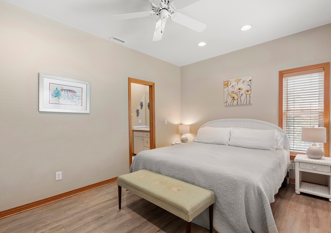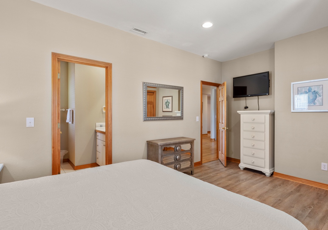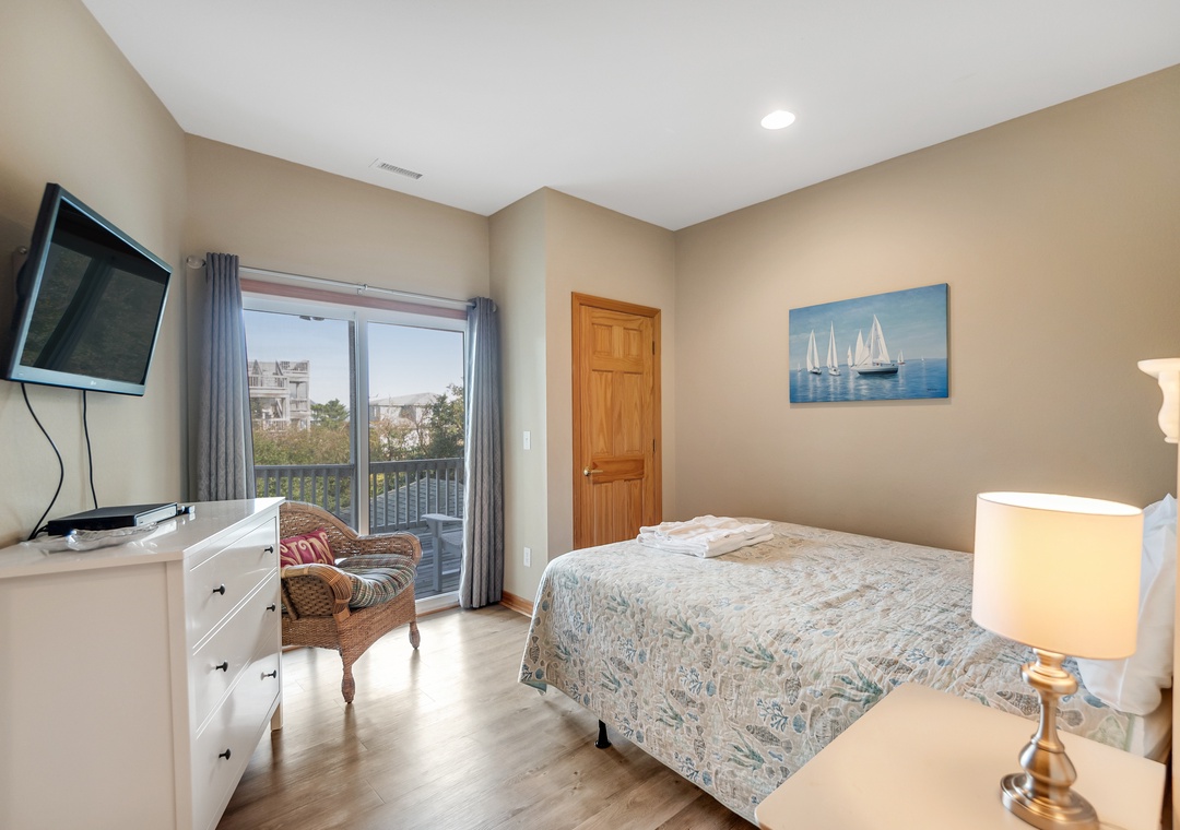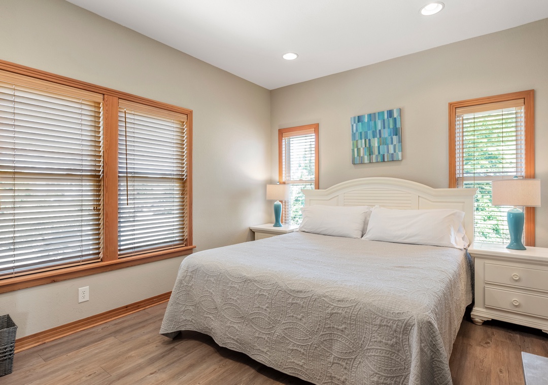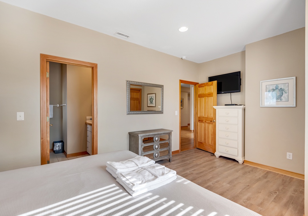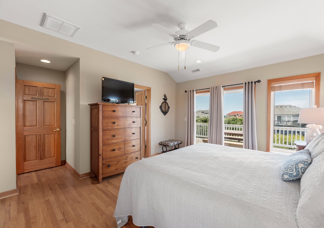 Step inside and be greeted by beautifully curated furnishings and spacious interiors that invite you to unwind. With seven king ensuite bedrooms, one queen ensuite bedroom with a wheelchair-accessible shower, an ensuite bedroom with two pyramid bunk beds, and an extra room with one pyramid bunk, everyone will find their perfect place to rest. The top floor boasts a sun-drenched open-concept living area with a gourmet kitchen, a dining table that seats 16, and a stylish great room with leather couches, a gas fireplace, and a 50” flat-screen TV. Step out onto the wraparound deck to enjoy ocean breezes from multiple seating areas.