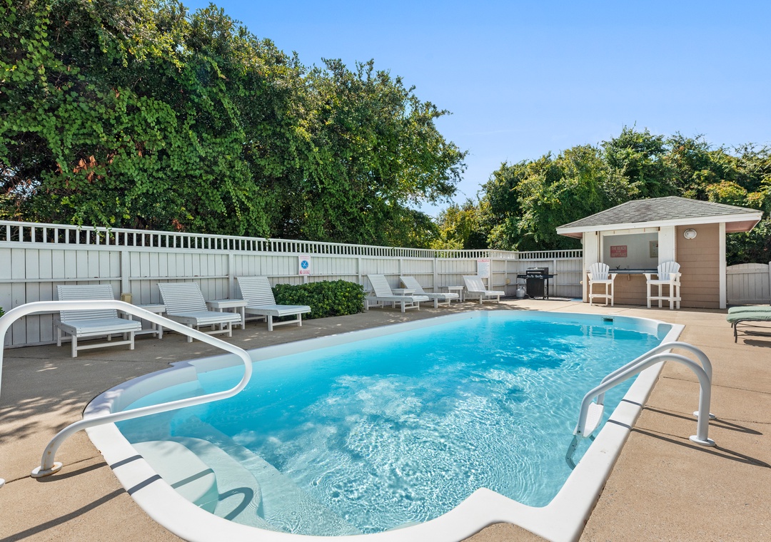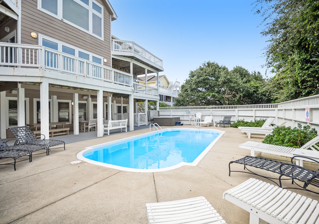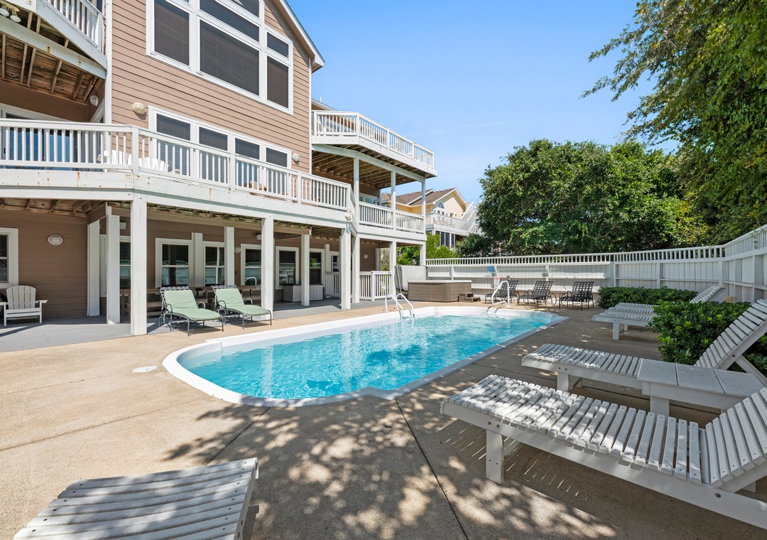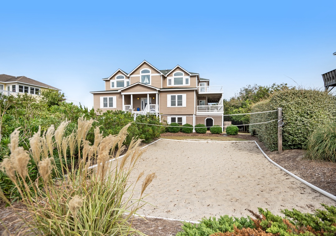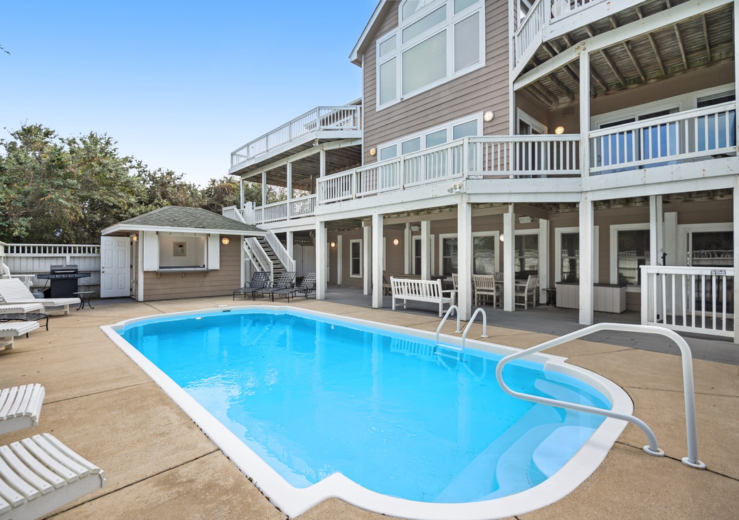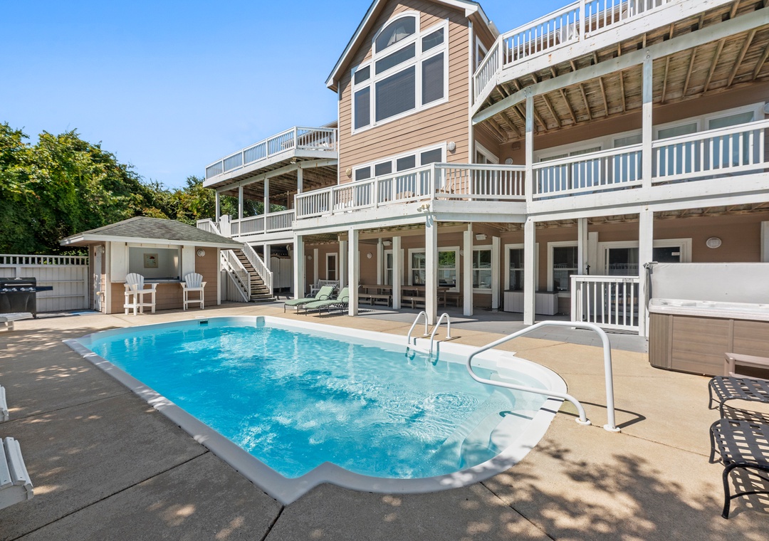 Outdoors, the private pool area is a true oasis. Lounge on one of 11 chaise lounges, soak in the poolside hot tub, or gather under the shaded tiki bar cabana, complete with a full kitchen, fridge, bar stools, picnic table, and an outdoor bathroom. Two outdoor showers, a gas grill, a charcoal grill, and a beach gear closet ensure every need is met. Sports lovers will enjoy the volleyball court, basketball hoop, soccer goal, and hockey net, all surrounded by a lush, sprinkler-maintained lawn.