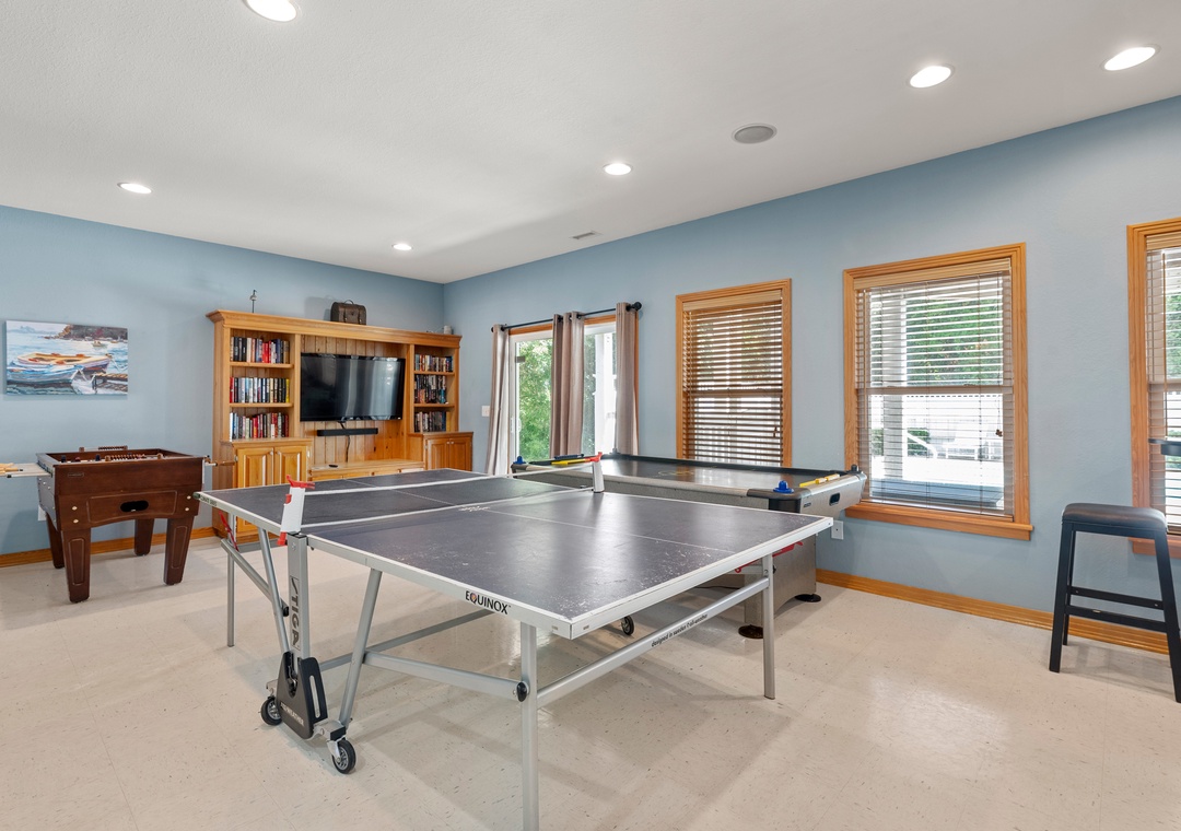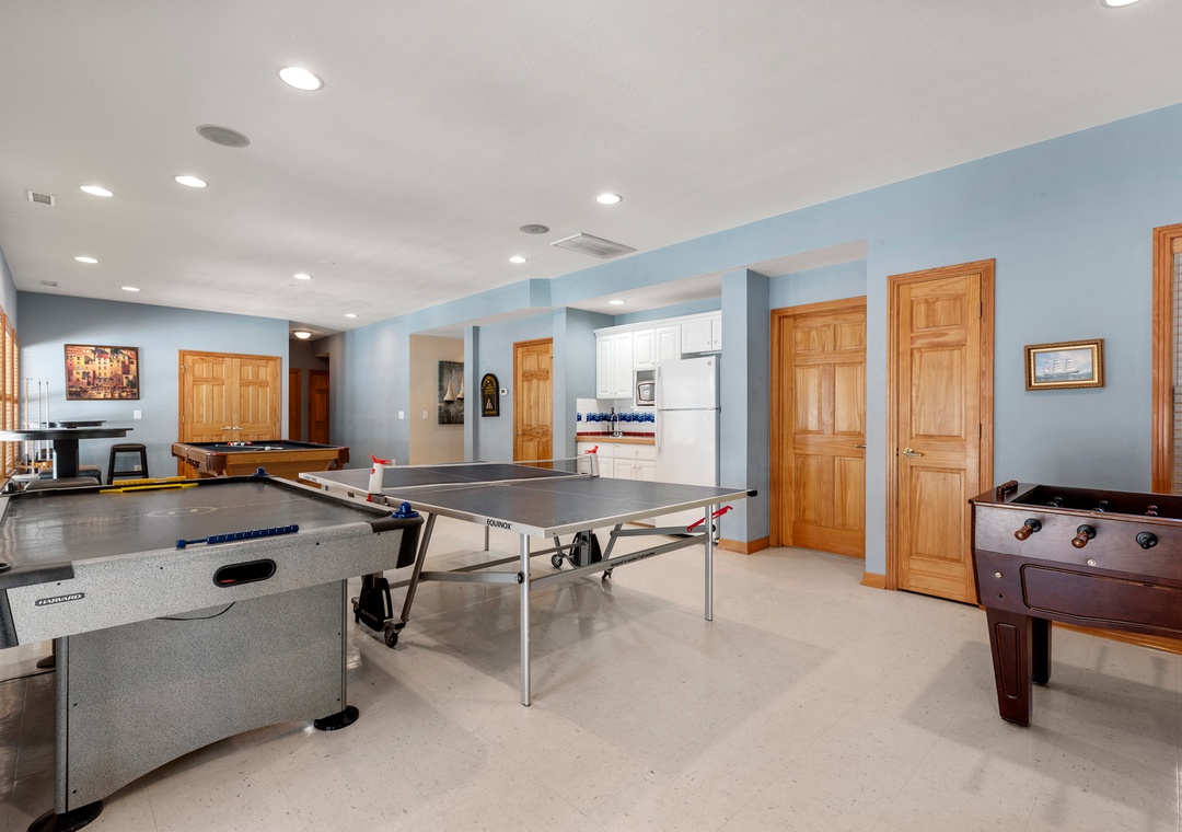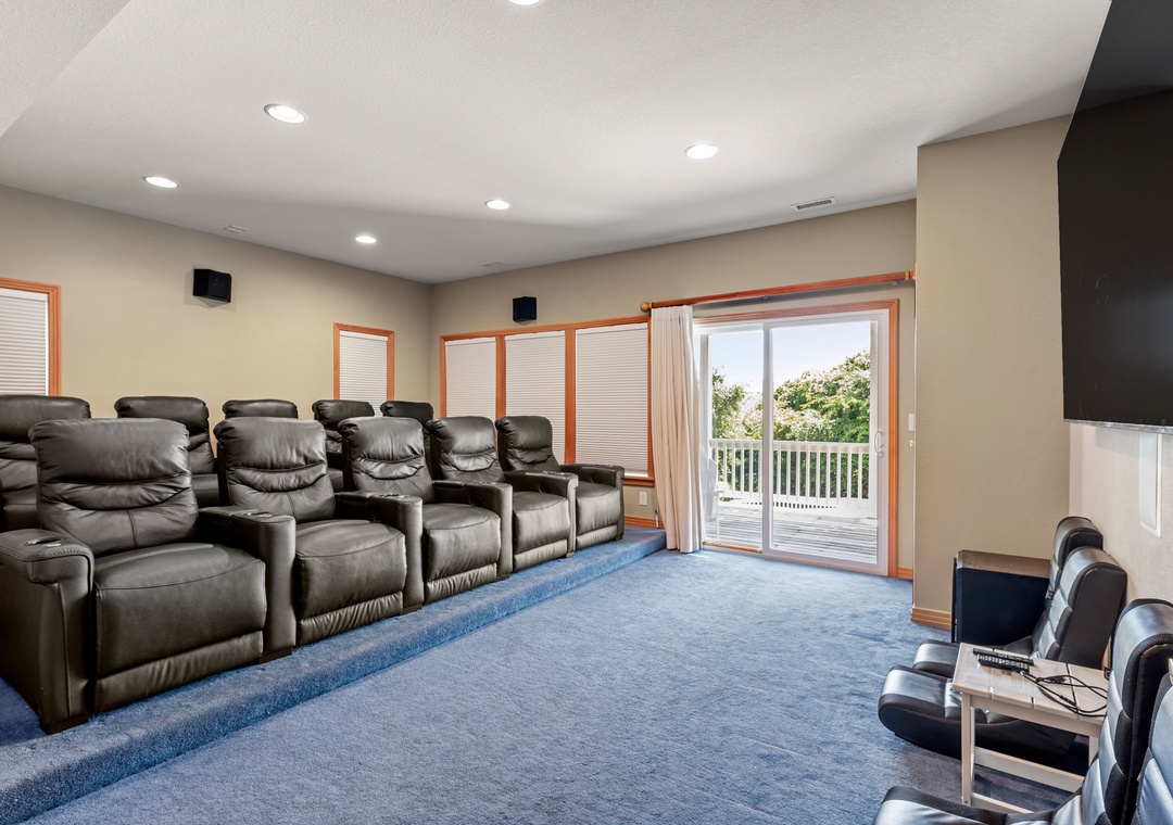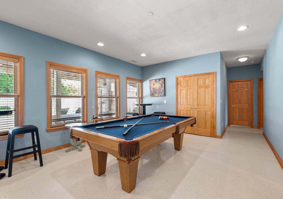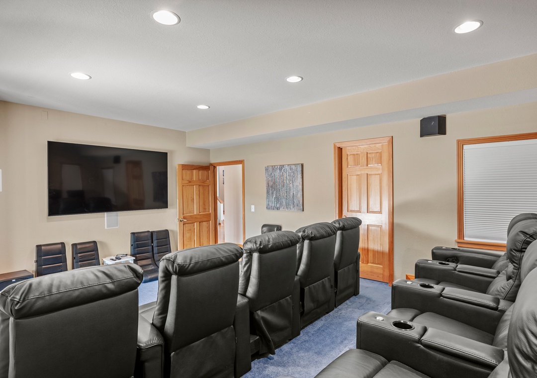 Entertainment abounds throughout the home. The expansive ground-level rec room is a haven for fun, featuring a tournament-size billiards table, ping pong, air hockey, foosball, a poker table, and a closet full of sports gear. A wet bar, kitchenette, large screen TV, and half bath make it easy to spend hours here. Movie nights are a treat in the theater room with leather recliners and a 70” TV with surround sound.