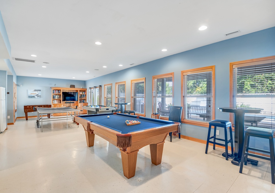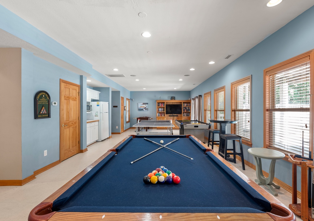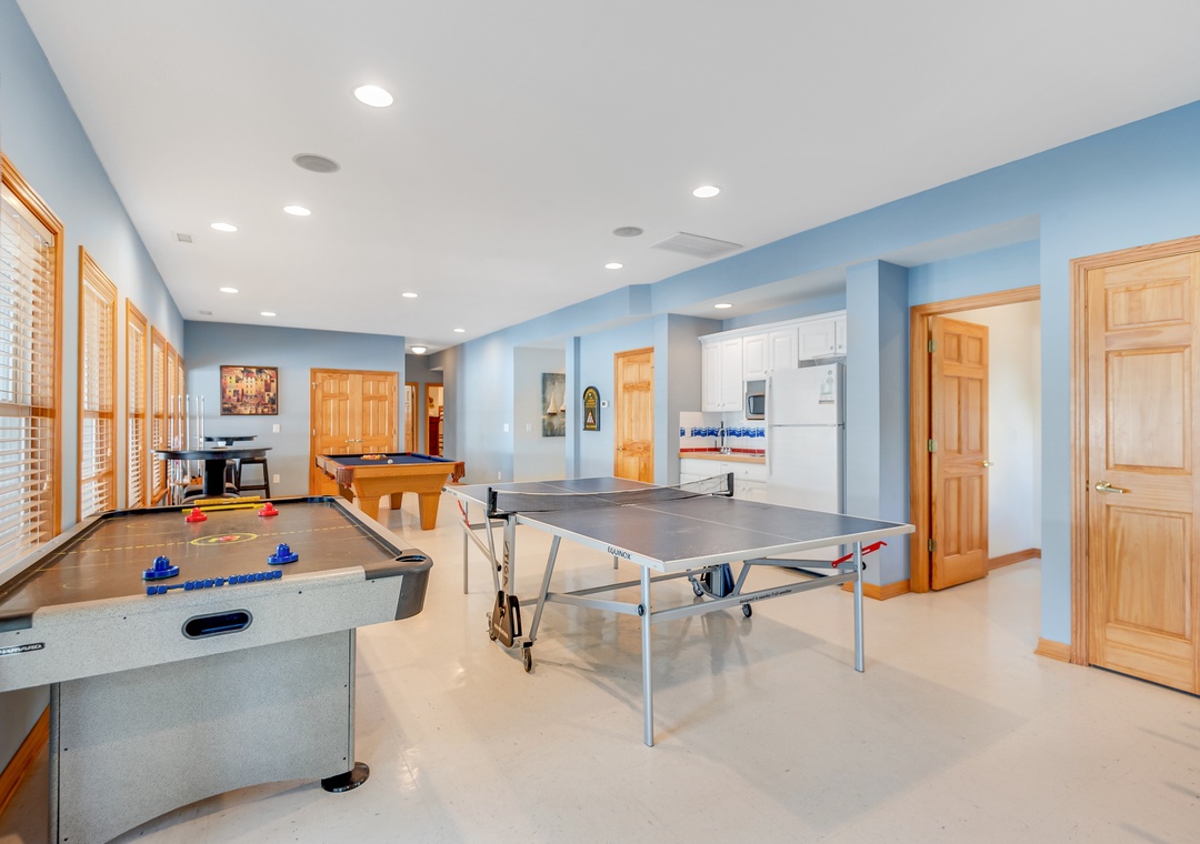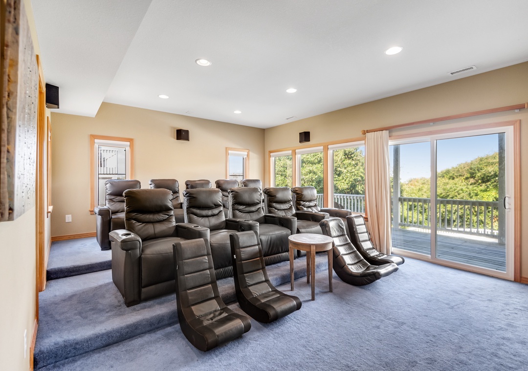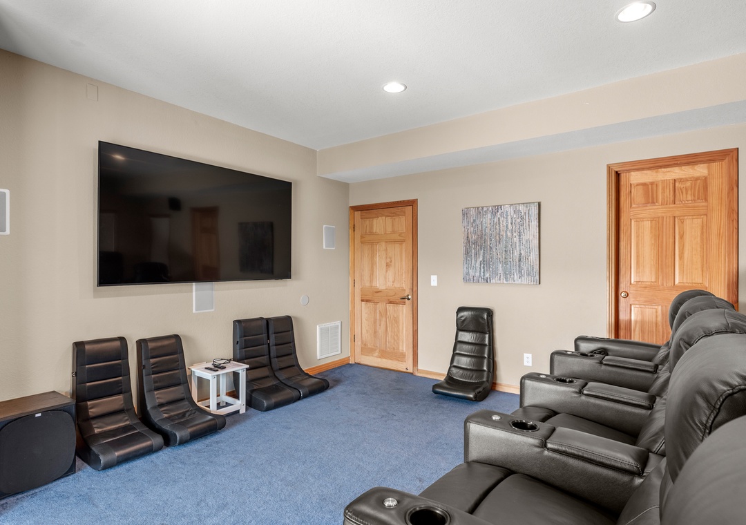 Entertainment abounds throughout the home. The expansive ground-level rec room is a haven for fun, featuring a tournament-size billiards table, ping pong, air hockey, foosball, a poker table, and a closet full of sports gear. A wet bar, kitchenette, large screen TV, and half bath make it easy to spend hours here. Movie nights are a treat in the theater room with leather recliners and a 70” TV with surround sound.