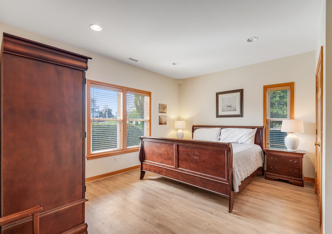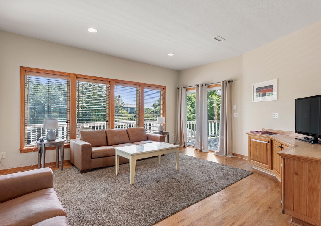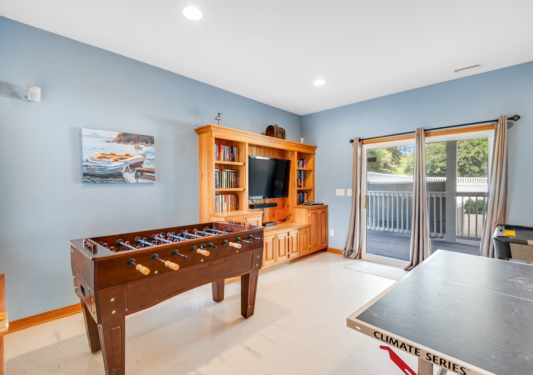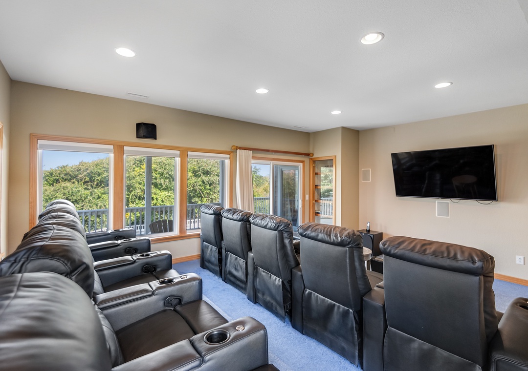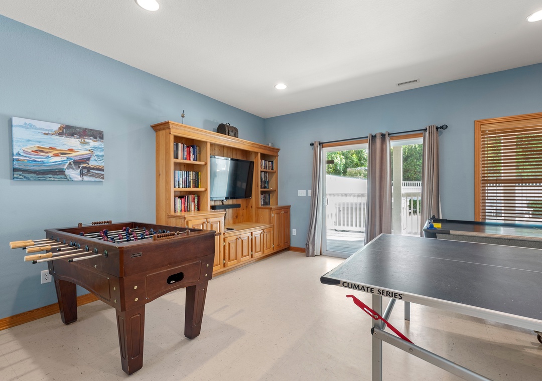 Entertainment abounds throughout the home. The expansive ground-level rec room is a haven for fun, featuring a tournament-size billiards table, ping pong, air hockey, foosball, a poker table, and a closet full of sports gear. A wet bar, kitchenette, large screen TV, and half bath make it easy to spend hours here. Movie nights are a treat in the theater room with leather recliners and a 70” TV with surround sound.