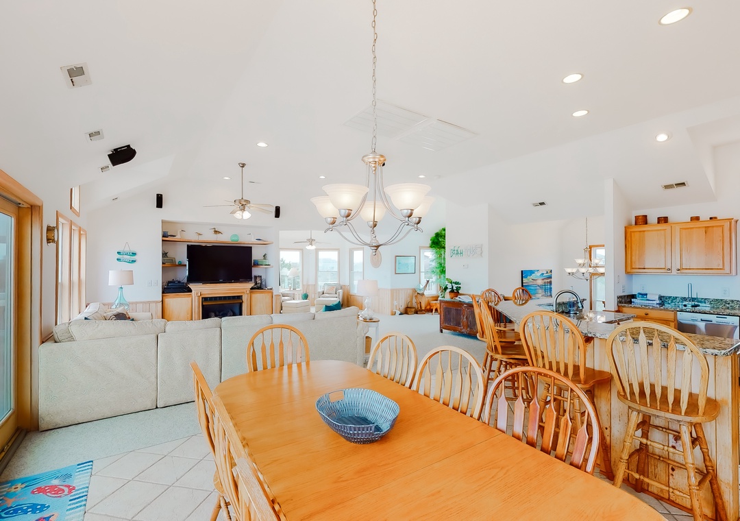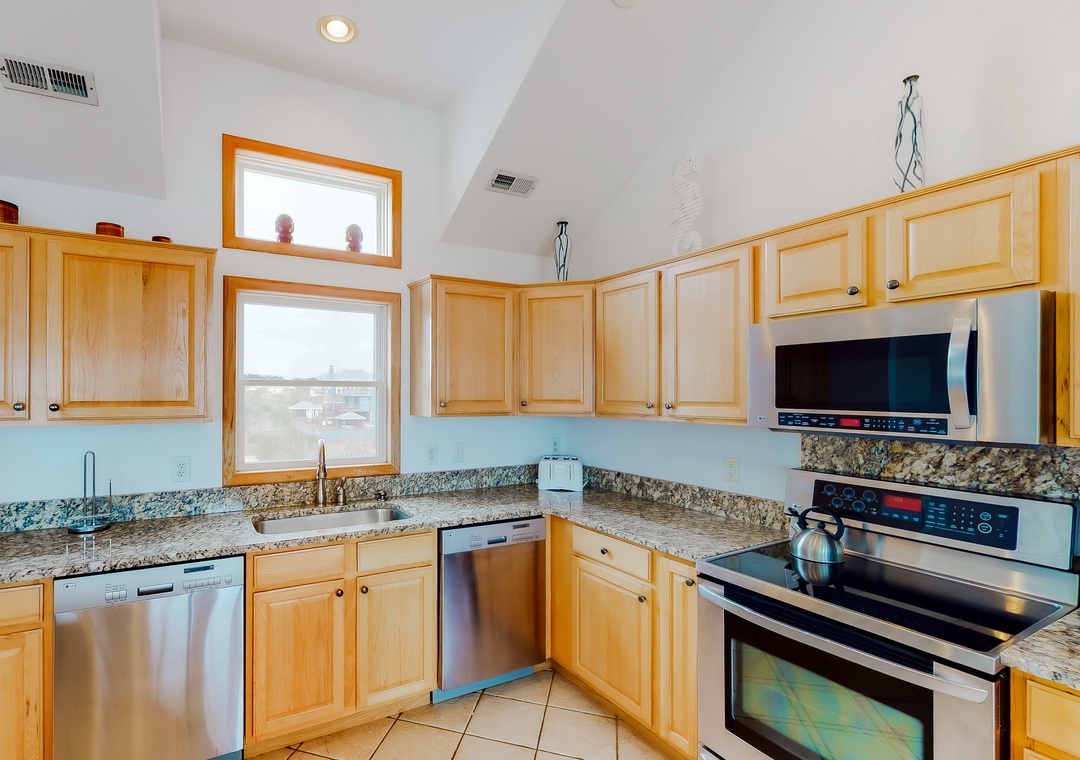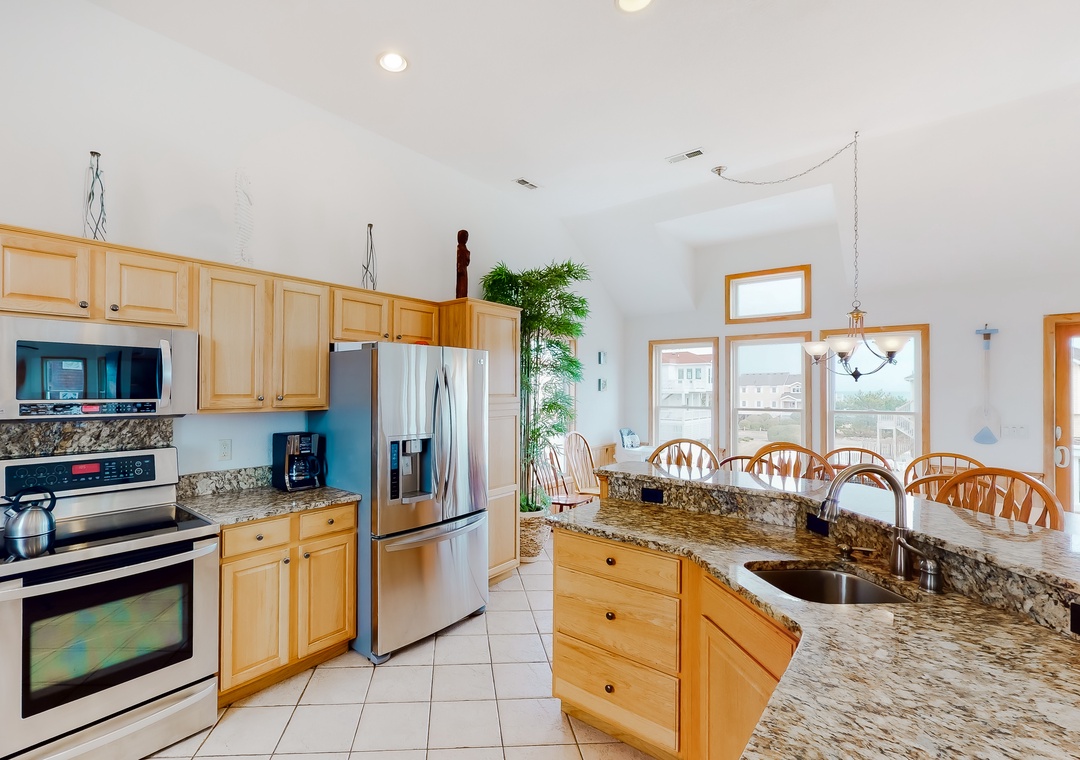 Top Level: Offers an expansive, open great room with 55 inch TV and separate sitting area. Outside, thru a sliding glass door, you'll enjoy the views from the oceanside decks with crow's nest deck located on the southeast corner. The gourmet kitchen has granite countertops, stainless steel appliances and dual dishwashers. There is a large dining table that seats 10 and seating for 7 more at the kitchen bar. Rounding out this level is a half bath just off the great room.