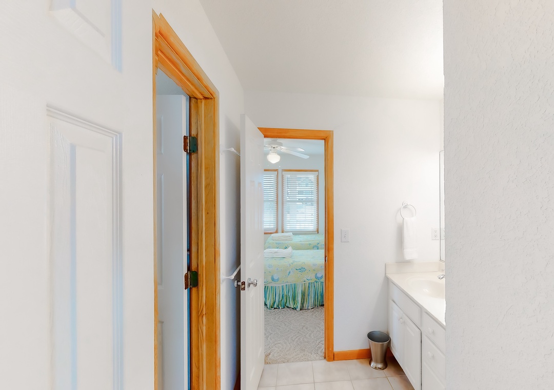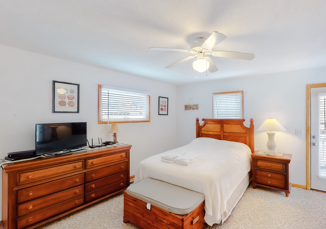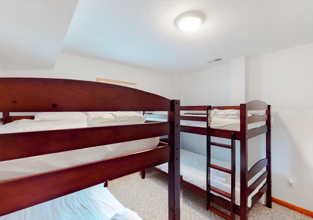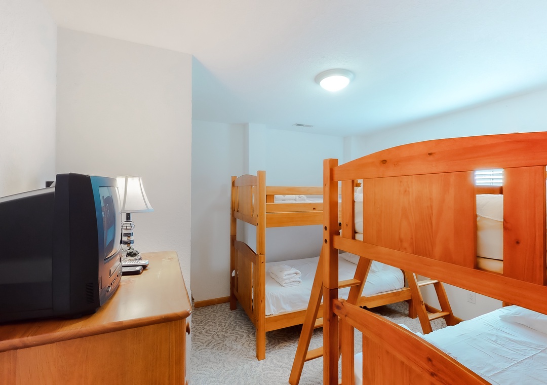 Mid Level: This level is home to 4 bedrooms...a Queen master with TV/DVD, another Queen master with TV and deck access and a bedroom with TV & deck access that shares a full bath with a room that has 2 Singles with TV/DVD and deck access.