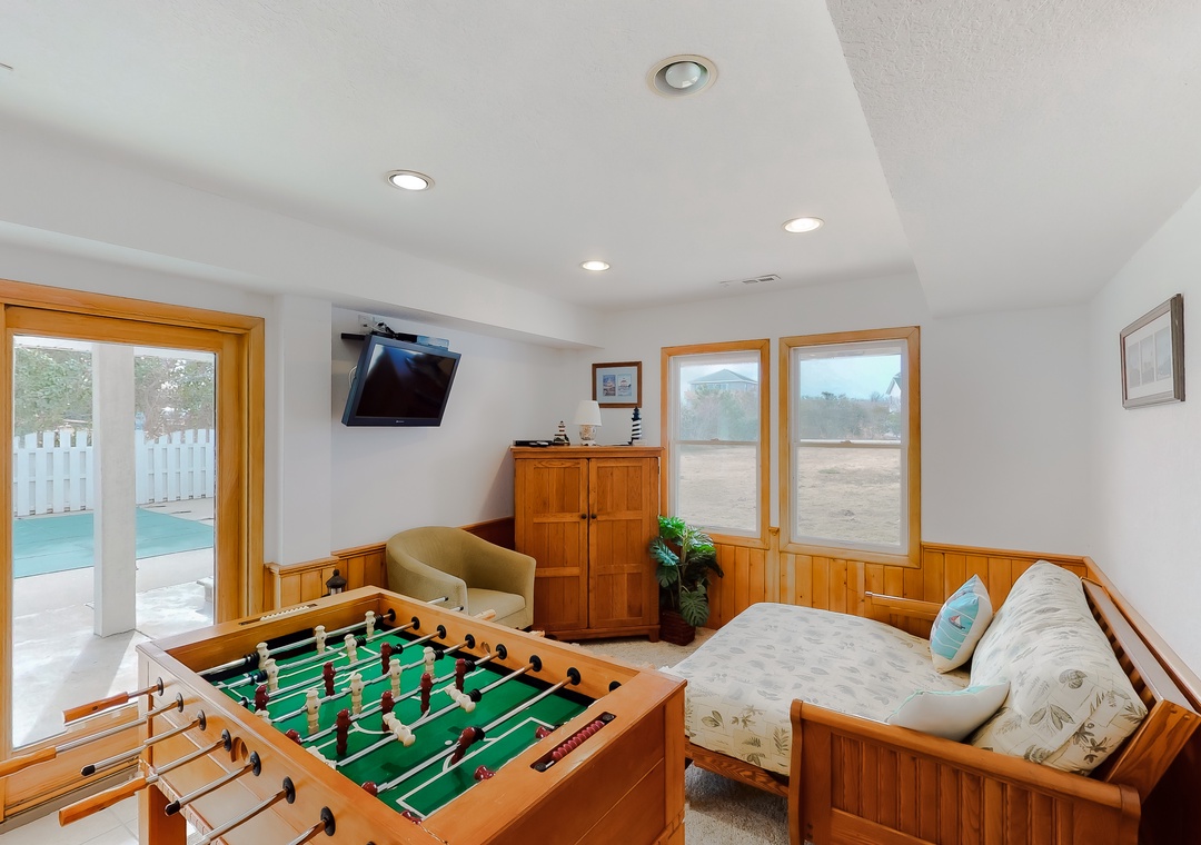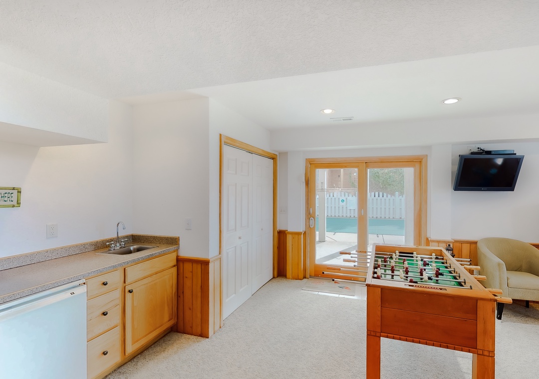 Ground Level: Features a rec room with foosball table, a 32 inch TV, wet bar with mini fridge and a sliding glass door to the pool area. You will also find a Futon sleeper in the rec room. There are two bedrooms on this floor, each with 2 Bunk Sets and a TV that share a full bathroom. Step outside and enjoy the private pool and a hot tub that sits under a covered deck.
