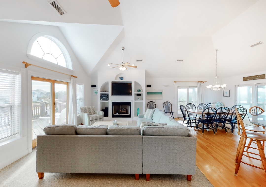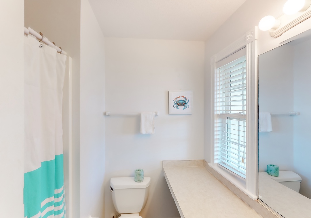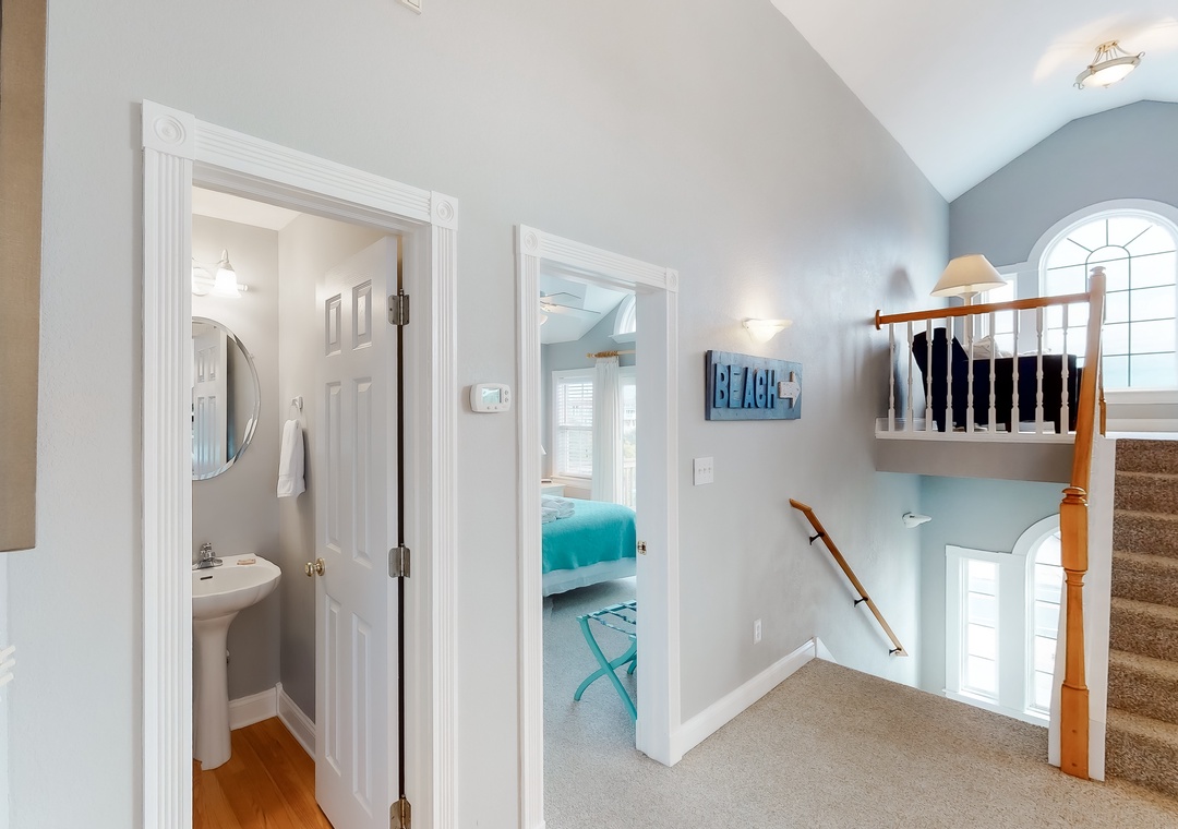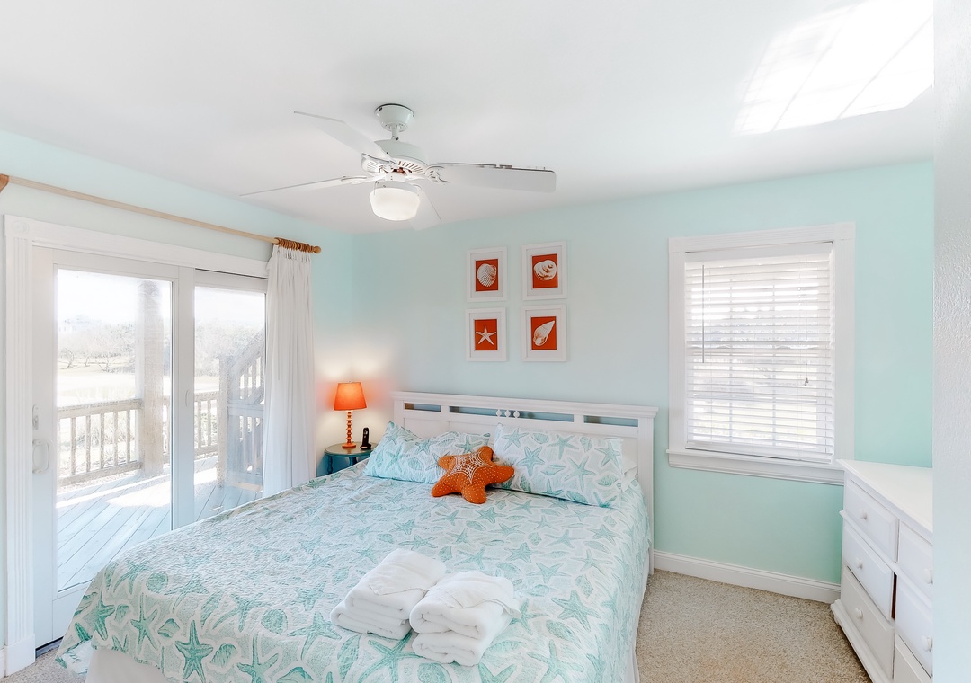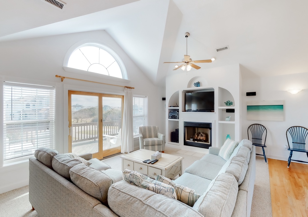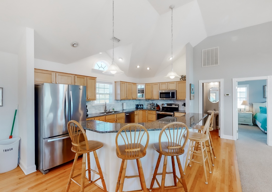 Top Level: The top level features the great room that offers a TV/DVD, CD/Stereo, and a gas fireplace. Just off the great room is the kitchen and dining area. The dining area seats 10, with 4 additional seats at the kitchen bar. Step up a bit and enjoy the ship's watch, or step outside to the large screened porch, the perfect place for those family seafood feasts! Rounding out this level is a half bath off the great room, a lovely King main bedroom, and a rooftop crow's nest deck for taking in the views!