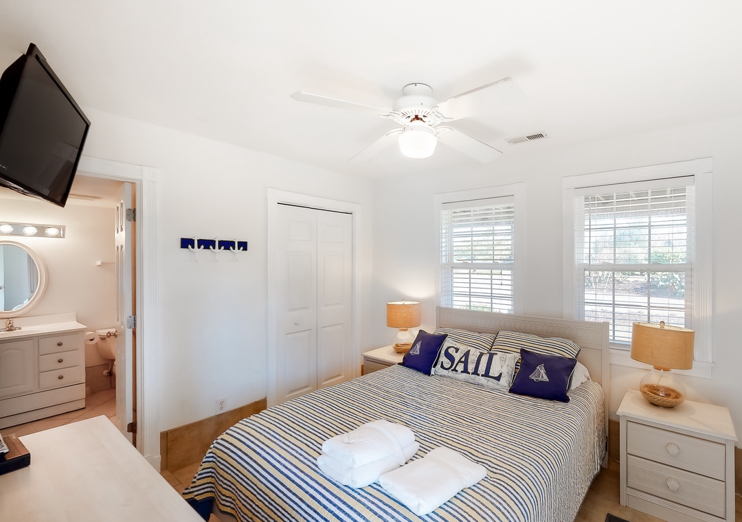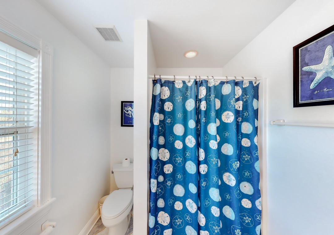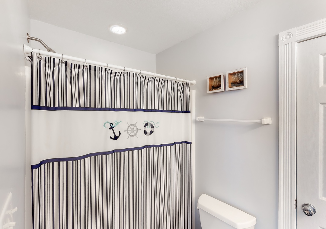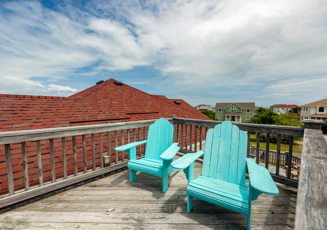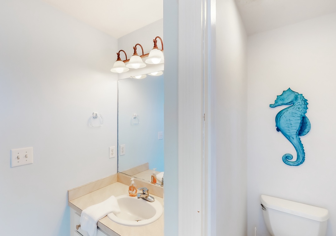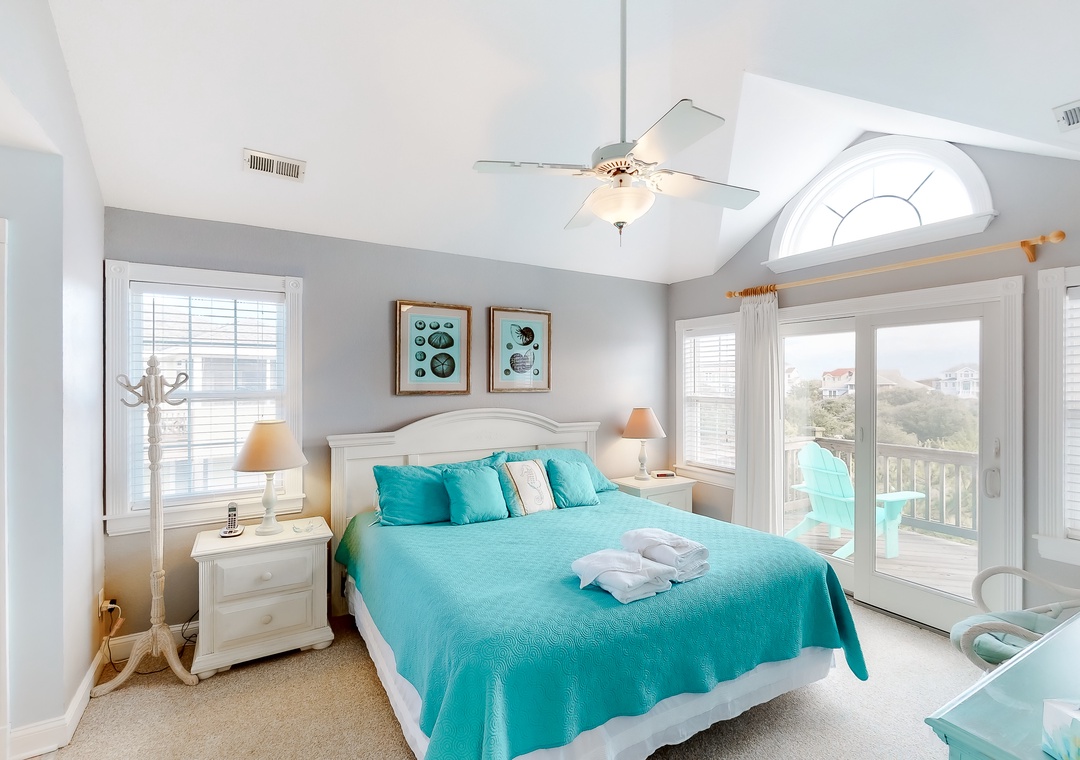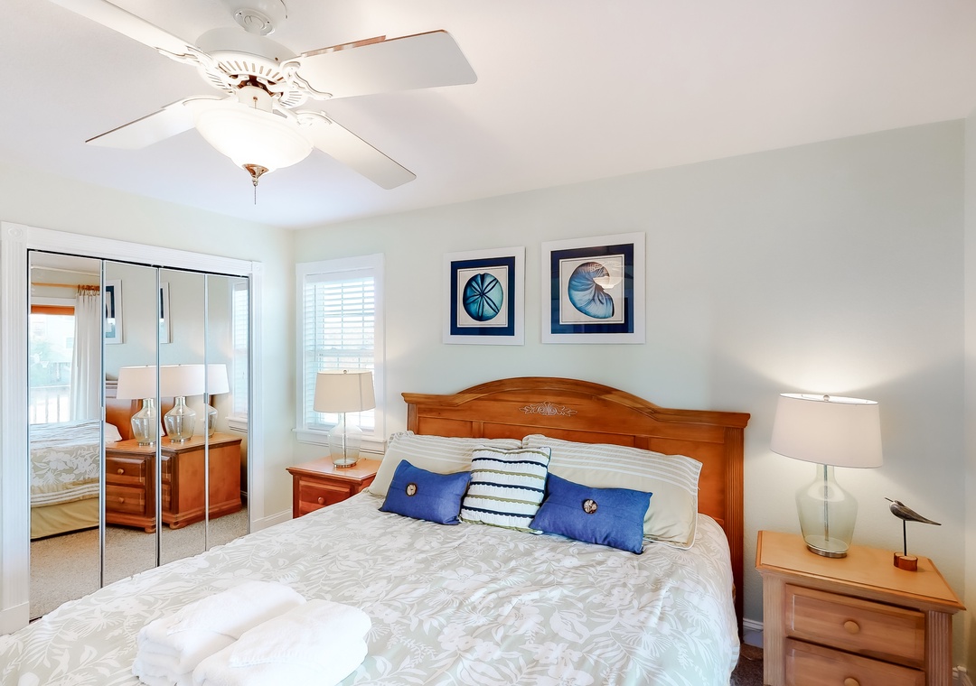 Top Level: The top level features the great room that offers a TV/DVD, CD/Stereo, and a gas fireplace. Just off the great room is the kitchen and dining area. The dining area seats 10, with 4 additional seats at the kitchen bar. Step up a bit and enjoy the ship's watch, or step outside to the large screened porch, the perfect place for those family seafood feasts! Rounding out this level is a half bath off the great room, a lovely King main bedroom, and a rooftop crow's nest deck for taking in the views!