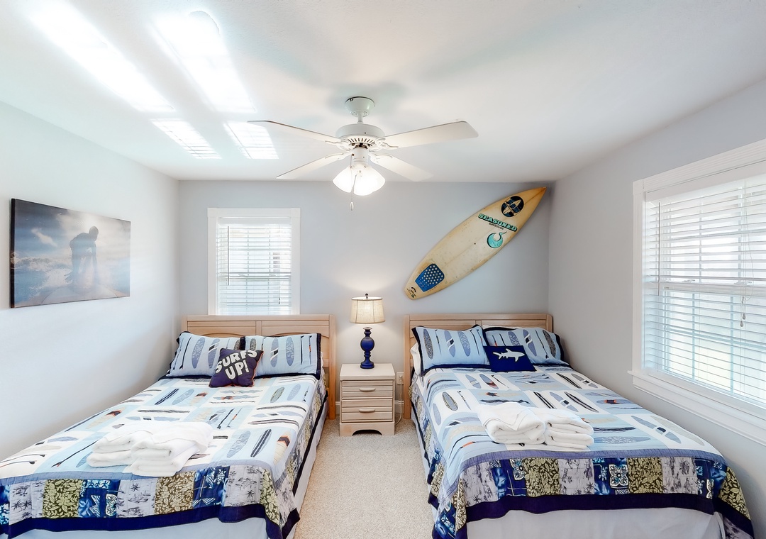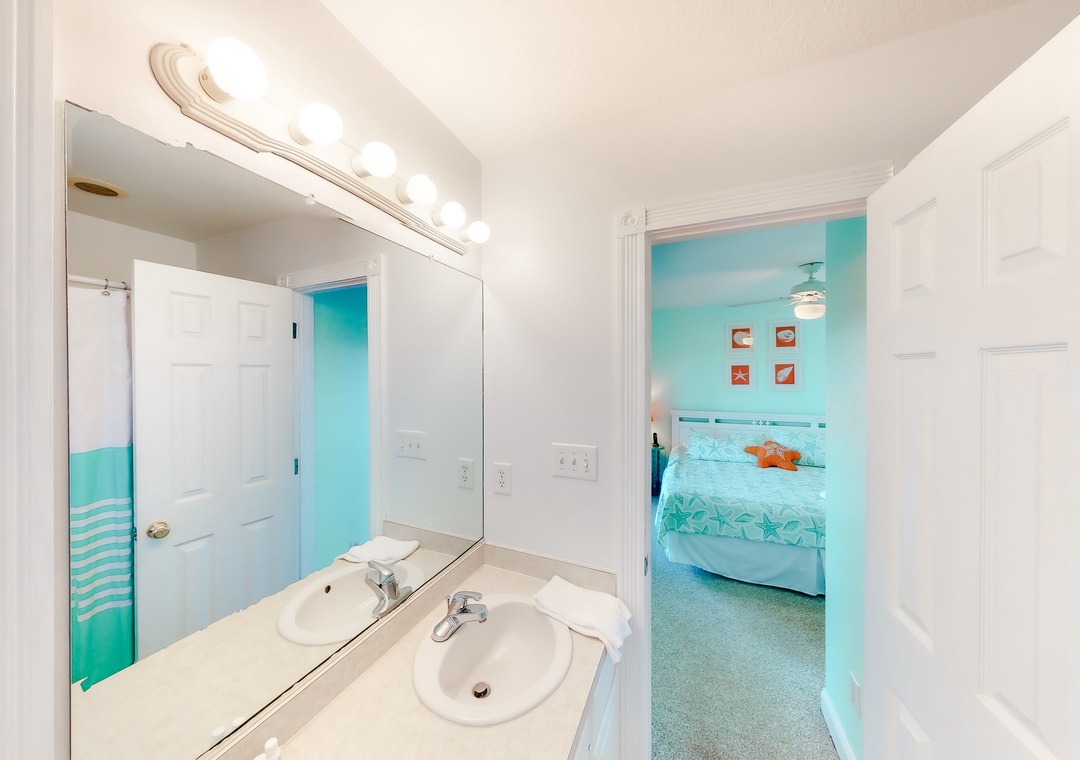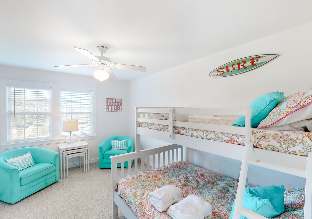 Mid Level: Here you will find 2 King main bedrooms, each with a TV. There is also a room that offers 2 Double beds, a TV, and a shared bath with another room sporting a DuoBunk and Trundle, and a TV.