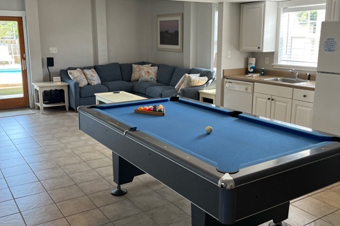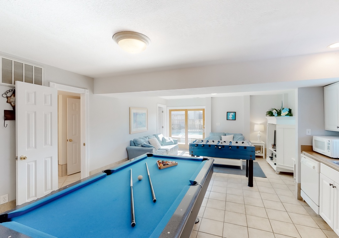 Ground Level: This level sports the rec room including a pool table, foosball table, TV/DVD, CD/Stereo, and kitchenette with a full size fridge and dishwasher. You'll also find a bedroom with a TV that shares a full bath with the rec room. Step outside, and you can take a dip in your own private pool.