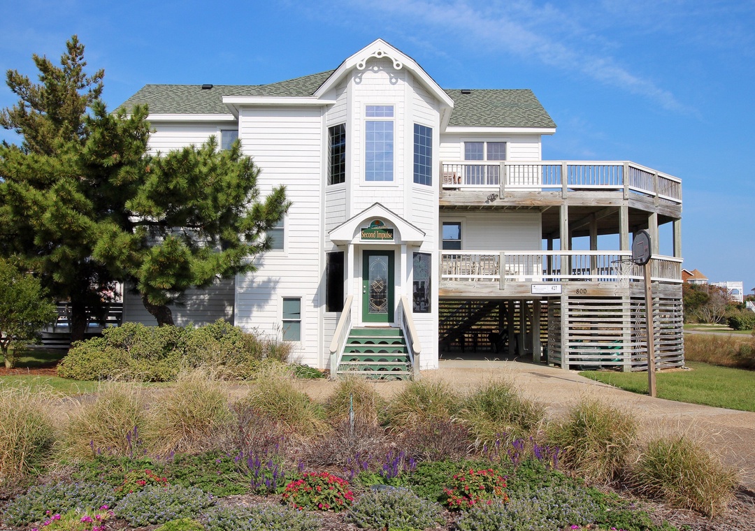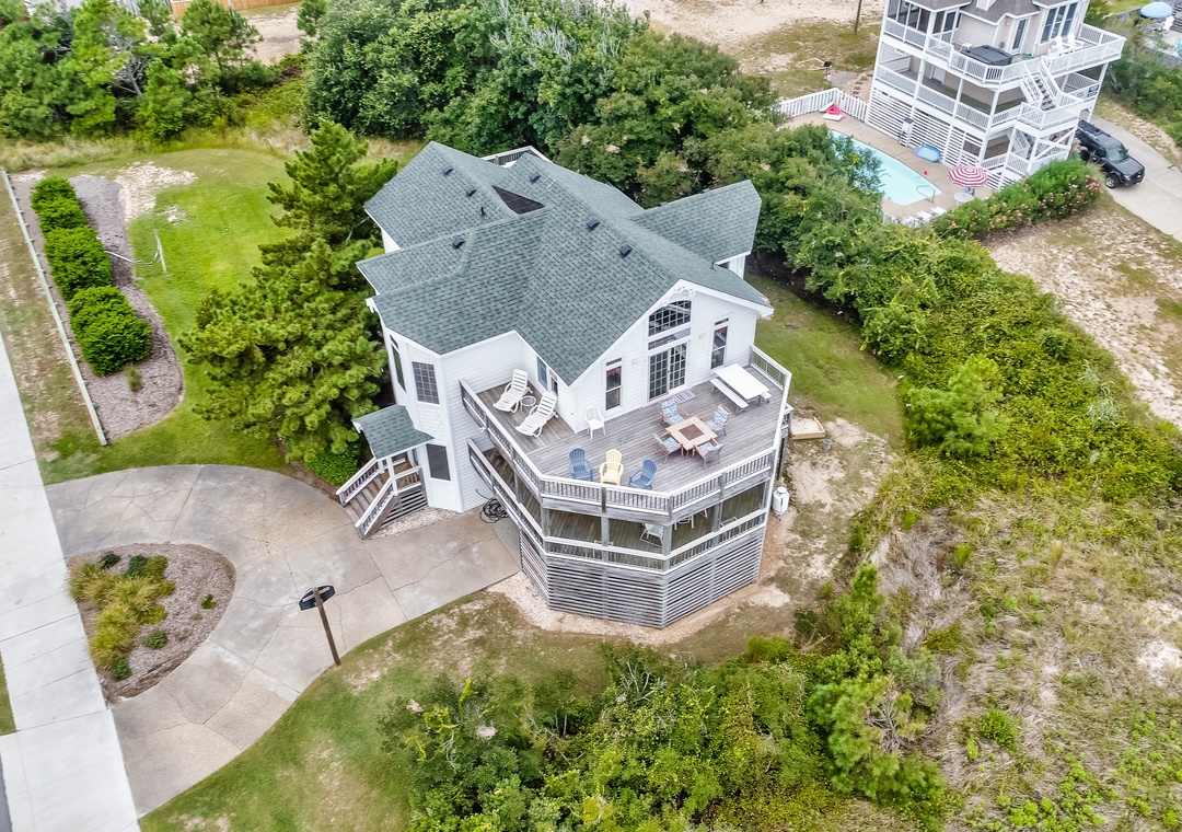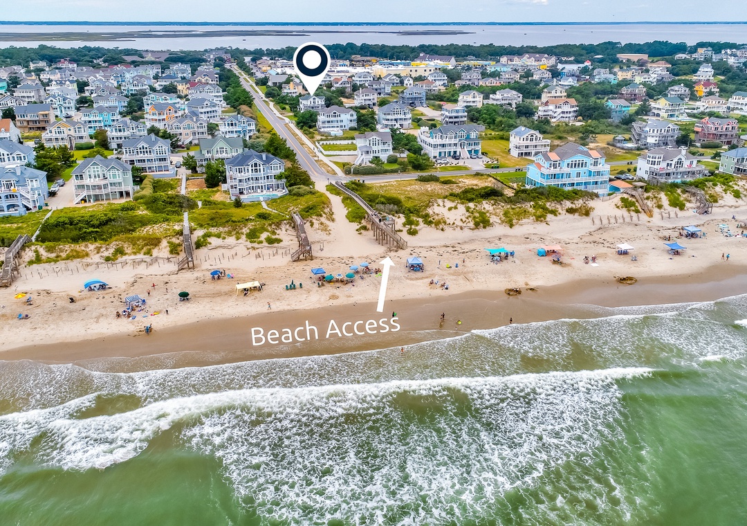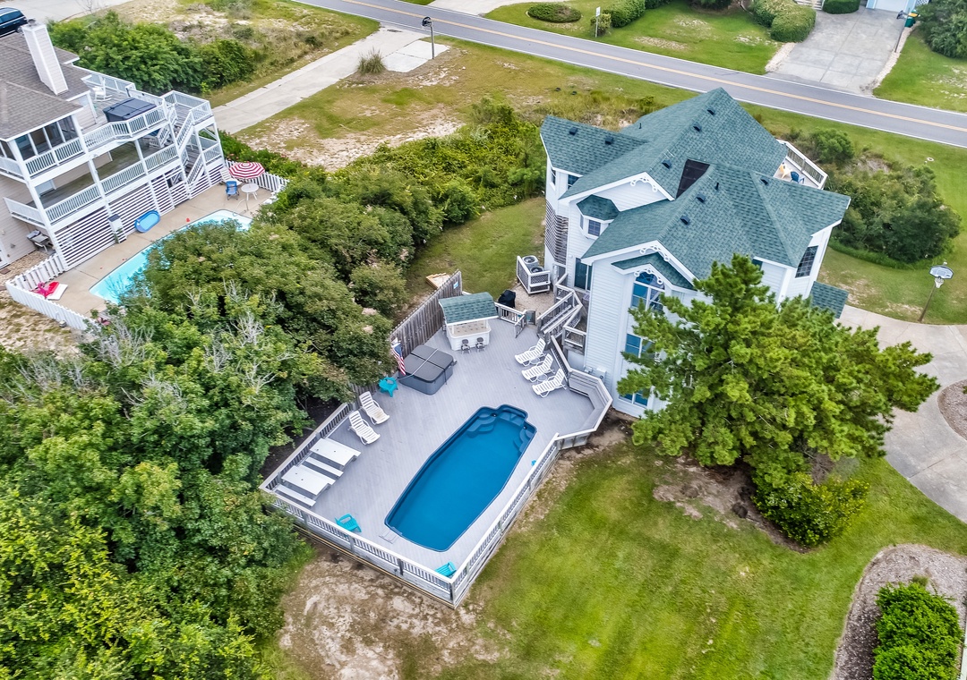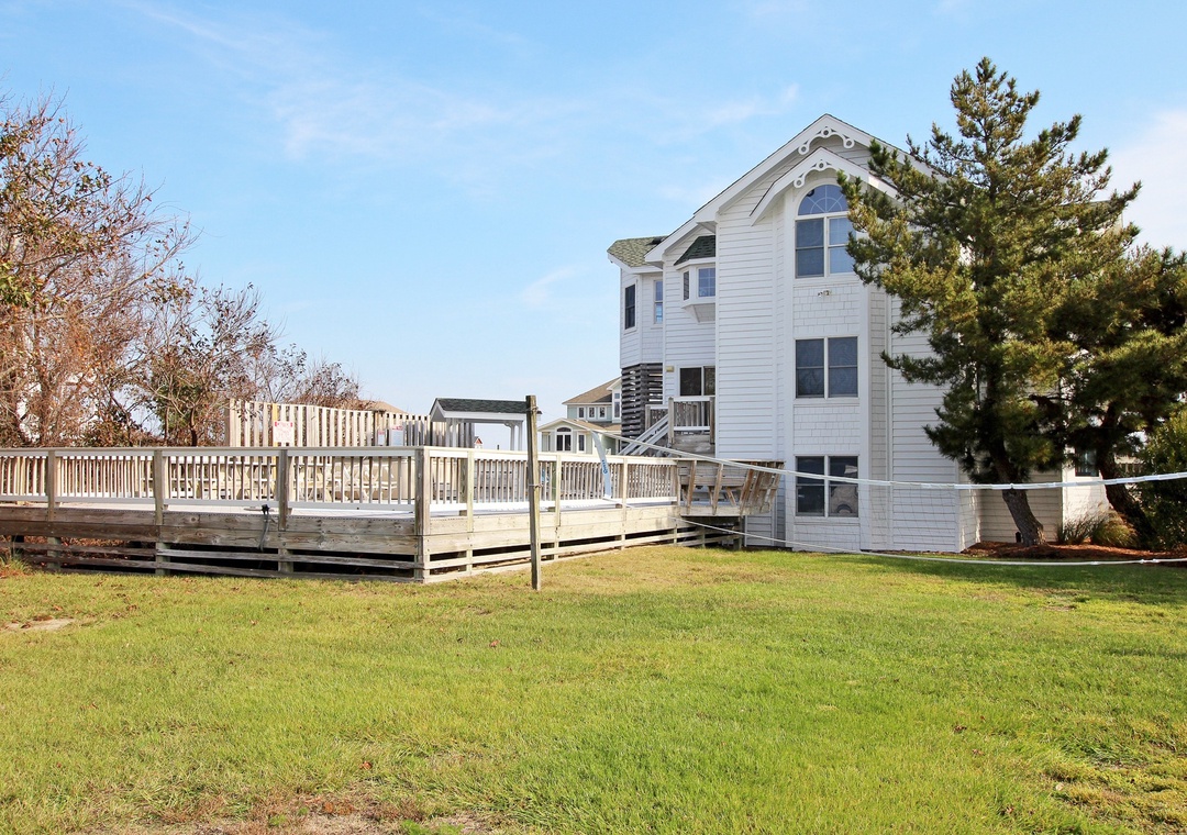 This corner lot home with beach access just a few steps away is conveniently located to shopping, swimming, and dining. Enjoy the pool with afternoon sun, large decks, poolside refrigerator, bar, BBQ area with one gas grill, two charcoal grills, and lighted volleyball area. Landscaping and lawn areas for playing are added delights. It's just 550 feet to the beach access. Check out the awesome views from the huge deck!!