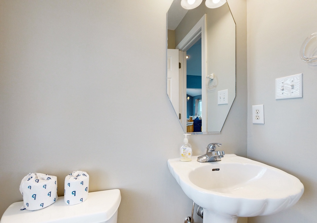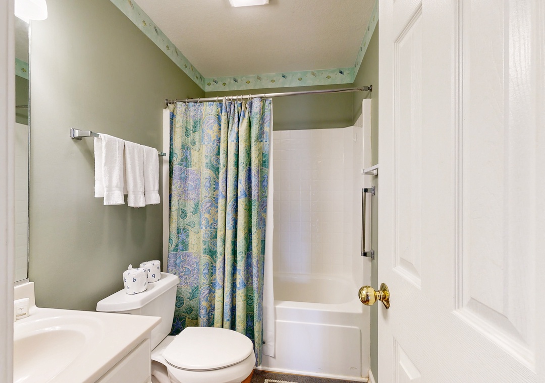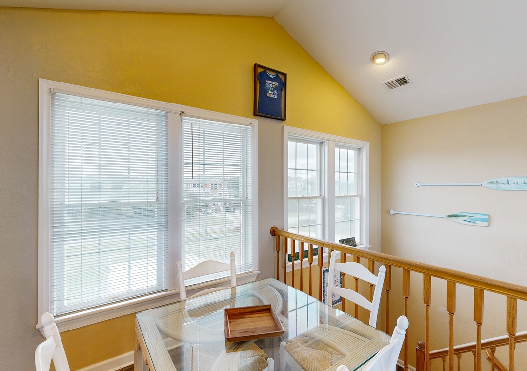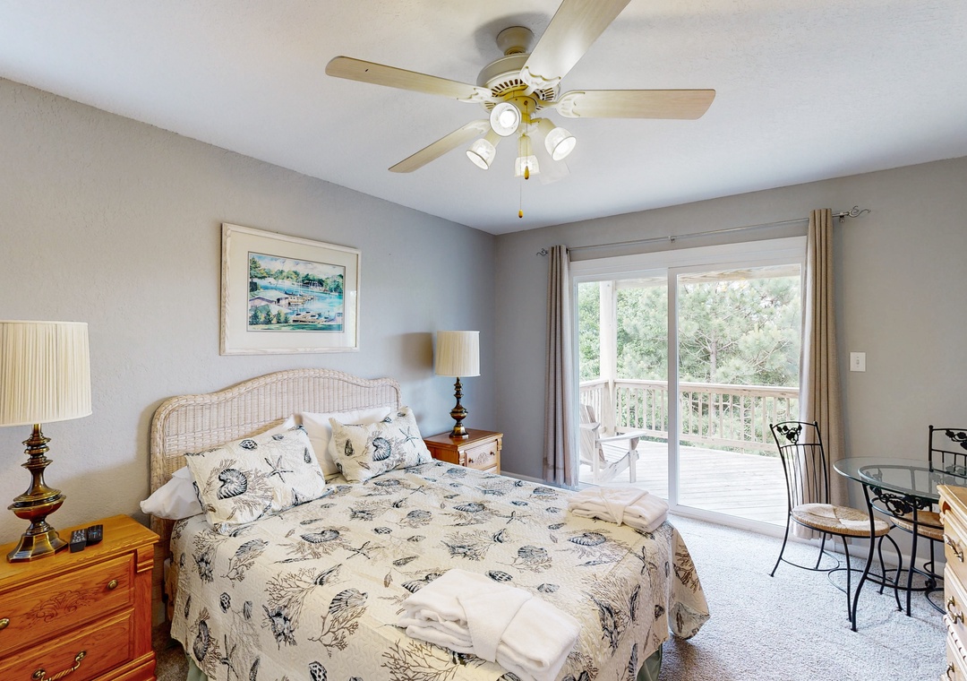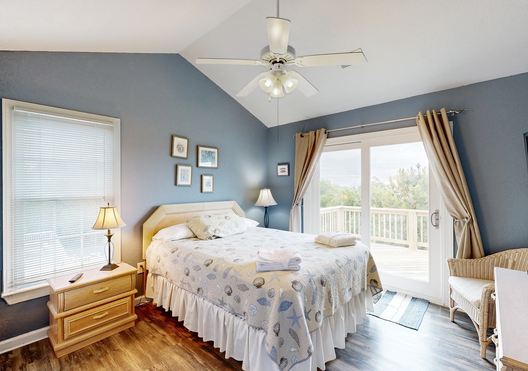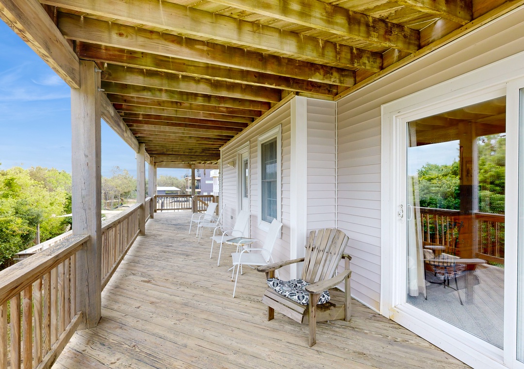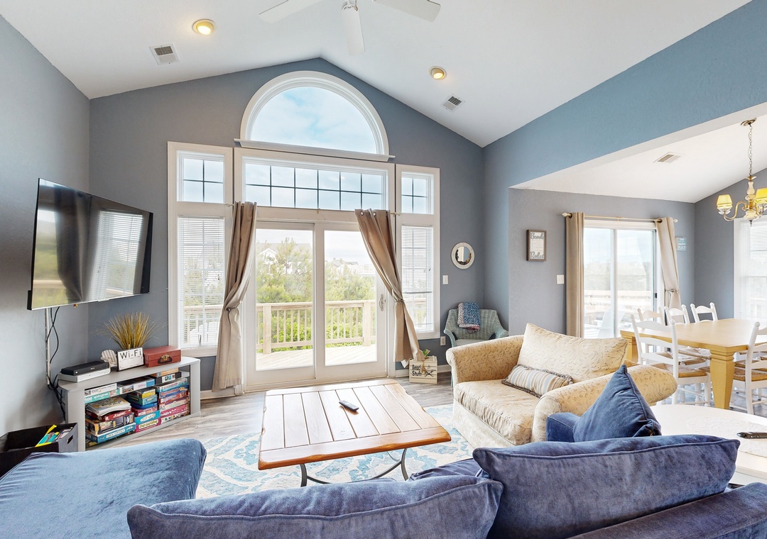 Top Level: Queen primary bedroom with Deck Access and Ocean Views, Spacious Great Room with Ocean Views, Vaulted Ceilings and Deck Access, Dining Area with seating for 8, Kitchen with seating for 6 at the counter, Breakfast Table with seating 4, Half Bathroom, Deck with Table and Built-in Bench Seating.