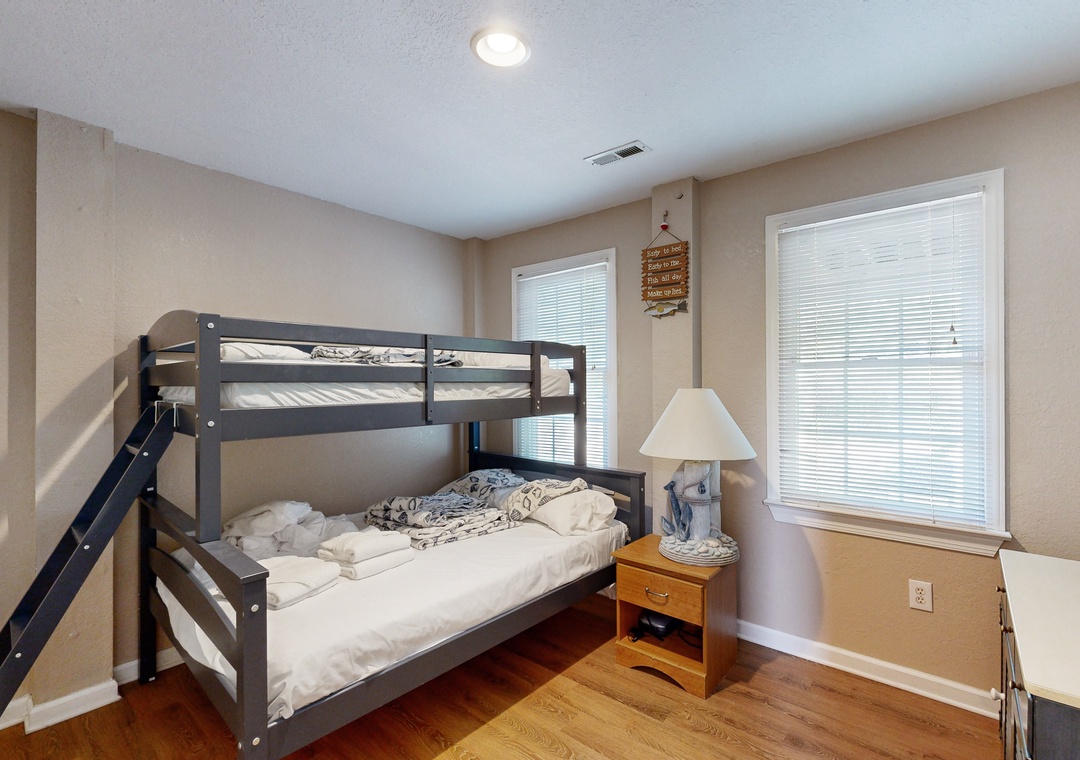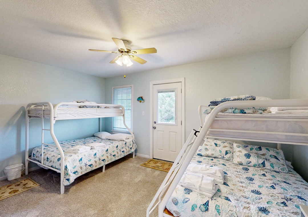 Mid Level: Entry, Queen primary bedroom with DIRECTV, DVD Player, and Deck Access, Bedroom with 2 Duo Bunks with TV/DVD player and Deck Access, Queen Bedroom with DIRECTV and Deck Access, Bedroom with 2 Twins with TV/DVD player, Hall Bath.