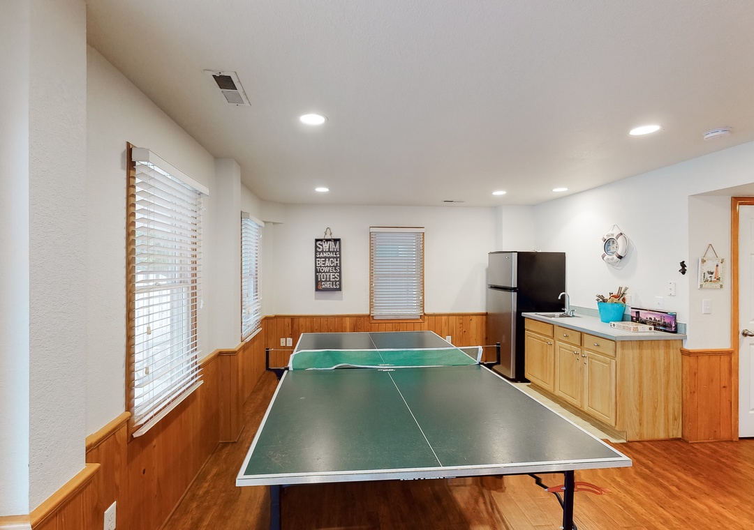 Ground Level: This floor features a very large rec room with a Ping-Pong table, wet bar with bar fridge, big-screen TV, stereo and a semi-private main bedroom with a king bed. The pool and hot tub are accessible from the rec room.