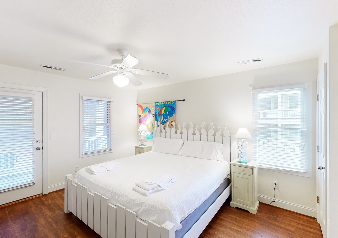 Top Level: This floor features a great room with a TV, stereo, kitchen, living and dining areas, powder room, and a main bedroom with a king bed King and a private deck.