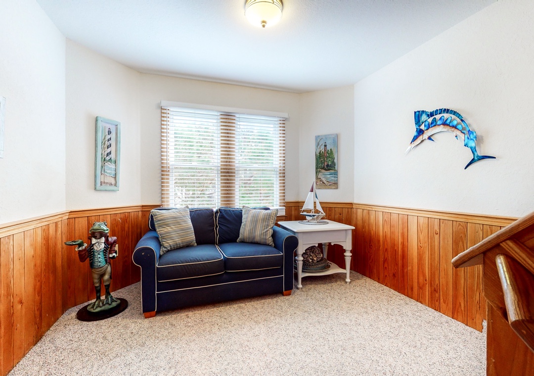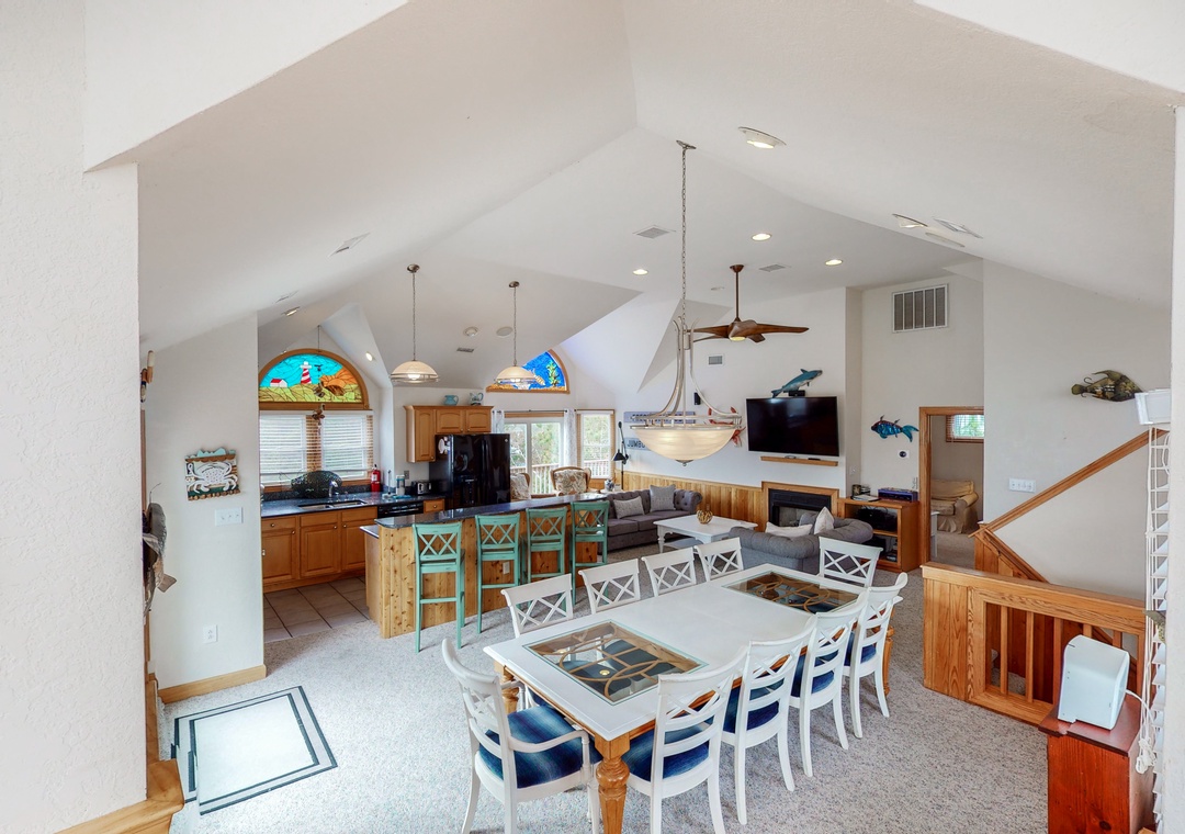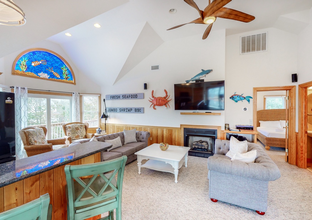 The top level features the coastally appointed great room with 36' TV with Blu-Ray player, surround sound, and gas fireplace. The well-appointed kitchen offers granite counters, double dishwashers and a breakfast bar. A separate dining area provides table seating and there's an elevated dining area with more seating. Just off the great room is a half bath. Up a half-level is an elevated ship's watch for reading or relaxing. Rounding out the inside of this lovely home is a main bedroom with a jetted tub, TV, and private deck access. Outside you can take in 360-degree views of Corolla from the crow's nest deck or simply enjoy relaxing on the top-level deck overlooking the pool.