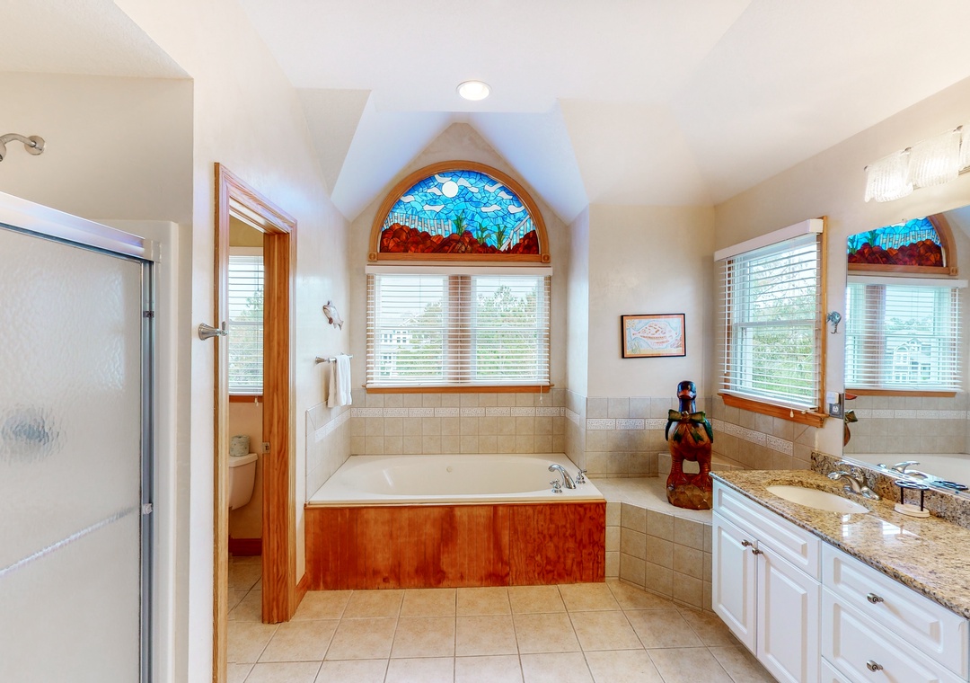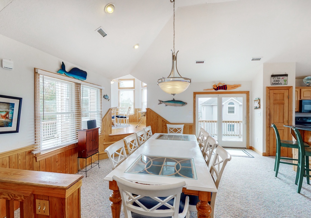 Spacious and coastally decorated, Pelican Pines invites you to lounge and enjoy the perfect beach vacation. Complete with custom-made stained glass arch windows, this home offers multiple places to spread out, including two family rooms, a spacious pool area, and a crow's nest deck to maximize your viewing pleasure! If you are looking for privacy, Pelican Pines provides seven primary bedrooms, all with private bathrooms! You are only a few minutes walk from the Atlantic Ocean and the wide, sandy beaches of Whalehead and shopping & entertainment are also just minutes away. Come enjoy a week in Pelican Pines, you won't want to go home!