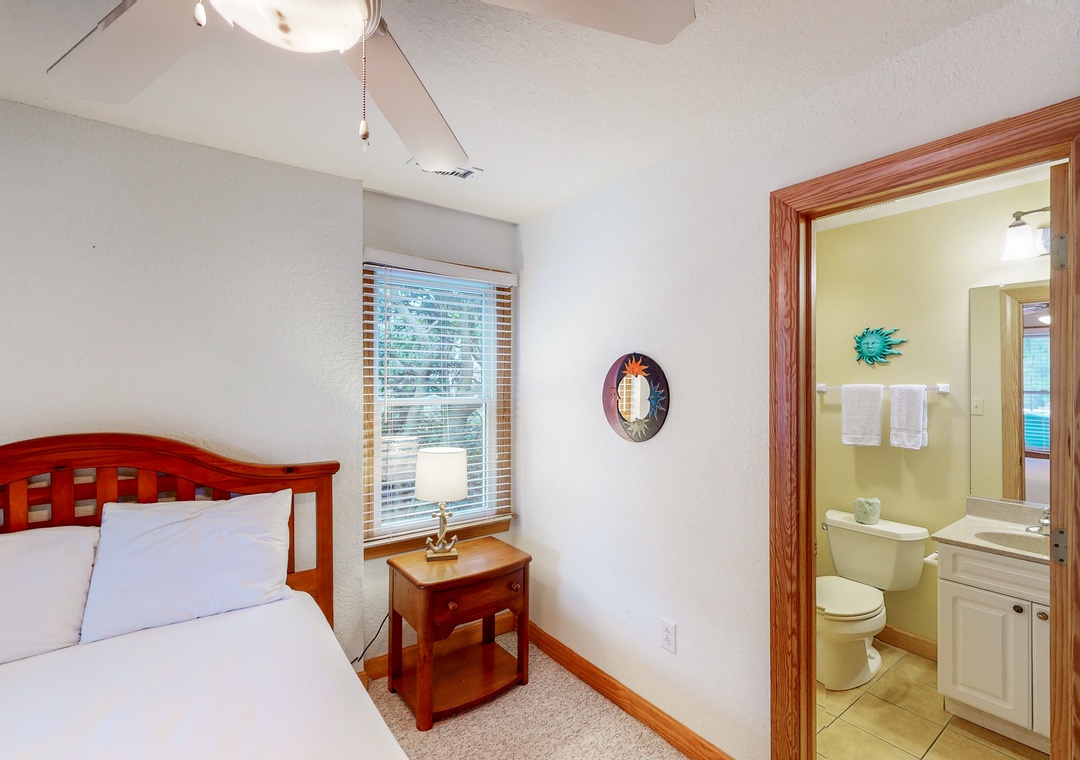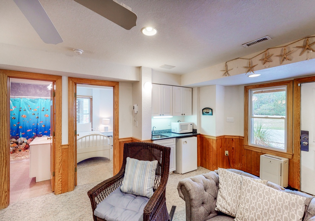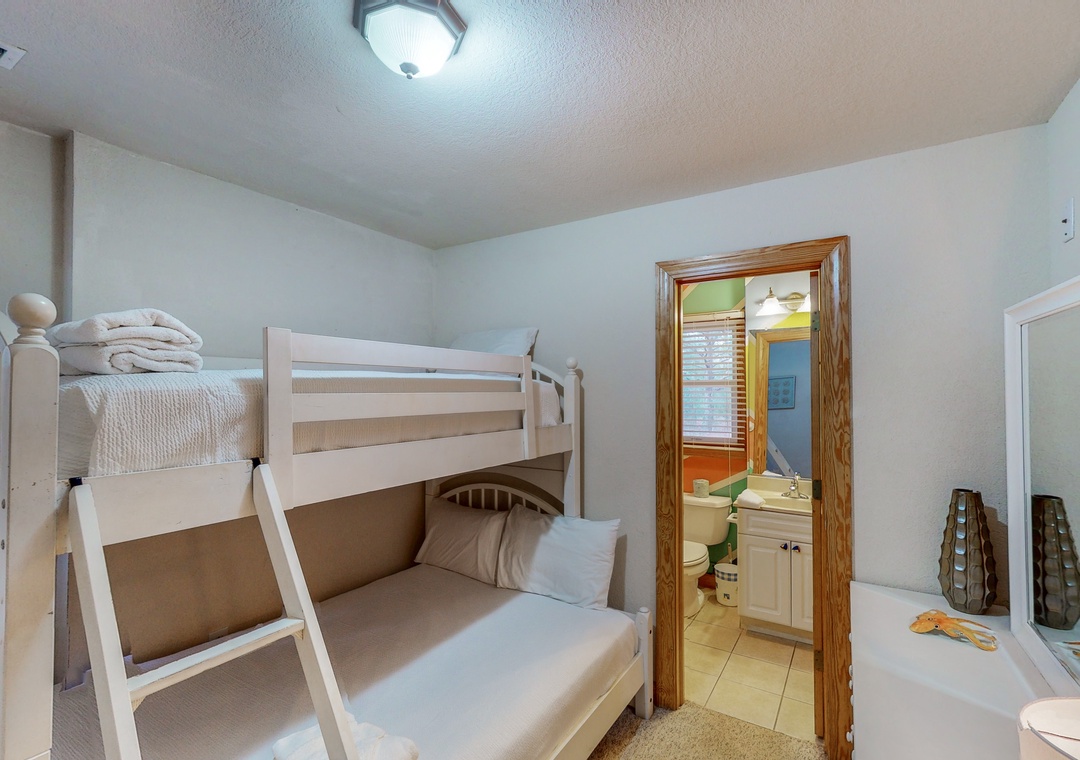Enter into the rec room/den featuring a 36' TV with DVD player and surround sound, a wet bar with mini-fridge, and a mini-microwave. Just off the rec room is a lovely main bedroom, another main bedroom with a DuoBunk, and a room with two singles that shares a full bathroom with a room with a DuoBunk. Step outside and enjoy a dip in the totally gated, private pool or soak in the poolside hot tub. Enjoy some shade and sip your favorite beverage at the poolside cabana bar. There is even a half bath located just off the pool deck, so no trips inside the house! Two park style charcoal grills are located on the pool deck for grilling those family feasts!