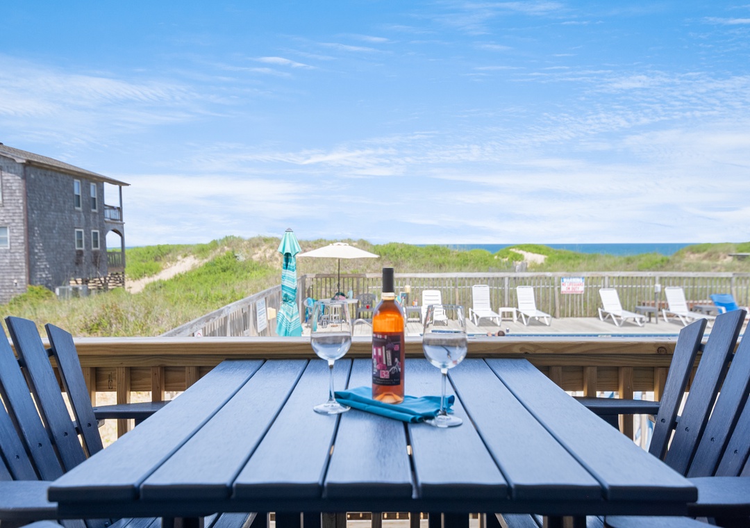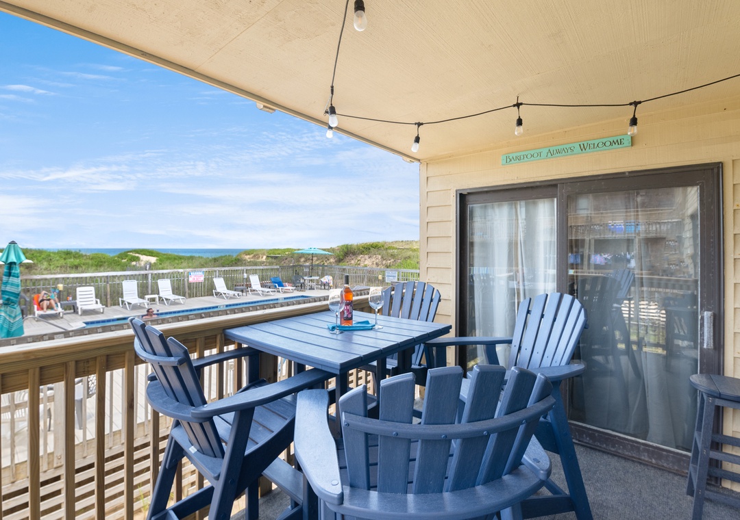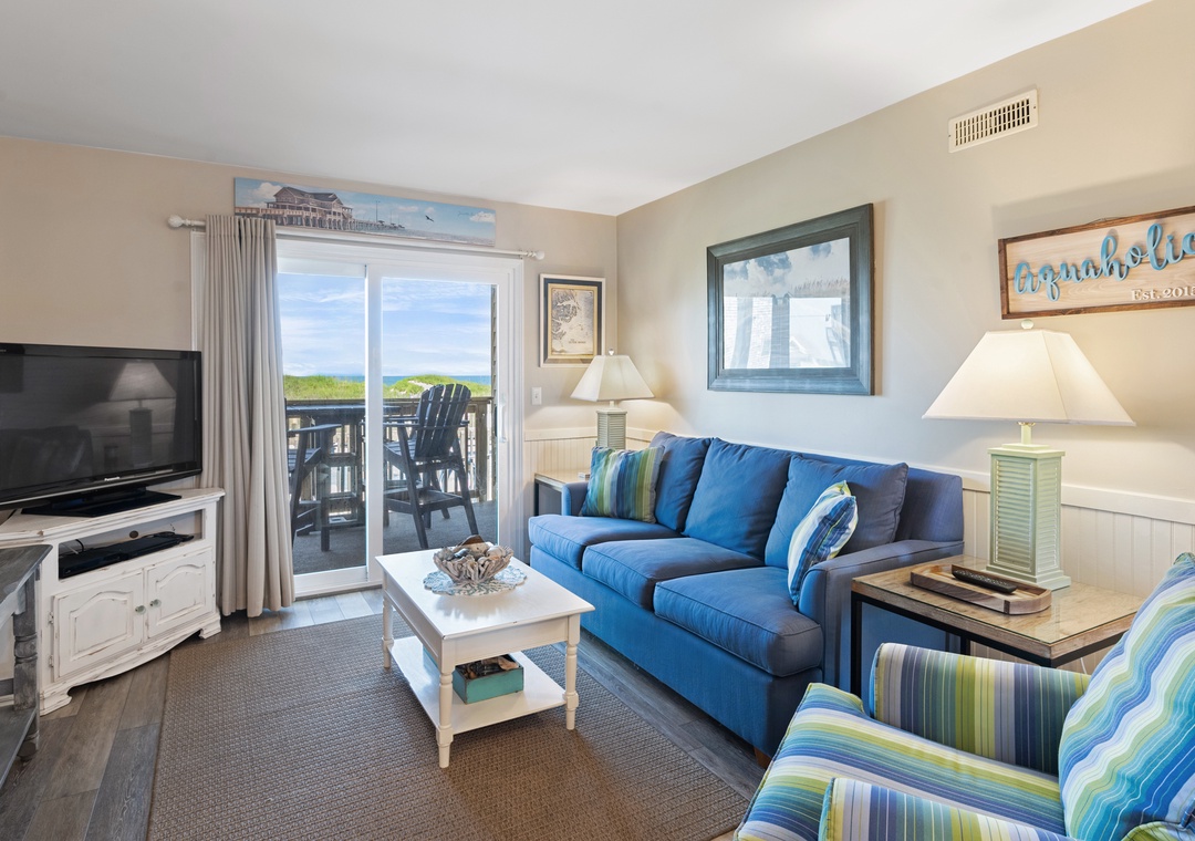 Aquaholic is the perfect place for your next beach vacation! If you love scenic views you will enjoy Aquaholic's amazing ocean views! This beautifully decorated, oceanfront condo has all you need for a fun-filled and relaxing OBX vacation. The oceanfront deck overlooking the pool provides seating for outdoor dining and the perfect spot to capture some amazing sunrises. A private community walkway leads you to the beach where you can spend the day swimming, surfing, searching for shells or just basking in the sun or hang out at the community pool that offers a large pool deck with lounge chairs. One level living at its best with comfortable seating in the living area and an upscale, well-equipped kitchen and a master bedroom with deck access.