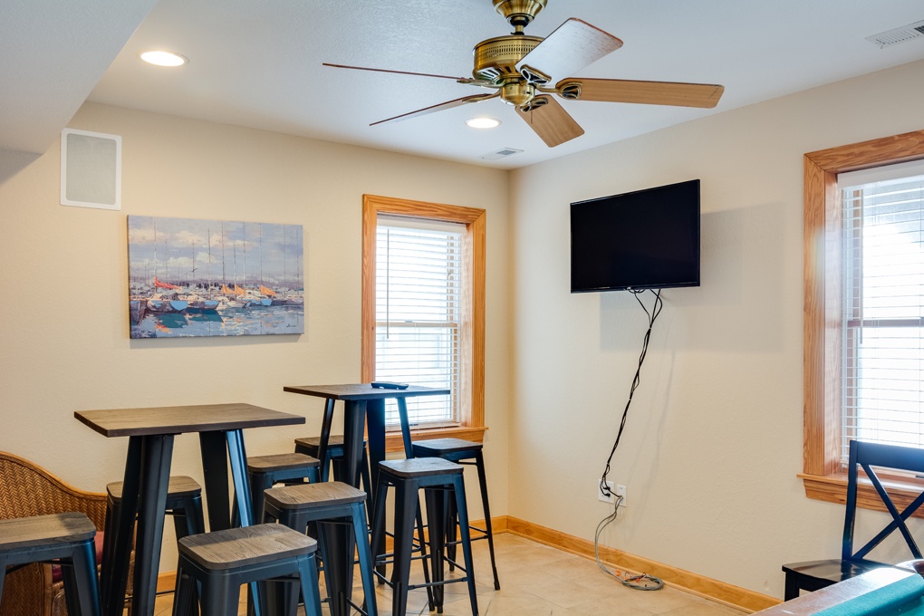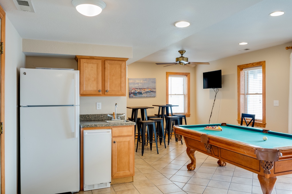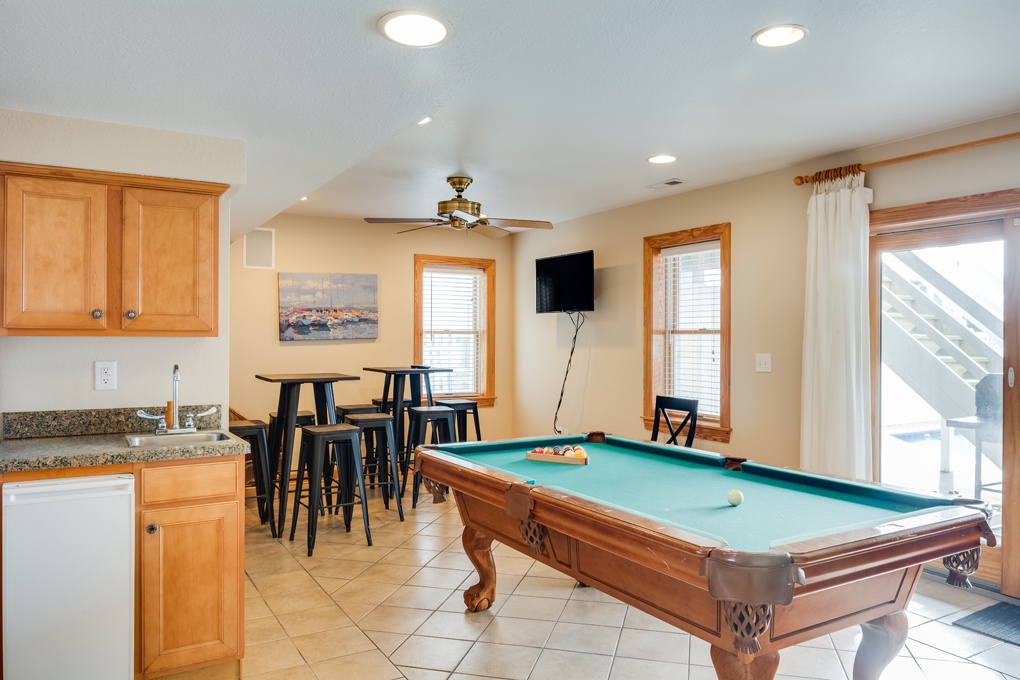 TVs, DVD players, WiFi, fireplace, rec room with pool table and kitchenette with a wet bar, ice maker and refrigerator, grill and outside shower.
