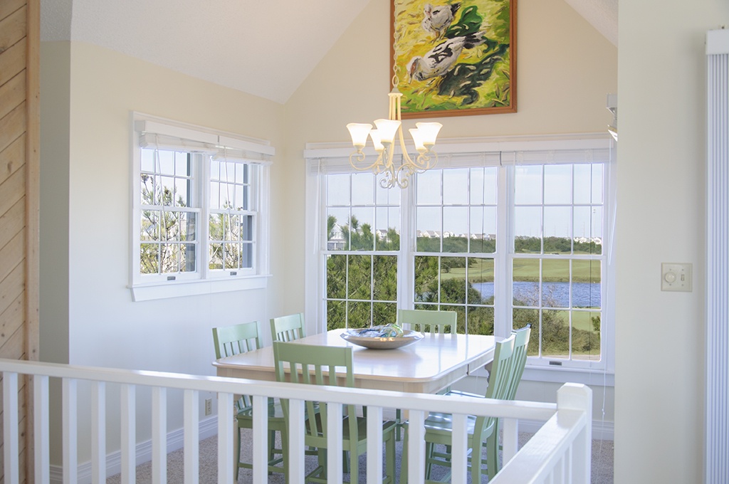 The Lauren Lee is a beautiful two-story Outer Banks vacation home located at The Village at Nags Head on the Outer Banks. Situated between the crystal blue waters of the Atlantic Ocean and the sound, you have spectacular views of the Sound, The Village at Nags Head golf course as well as the pond. This home offers a private pool and hot tub and a full-size refrigerator under the house for the pool area. Watch the sunset over the sound from the deck.