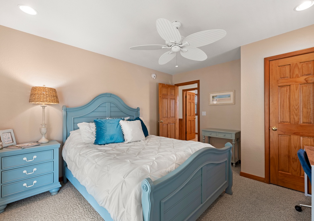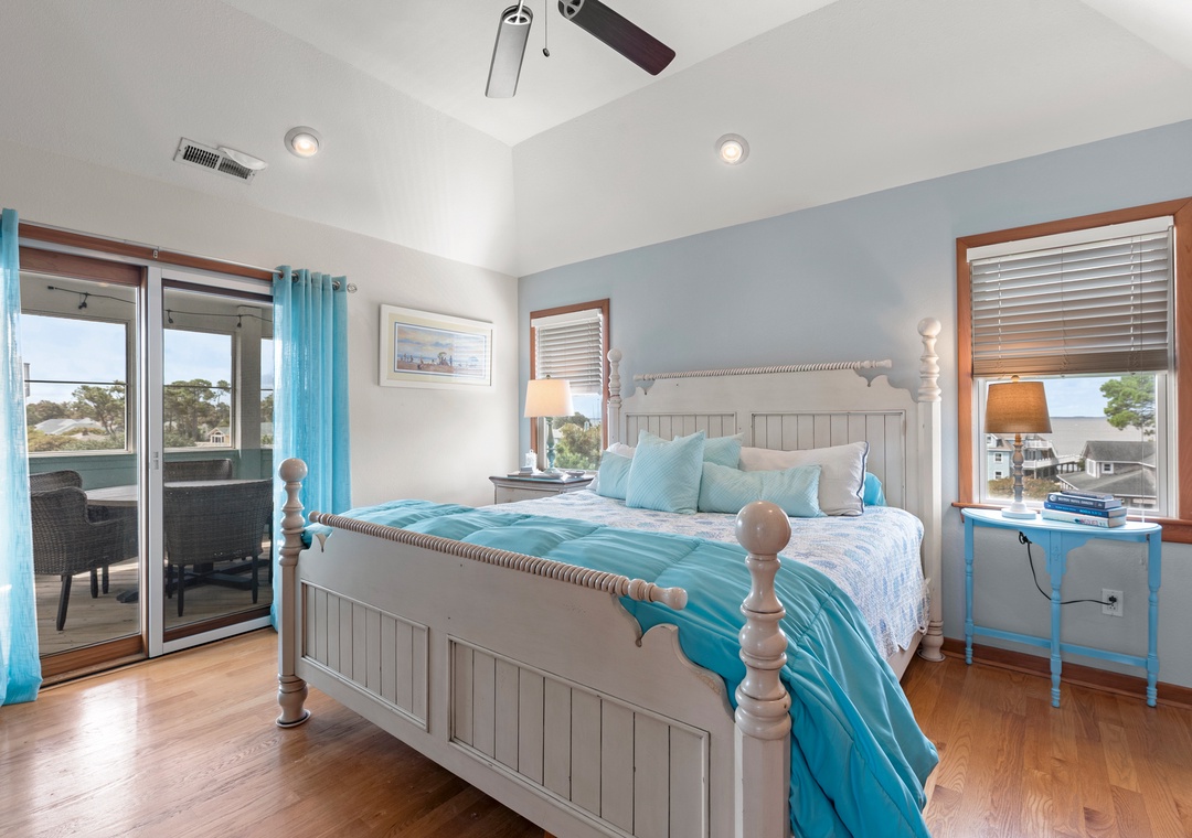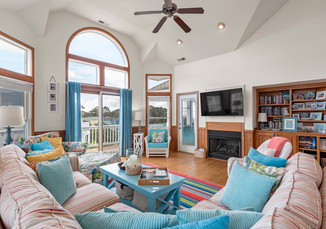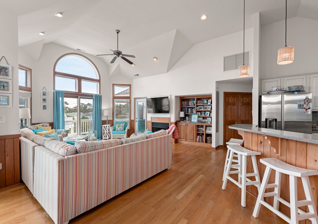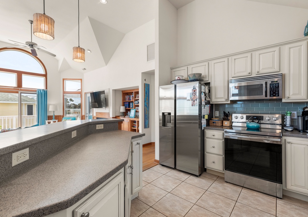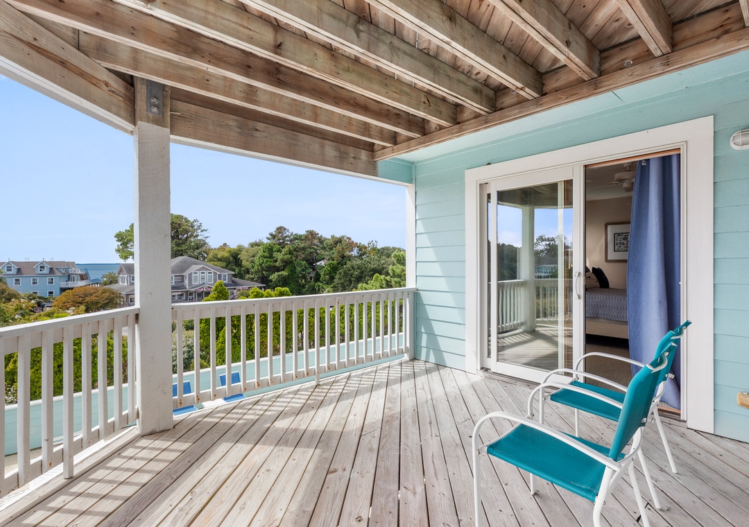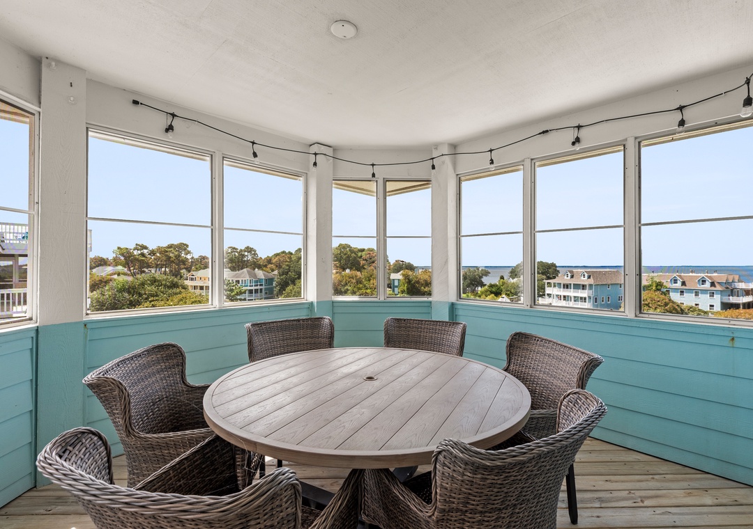 Upstairs, the middle level offers a king ensuite and two charming queen bedrooms that share a bathroom, all with deck access overlooking the sparkling pool below. But the real showstopper is the top floor, where a spacious king ensuite opens to a dreamy, screened porch with views of the sound and sunsets that will steal your breath away. The open-concept living area flows into a bright, modern kitchen with island seating for your morning coffee crew. And tucked away nearby is a versatile nook, whether you need a playroom, a quiet office, or a cozy reading spot with a daybed, it’s got you covered.