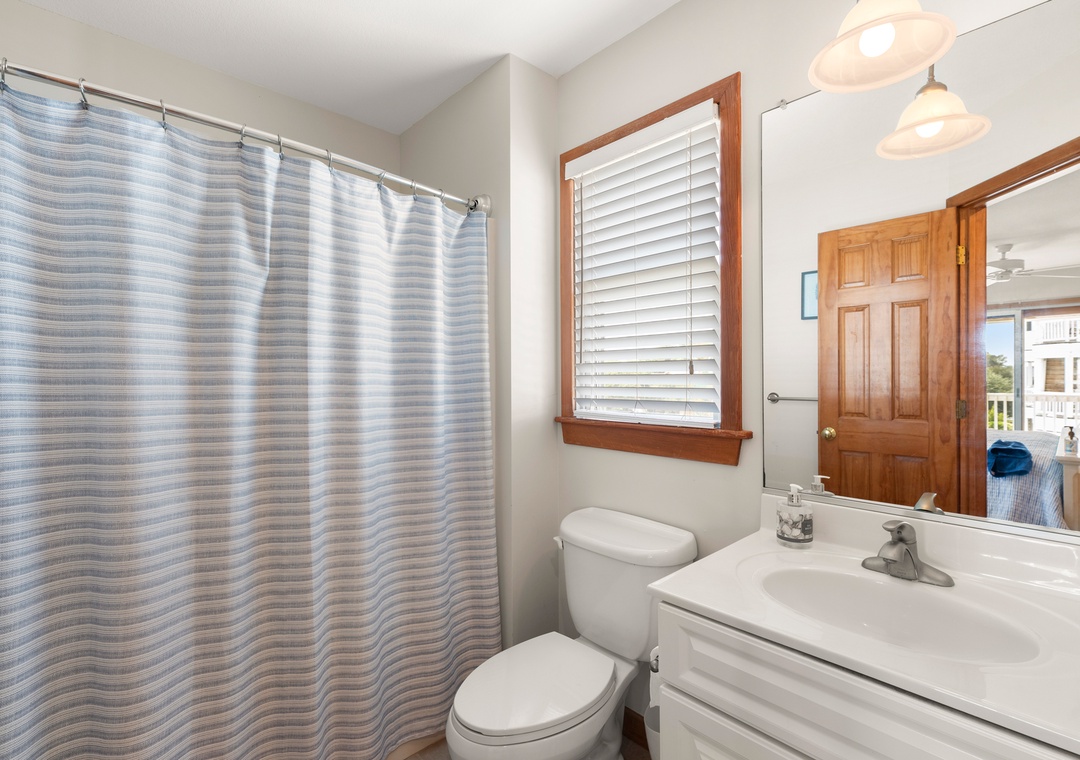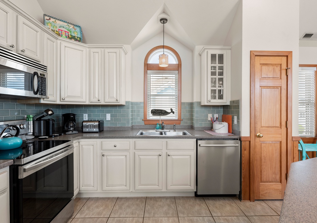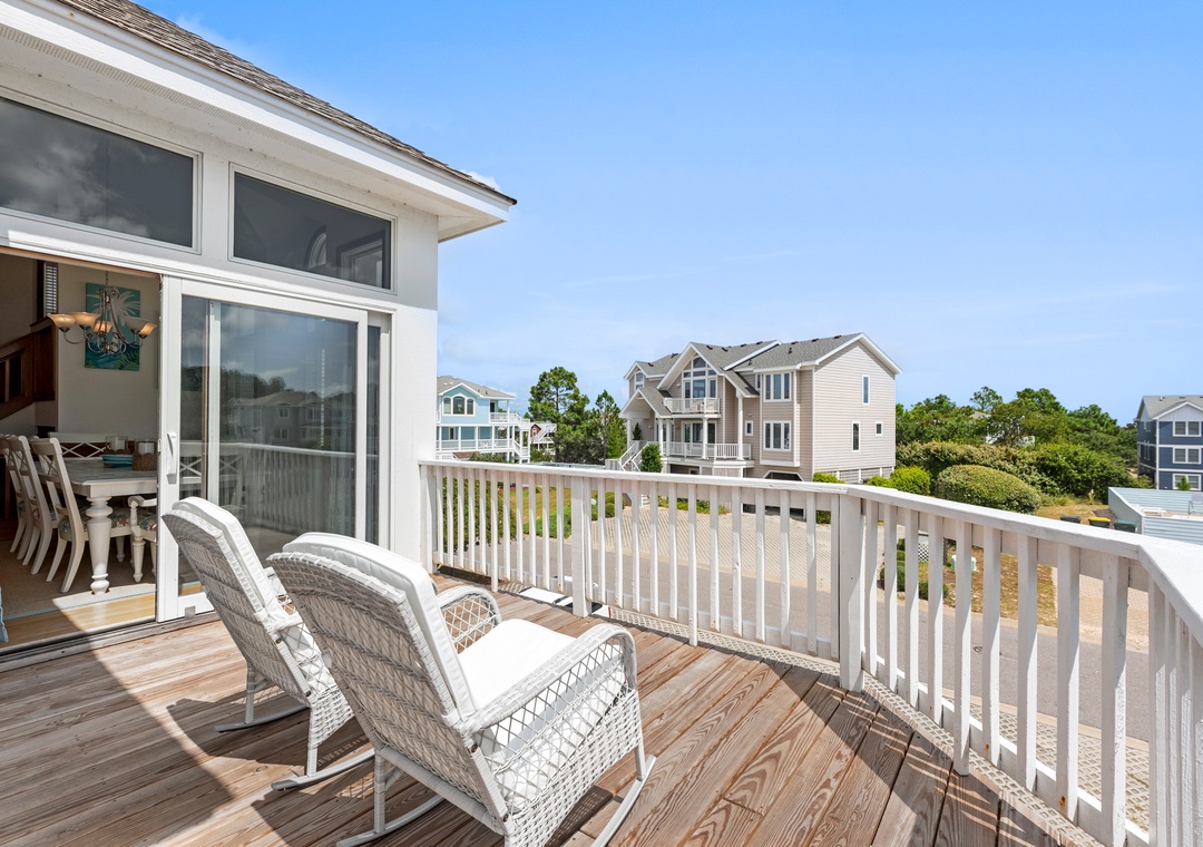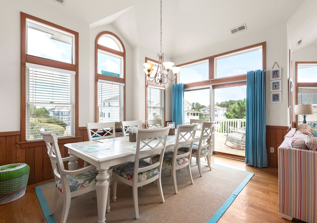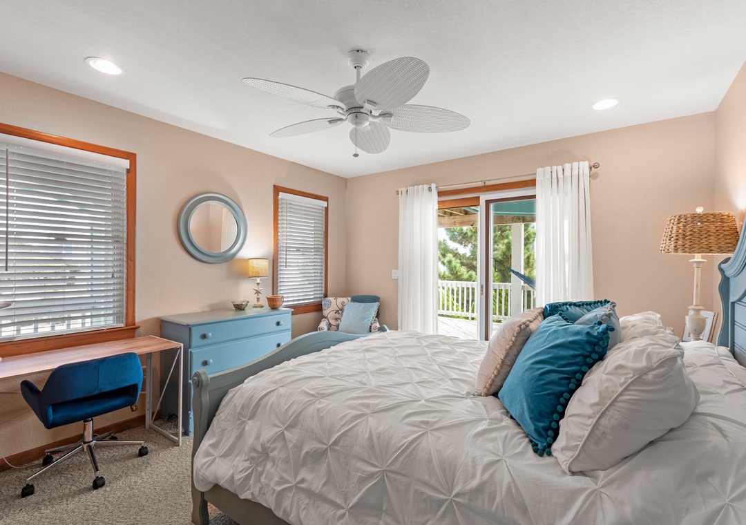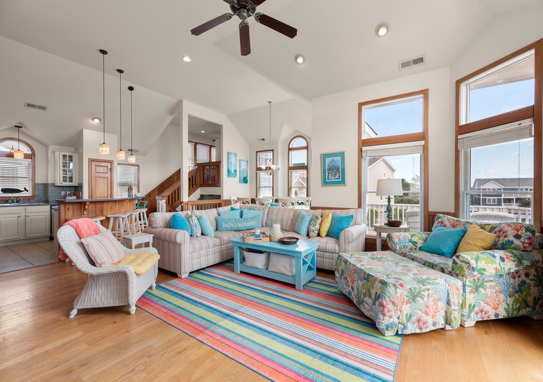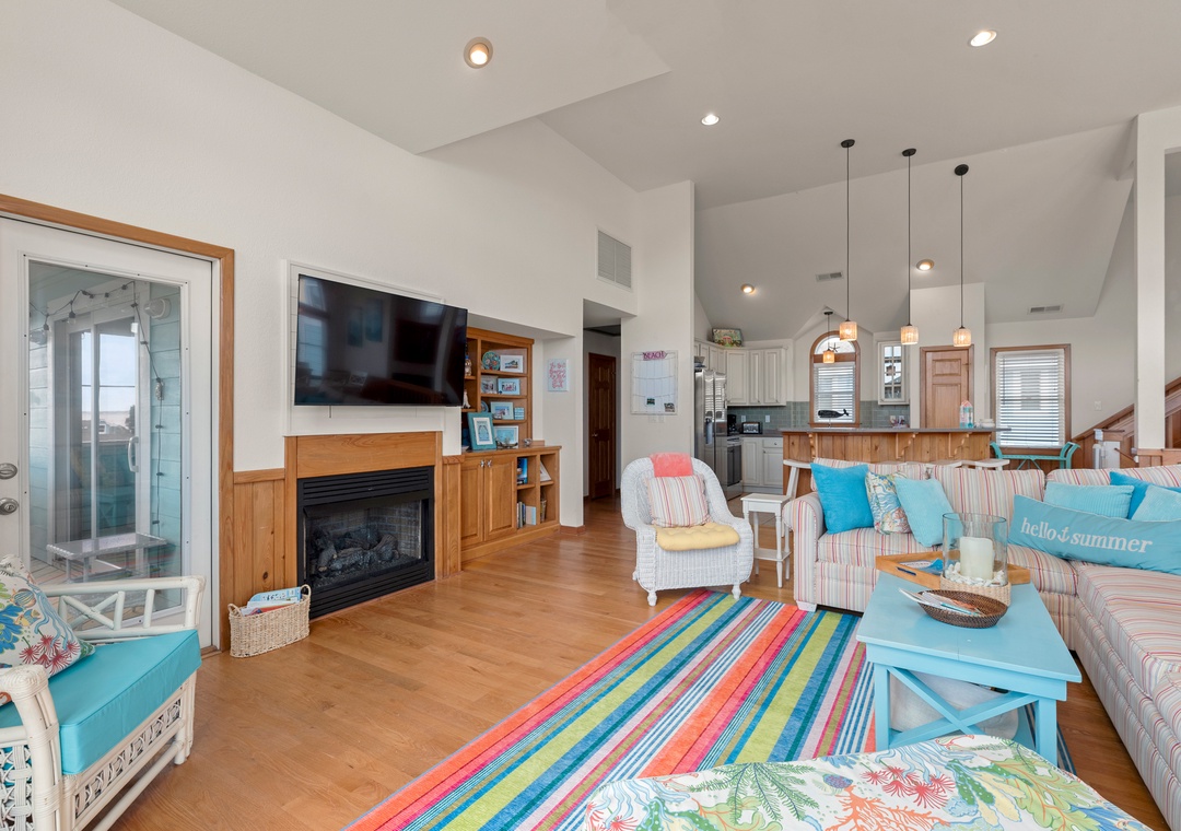 Upstairs, the middle level offers a king ensuite and two charming queen bedrooms that share a bathroom, all with deck access overlooking the sparkling pool below. But the real showstopper is the top floor, where a spacious king ensuite opens to a dreamy, screened porch with views of the sound and sunsets that will steal your breath away. The open-concept living area flows into a bright, modern kitchen with island seating for your morning coffee crew. And tucked away nearby is a versatile nook, whether you need a playroom, a quiet office, or a cozy reading spot with a daybed, it’s got you covered.