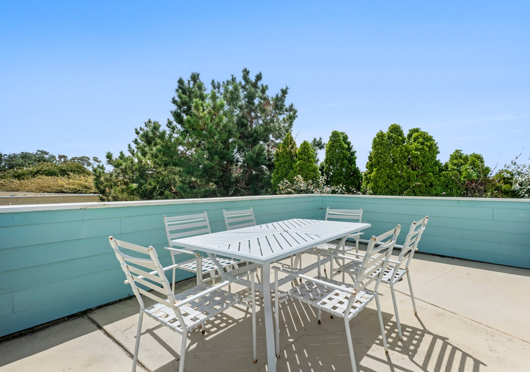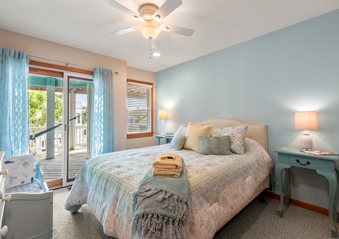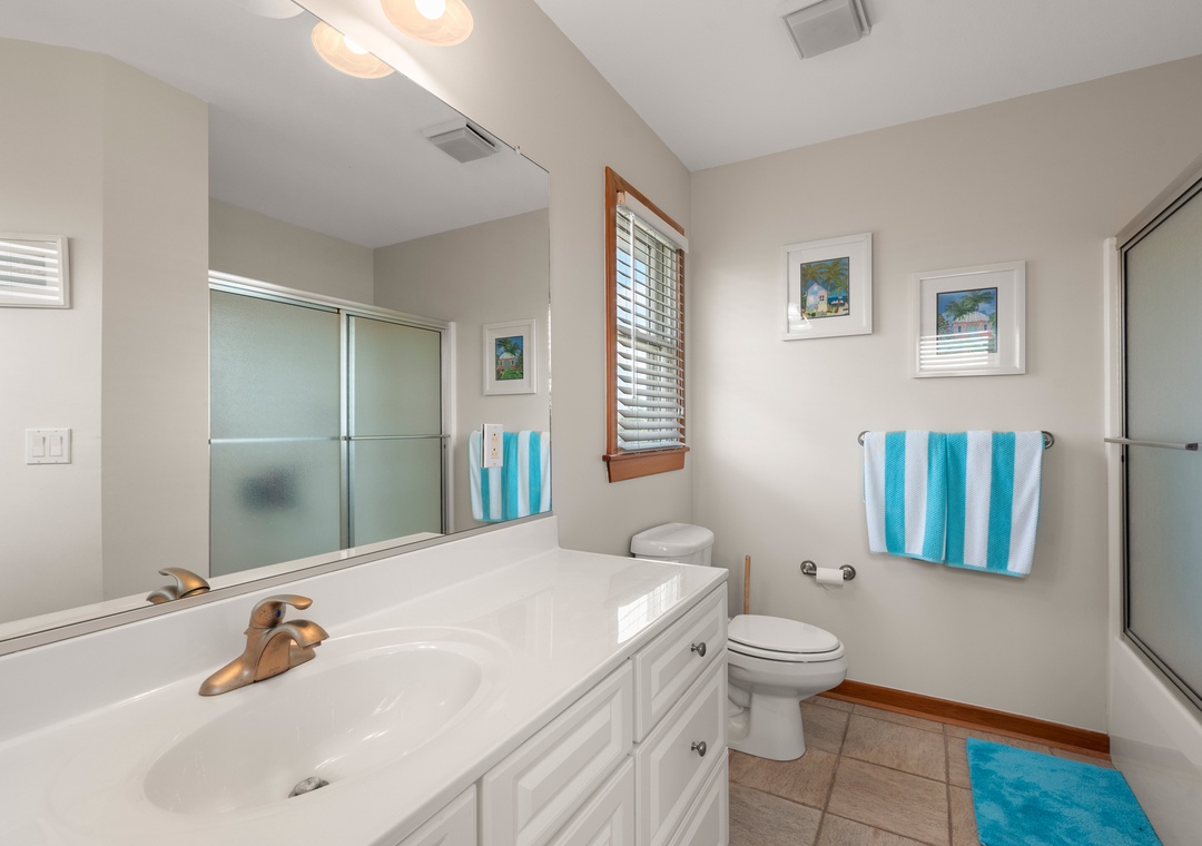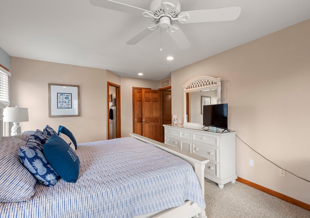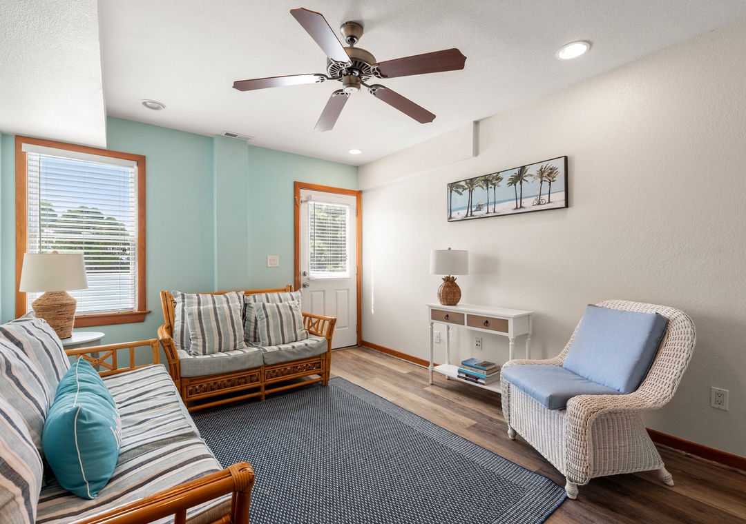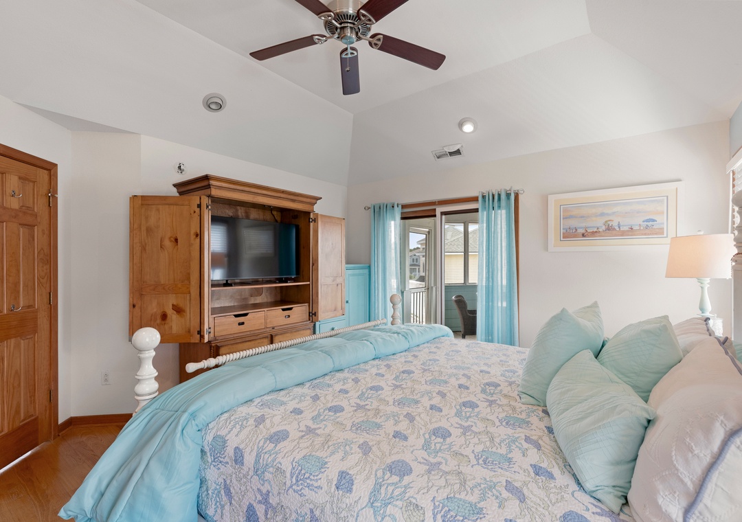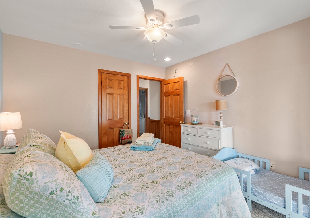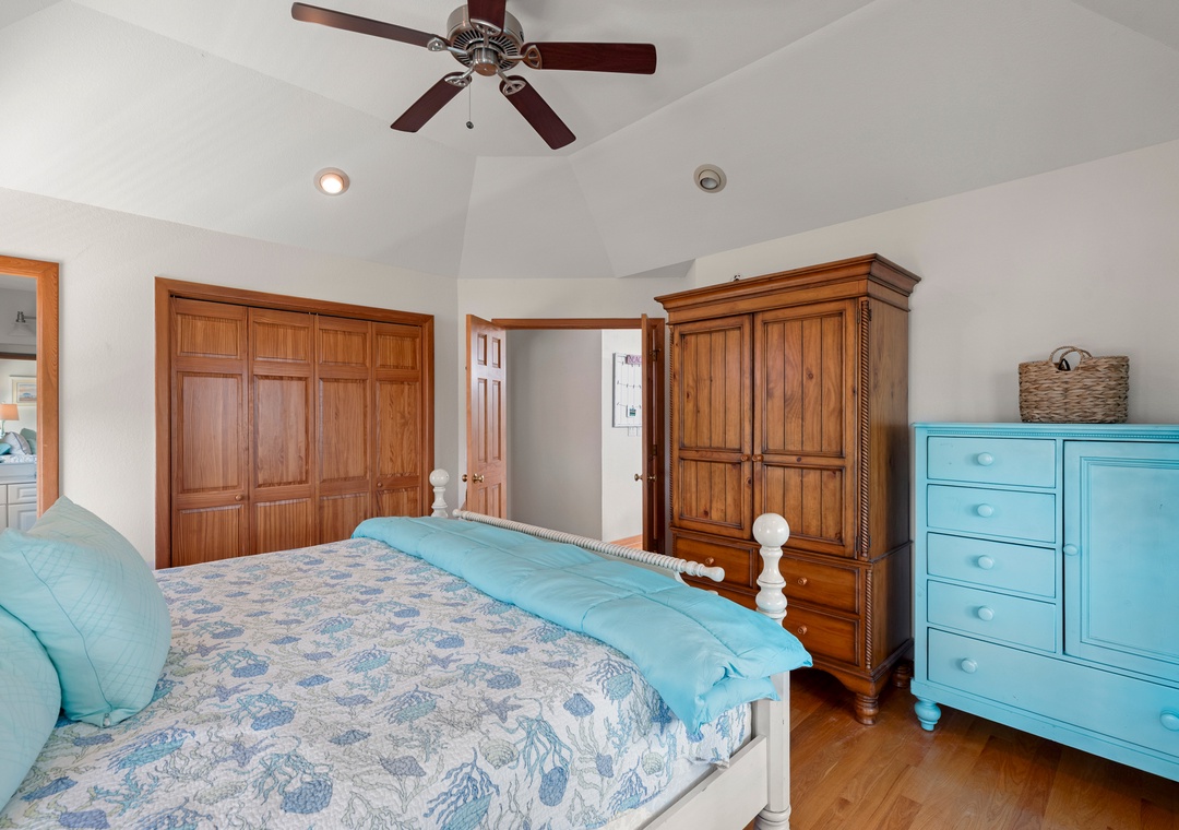 Upstairs, the middle level offers a king ensuite and two charming queen bedrooms that share a bathroom, all with deck access overlooking the sparkling pool below. But the real showstopper is the top floor, where a spacious king ensuite opens to a dreamy, screened porch with views of the sound and sunsets that will steal your breath away. The open-concept living area flows into a bright, modern kitchen with island seating for your morning coffee crew. And tucked away nearby is a versatile nook, whether you need a playroom, a quiet office, or a cozy reading spot with a daybed, it’s got you covered.