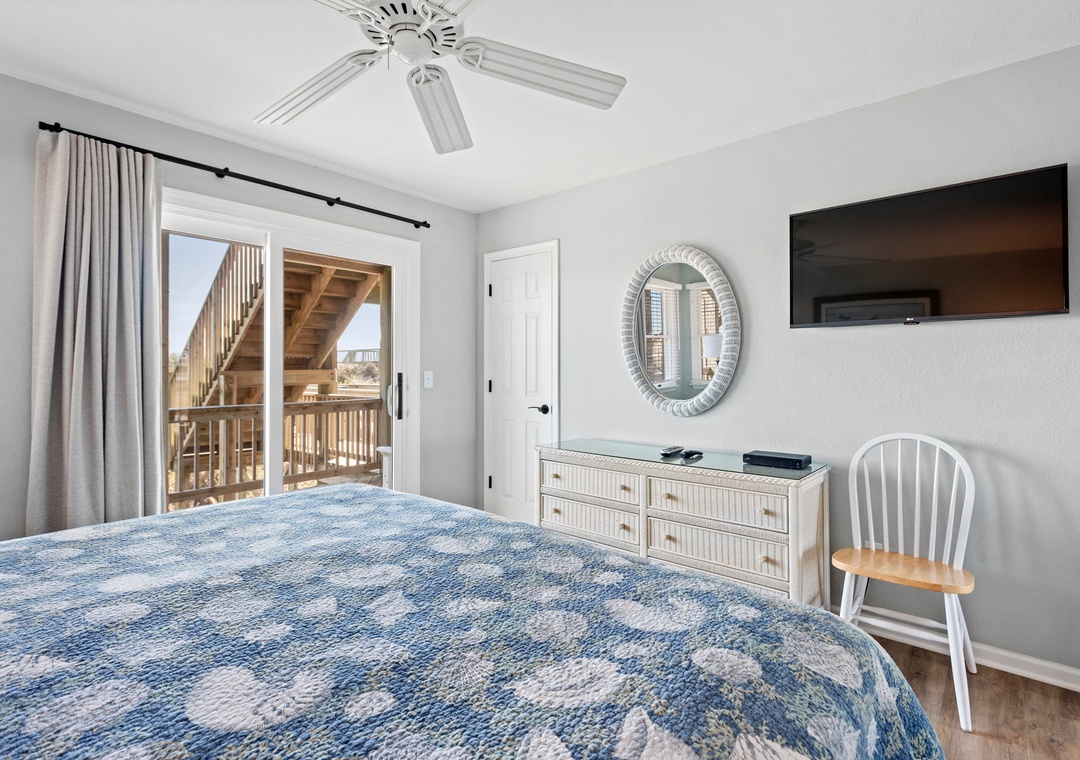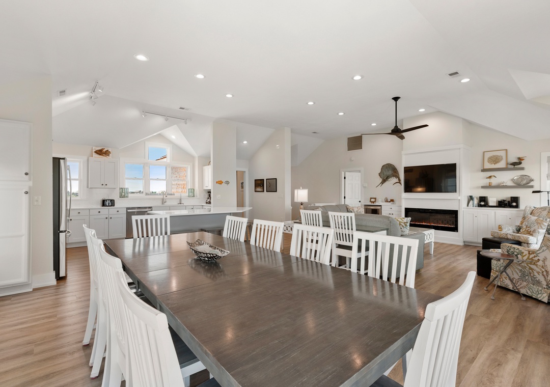 This is a wonderful, spacious and well appointed home. Our family of 15 had plenty of room to spread out and enjoy the cottage. I loved the large covered porches with nice, comfortable deck furniture. The kitchen was large with plenty of utensils, plates, pots and pans, etc. There are two refrigerators, one in the kitchen and one in the rec room. We used the rec room refrigerator for beverages. I loved the master bedroom and bathroom. It was spacious and had a beautiful view of the ocean. Having two outdoor hot and cold water showers was nice and we enjoyed the gas grill for several meals. The air conditioner cools effectively. The walkway to the beach was in good condition and really loved the extra deck at the end of the walkway right before you step down into the sand. The hot tub was nice on the lower level. You do not have an ocean view from the lower levels of the house but the view from the top living, kitchen area was wonderful due to the large windows that allowed a full view of the ocean. There are a lot of stairs in this house and it was ok for our athletic in shape family but if you have health issues this could be a problem as there are three sets of stairs. The adults and kids loved playing the video games in the rec room which had a comfortable couch, large screen smart tv and full bathroom on the same level. The large washer/dryer is also on this lower level . There are flat screen tvs in every bedroom and three large smart tvs in the house, one in the family room, one in the rec room and one in the master bedroom. Three of the queen bedrooms on the middle level had separate entrances to the ocean side middle deck and my adult kids loved this perk. Also the twin bed room had it`s own balcony that faced the front side of the house. The kid room does not have outside access which was appreciated as we had small children in that bedroom.There is plenty of parking and there are two carports. The one recommendation I would make is to update the mattresses on the middle level with the 5 bedrooms. The king mattress in the master suite on the top level is still in good shape. I highly recommend this large house for families and look forward to returning in the future.- Reviewed On: 7/10/2023