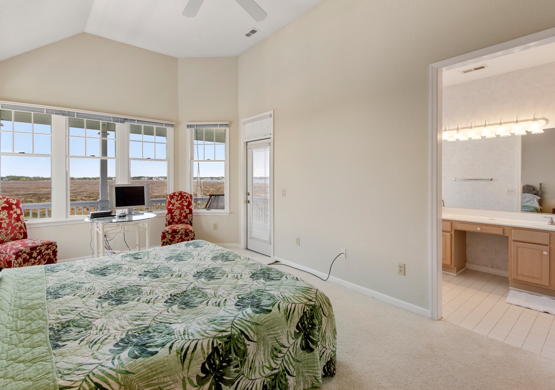 Skippers Landing is a pet-friendly, waterfront home in the prestigious boating community of Pirate's Cove. A bright and airy open-concept great room provides fabulous sightlines and views of the canal. The dining area leads directly onto an expansive, west-facing sun deck overlooking the marsh. At dinnertime, prepare meals in the fully stocked kitchen, with an open-concept layout that allows the chef in your group to socialize and enjoy the view. Upstairs, the spacious primary suite with king bed and vaulted ceilings opens up onto a private balcony - the perfect place for admiring sunsets or watching the fireworks on the 4th of July. The primary suite has a bath with a double vanity, jetted tub and separate walk-in shower. Three additional bedrooms, including a second ensuite, will comfortably accommodate family and friends. Situated right on the canal, the home provides direct access to the boardwalk where you can take evening strolls throughout the marina. Skippers Landing is the ideal choice for boating enthusiasts, who can use the nearby public ramp and dock a vessel right behind the house in the private boat slip.