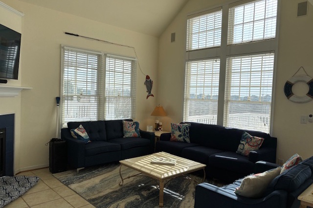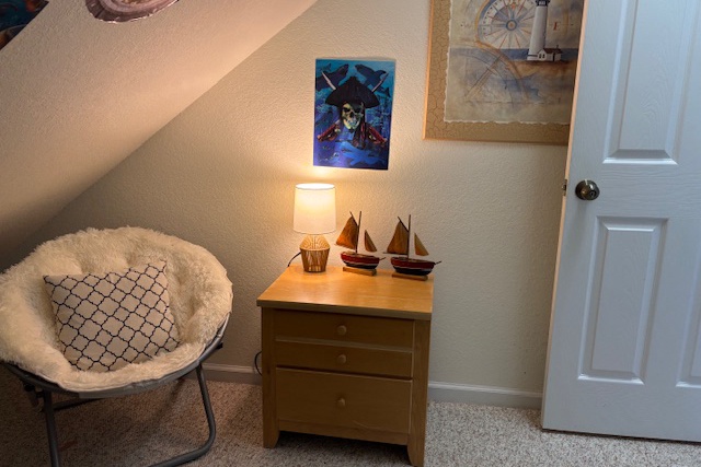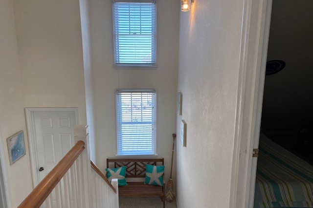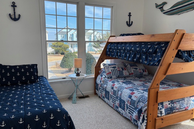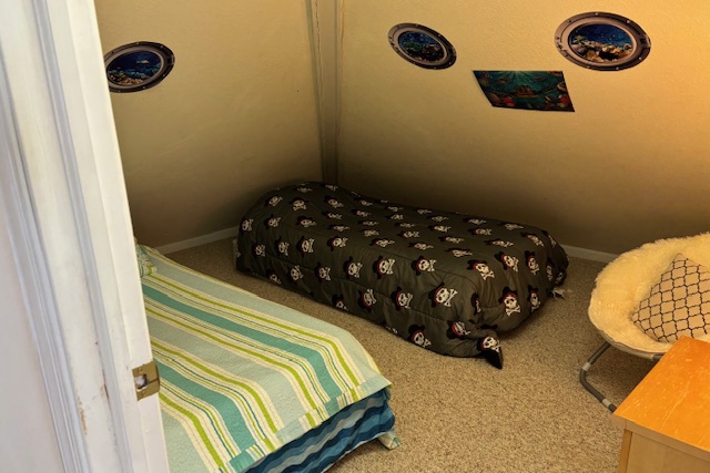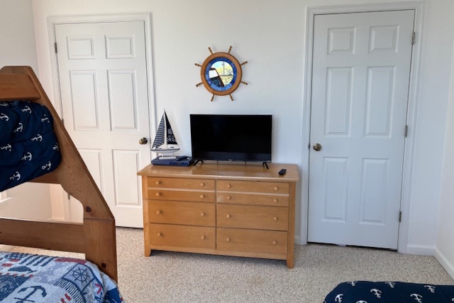 Moving up to the middle level, you’ll find the dedicated kids’ haven. This cheerful room features a twin bed and a pyramid bunk bed, an ideal setup for young adventurers excited to settle in after a day on the water. Nearby is the heart of the home, where the kitchen opens to the dining and family rooms, creating a warm and inviting shared space. This level also includes a laundry room for added convenience, a whole‑house water filtration system that ensures crisp, clean water throughout your stay and an additional queen bedroom!