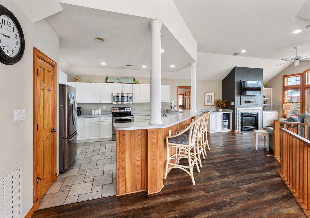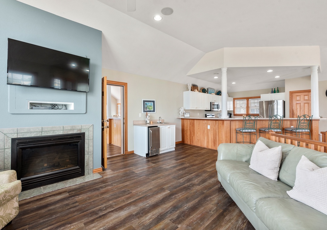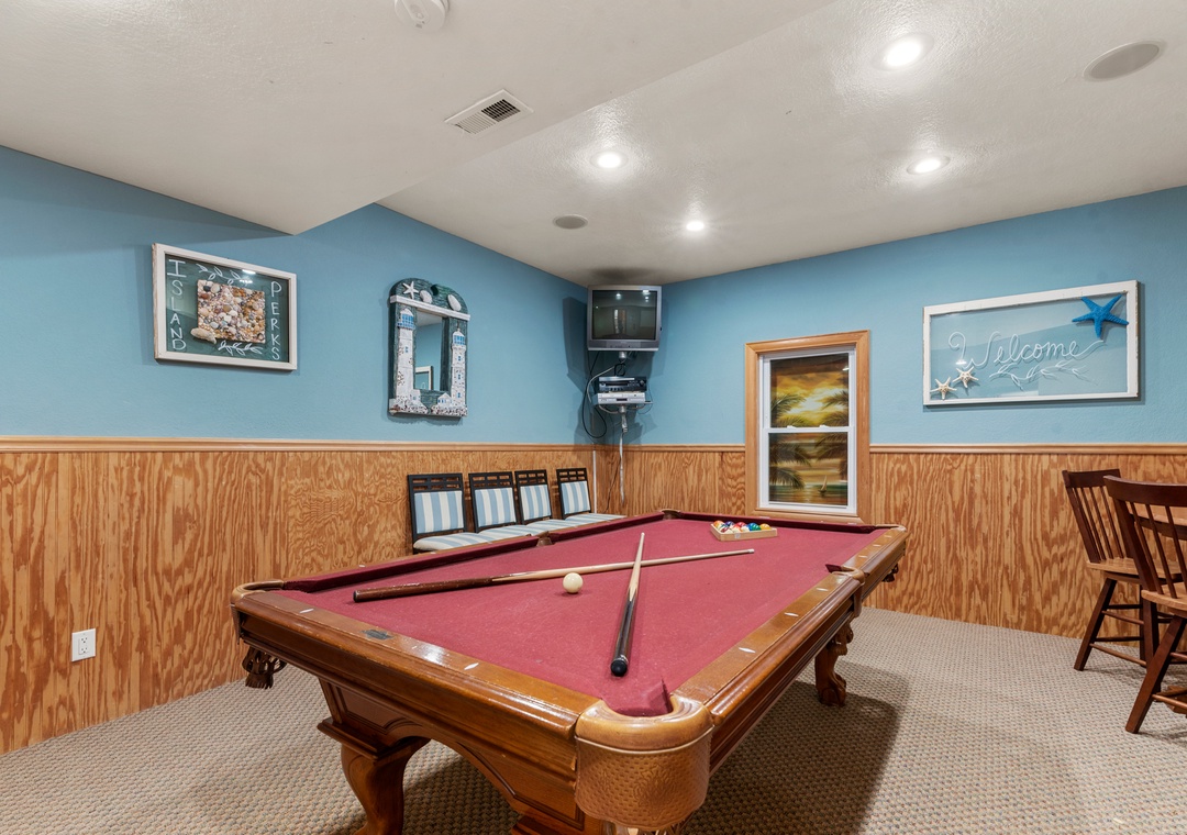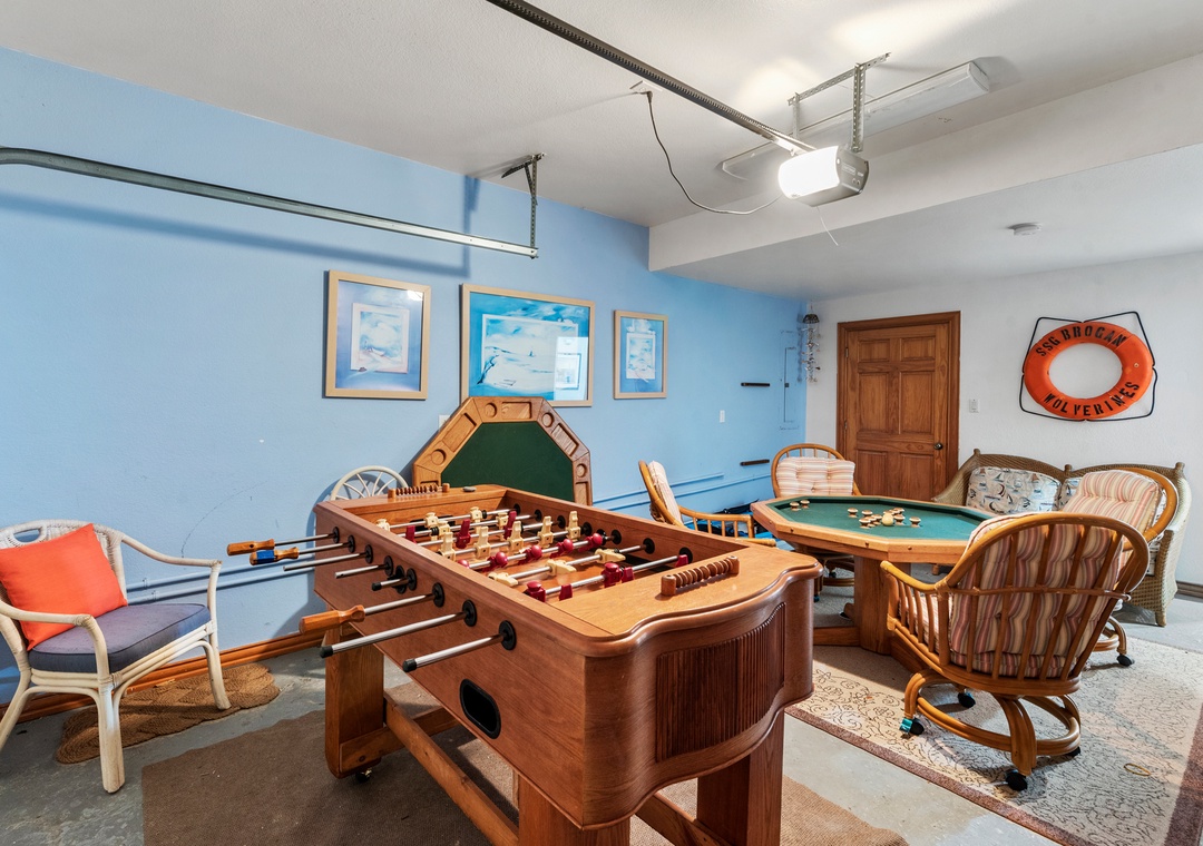 Cooking and clean-up will be a breeze since you'll have TWO KITCHENS - twice the counterspace, twice the appliances, twice the convenience! Both open-concept living areas are located on the top level and feature vaulted ceilings and a wet bar. Two dining areas plus bar seating at both kitchens can accommodate the entire group at mealtime. Just outside, the sun decks on either side are BOTH equipped with a hot tub. In the evenings, head downstairs to shoot some pool in the rec room. The garage on the other side includes a poker table and foosball table for additional indoor entertainment options.