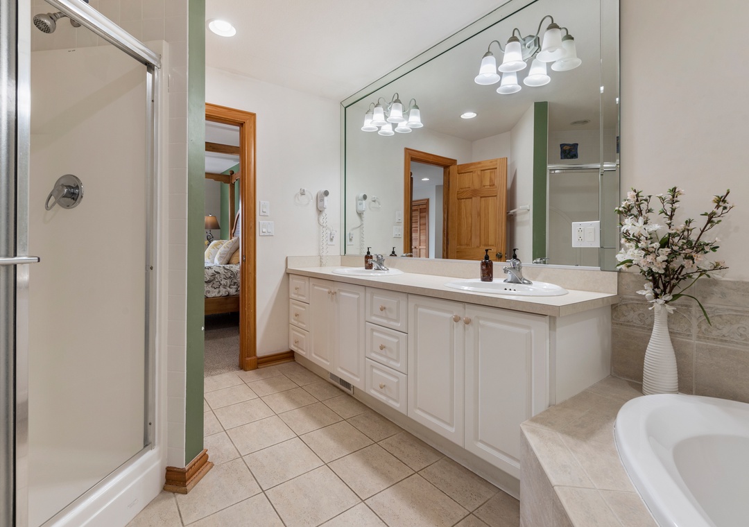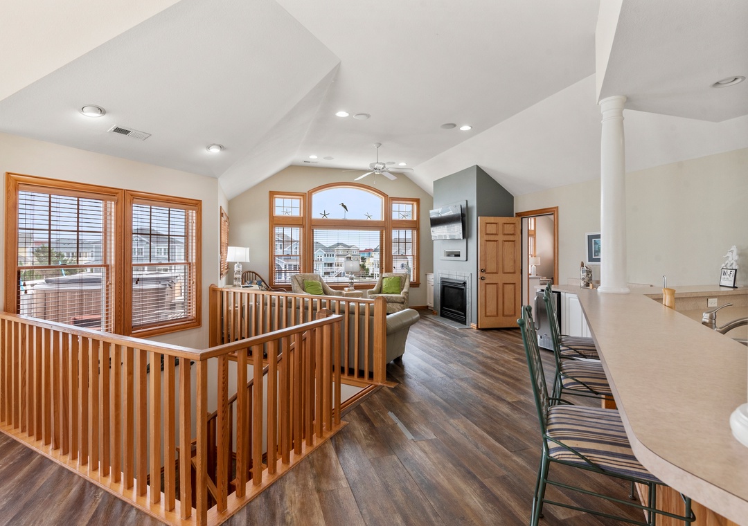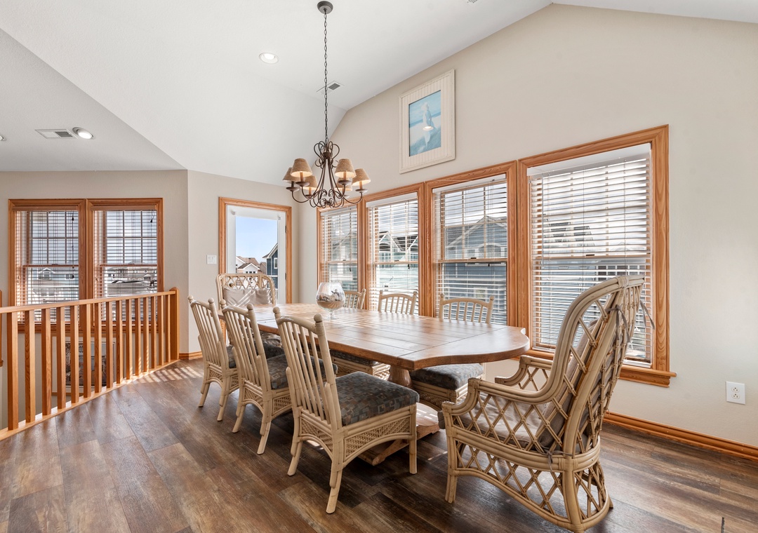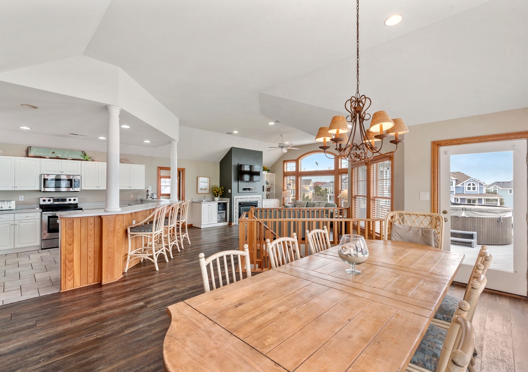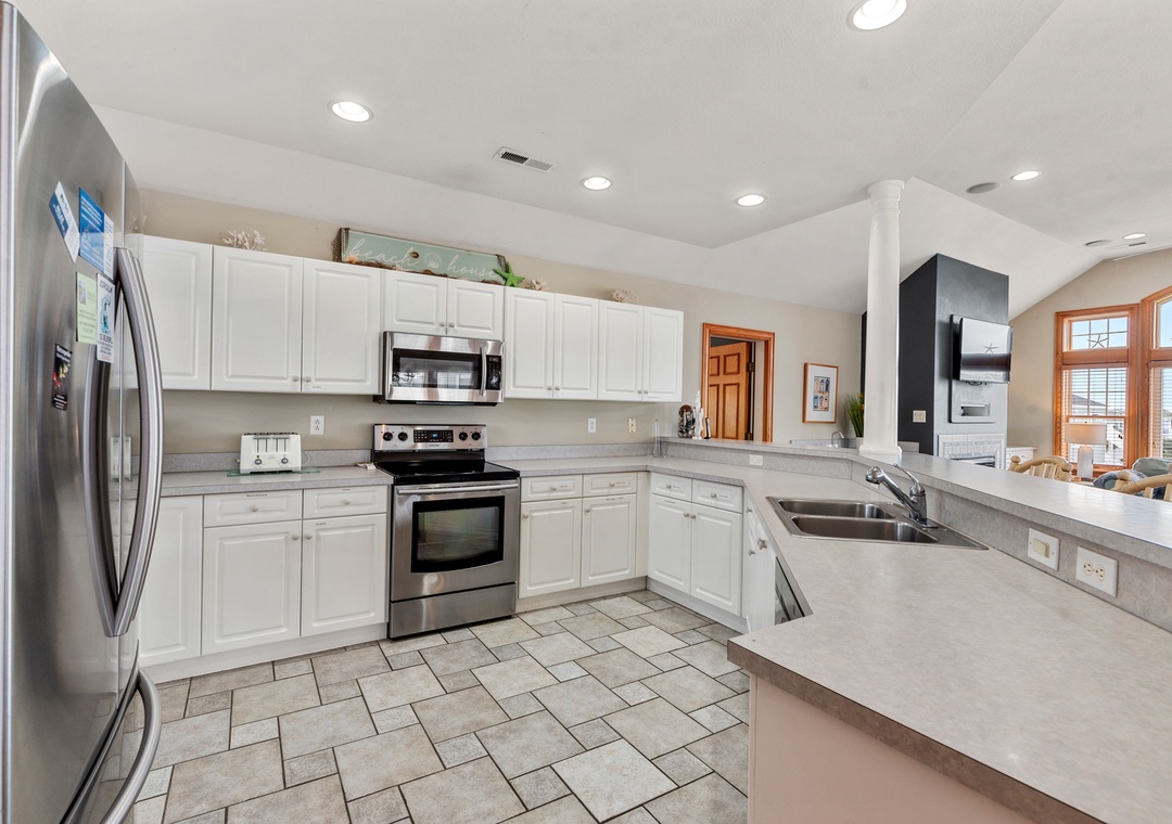 Cooking and clean-up will be a breeze since you'll have TWO KITCHENS - twice the counterspace, twice the appliances, twice the convenience! Both open-concept living areas are located on the top level and feature vaulted ceilings and a wet bar. Two dining areas plus bar seating at both kitchens can accommodate the entire group at mealtime. Just outside, the sun decks on either side are BOTH equipped with a hot tub. In the evenings, head downstairs to shoot some pool in the rec room. The garage on the other side includes a poker table and foosball table for additional indoor entertainment options.
