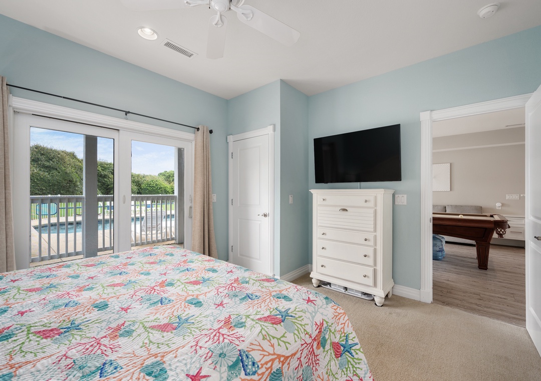 Downstairs you'll find two more bedrooms, as well as a rec room with pool table and convenient access to the backyard oasis where you can cool off in the saltwater pool or soak in the hot tub. The private pool can be heated seasonally, ideal for Spring and Fall getaways. After dark, gather your family and friends around the fire pit to share stories, tell jokes and make memories under the stars.