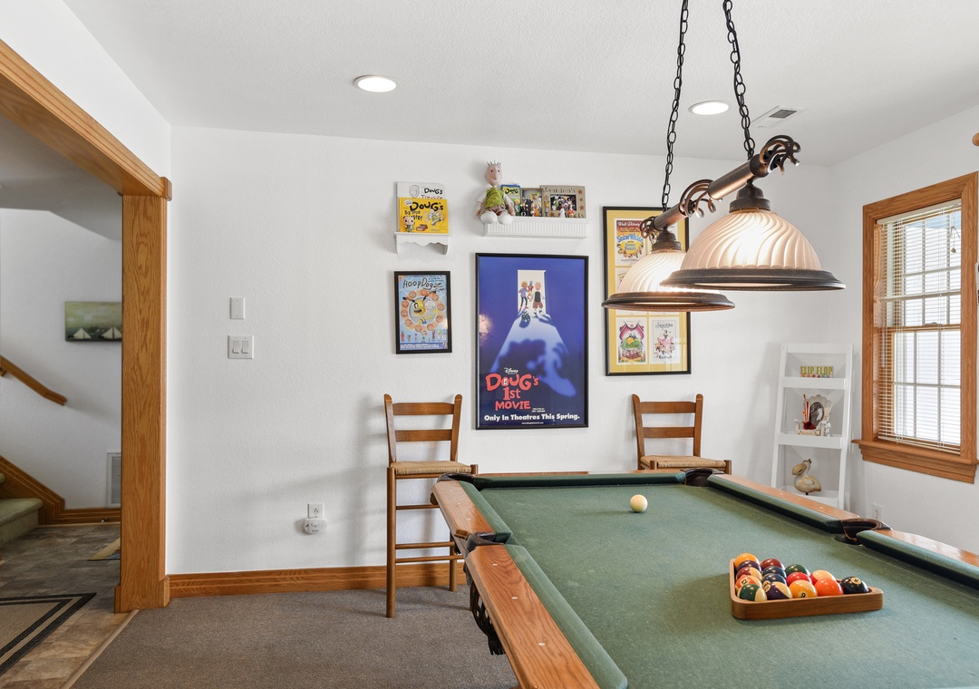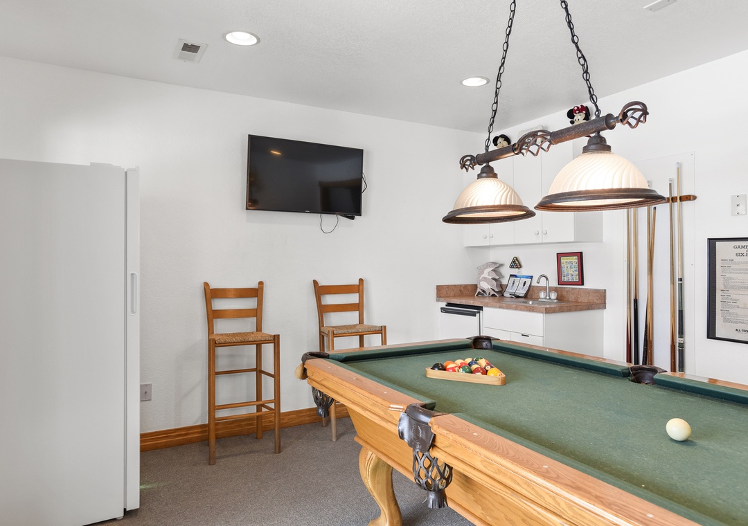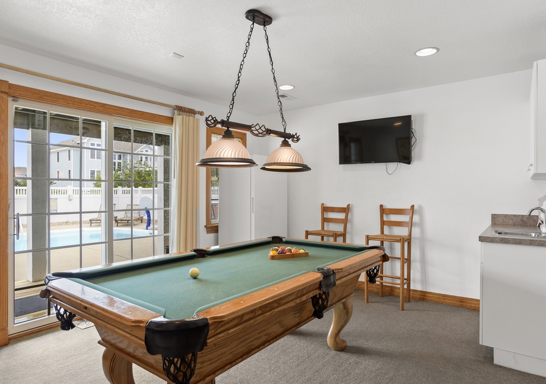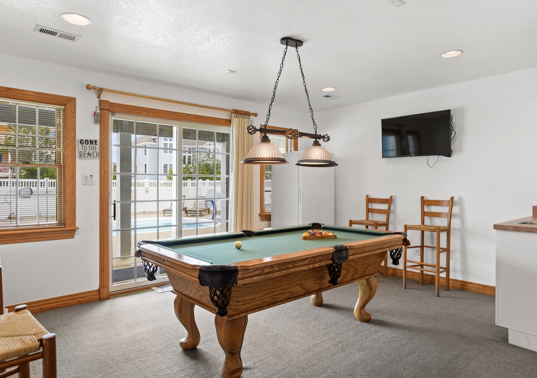Our recreational room has a pool table, an ice maker and a wet bar with a refrigerator under the counter. Exterior amenities include outdoor dining furniture, and outside shower and a grill.