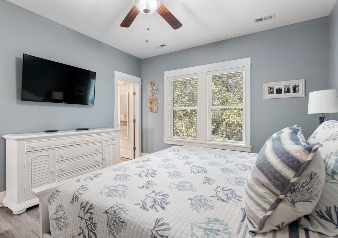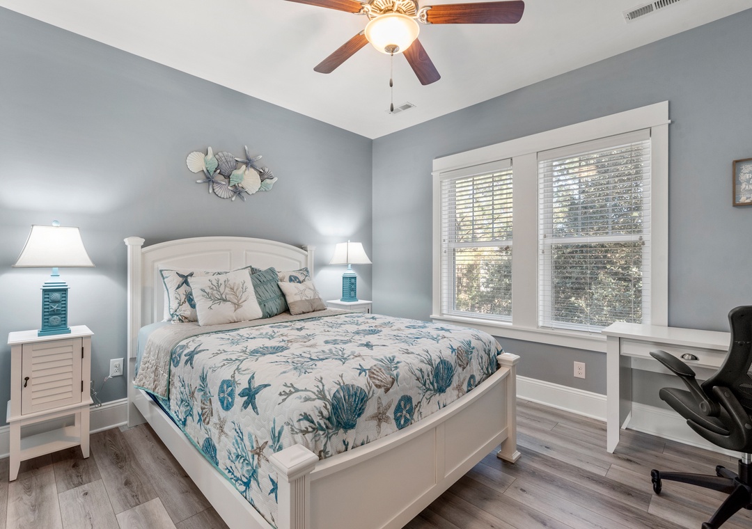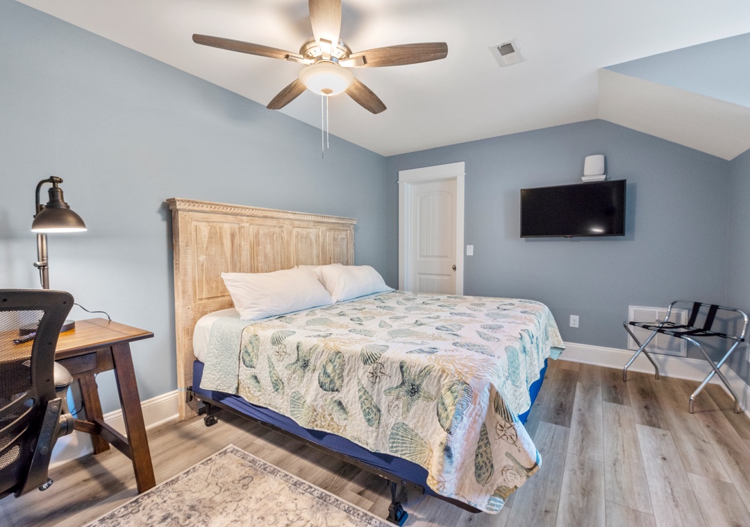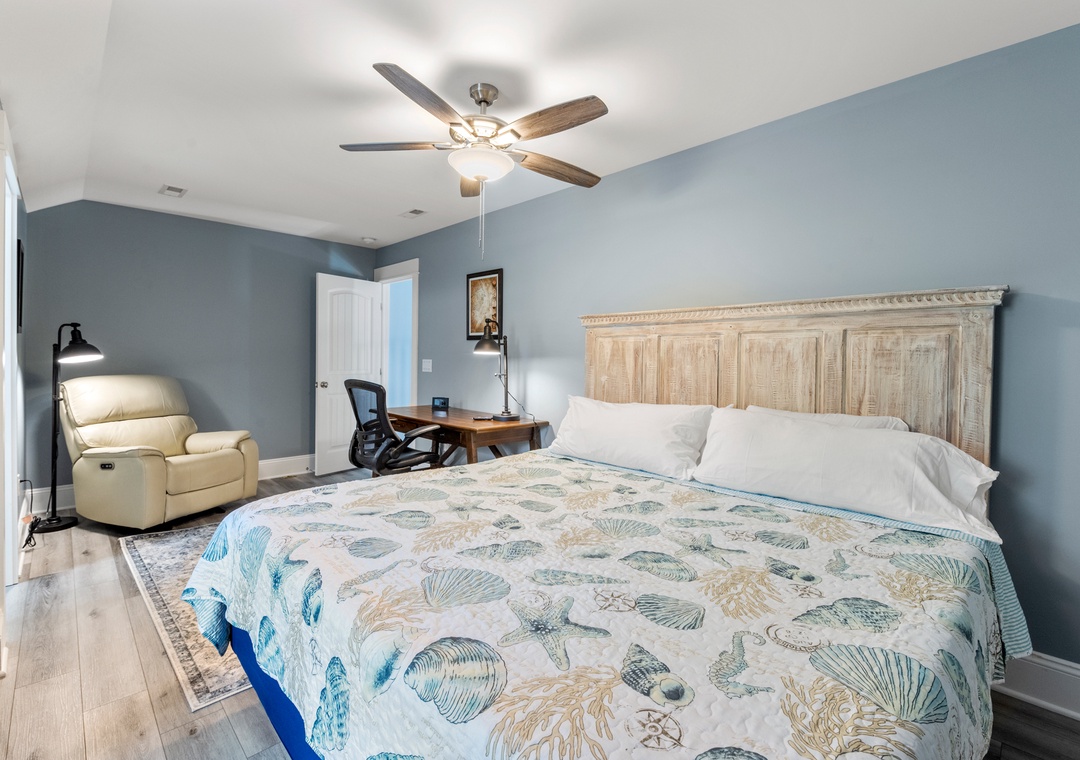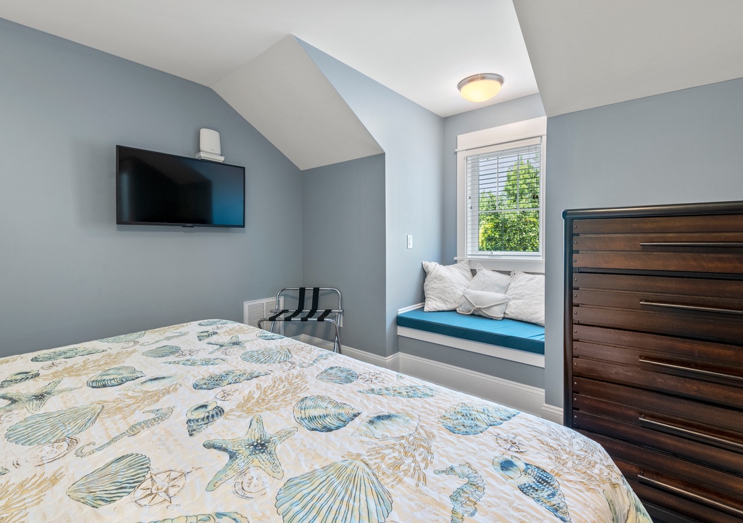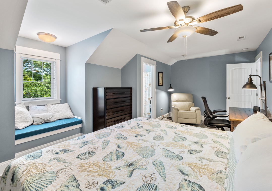 Situated on the top floor, you’ll find an additional ensuite king bedroom that is sure to delight those that need to do a bit of work from home or getaway from all the commotion below! This suite boasts a beautiful working desk/chair, cozy window seat, and new leather glider.