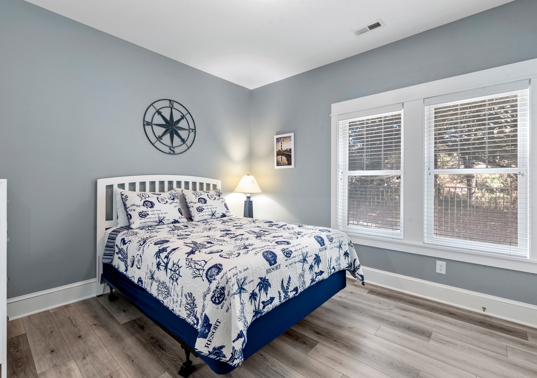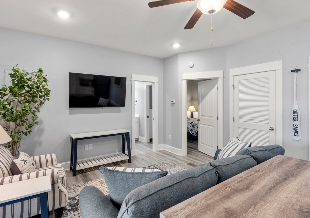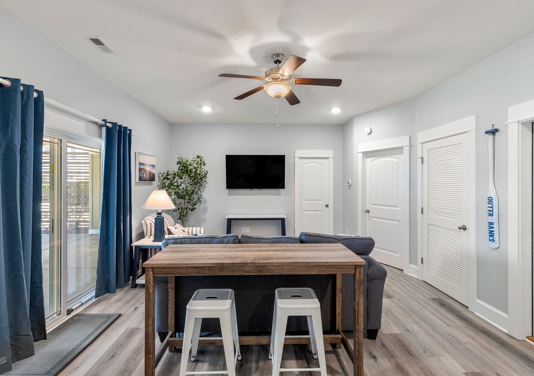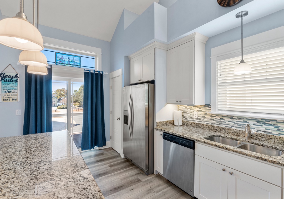Ahhhh! Relaxation! Everything at Sunset Villa soothes the soul, from the cool blue gray of the walls to the balconies and the patio outside. I stayed in the downstairs bedroom/suite where I could read in peace while the rest of the family watched a movie upstairs. Early morning walks by the sound about a block away or by the beach (a little farther)were so filled with birdsong I got an app for my phone to tell me who was chirping. There are good restaurants in the area, but we made use of the grill and well-stocked kitchen, dining at the trestle type table. This table was perfect for games after dinner, too! Adirondack chairs on the balconies (ideal for sunsets!) and the patio provide outdoor comfort. You don`t go to the Outer Banks to stay inside, but Sunset Villa gave me a delightful respite after my beach time. My bedroom had ample storage, a full bath, and a fabulous bed--I slept like a log, perhaps a driftwood one! Upstairs are 3 more bedrooms, each with its bath. There`s a living/sitting room by the large TV; for those who don`t want to watch, there`s another sofa and chair downstairs. The kitchen is large (2 or more people can cook or prep)and open, with an island and stools for eating or supervising the culinary efforts. Love those marble counters! I look forward to coming back here next year--I feel the need for some OBX time at Sunset Villa.- Posted: 4/1/2023