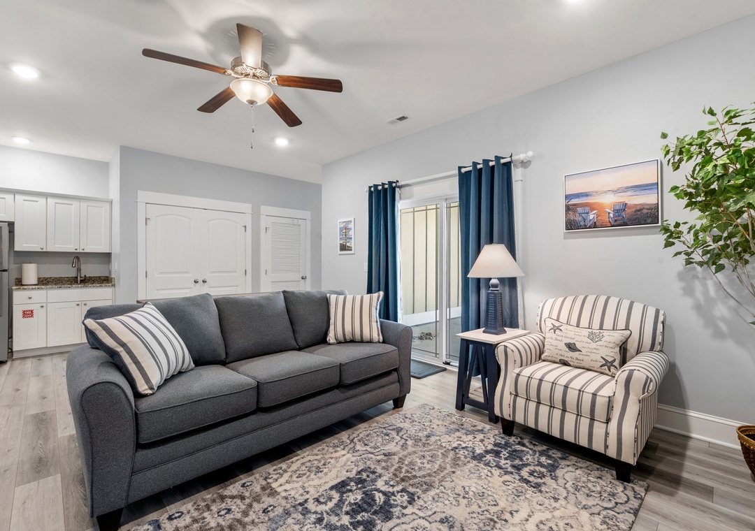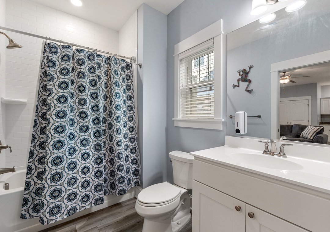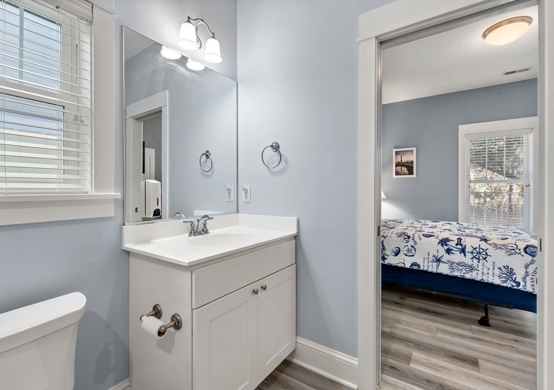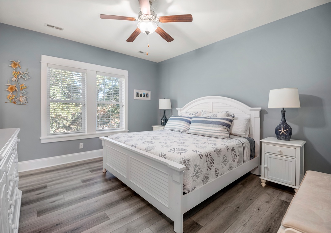Ahhhh! Relaxation! Everything at Sunset Villa soothes the soul, from the cool blue gray of the walls to the balconies and the patio outside. I stayed in the downstairs bedroom/suite where I could read in peace while the rest of the family watched a movie upstairs. Early morning walks by the sound about a block away or by the beach (a little farther)were so filled with birdsong I got an app for my phone to tell me who was chirping. There are good restaurants in the area, but we made use of the grill and well-stocked kitchen, dining at the trestle type table. This table was perfect for games after dinner, too! Adirondack chairs on the balconies (ideal for sunsets!) and the patio provide outdoor comfort. You don`t go to the Outer Banks to stay inside, but Sunset Villa gave me a delightful respite after my beach time. My bedroom had ample storage, a full bath, and a fabulous bed--I slept like a log, perhaps a driftwood one! Upstairs are 3 more bedrooms, each with its bath. There`s a living/sitting room by the large TV; for those who don`t want to watch, there`s another sofa and chair downstairs. The kitchen is large (2 or more people can cook or prep)and open, with an island and stools for eating or supervising the culinary efforts. Love those marble counters! I look forward to coming back here next year--I feel the need for some OBX time at Sunset Villa.- Posted: 4/1/2023