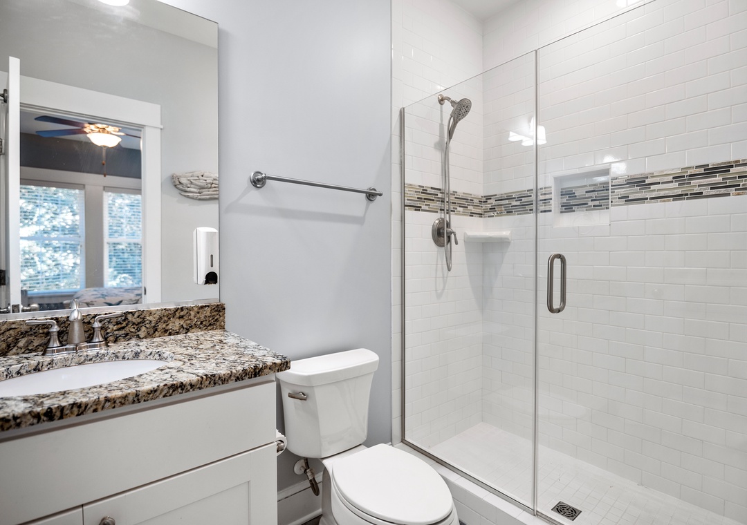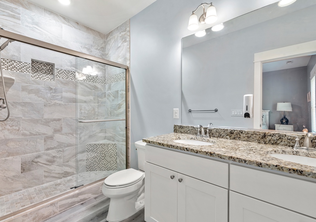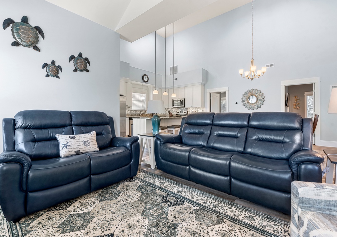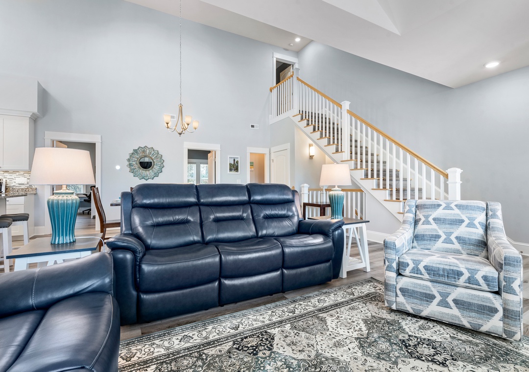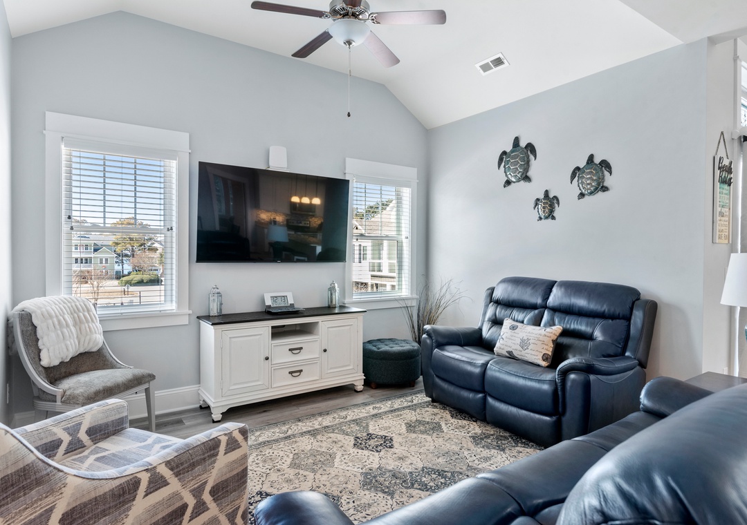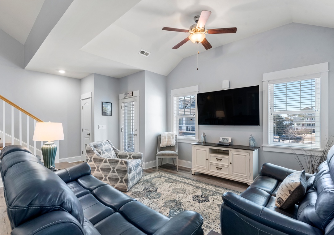 The main level has soaring vaulted ceilings in the open-concept layout. There are two master bedrooms each with glass shower ensuites: the queen has been designed to offer a small working desk and chair: the king boasts a new Serta I-Comfort Hybrid mattress. The great room offers another large 65” smart Roku TV, new leather reclining sofas, and additional seating for the whole family. The new dining area is designed to seat eight, with a bench that offers easy in and out seating. The well-equipped kitchen boasts stainless-steel appliances, granite counters, an island with barstools, huge pantry, and plenty of workspace. Enjoy the gorgeous sunsets on either of the two front decks outfitted with new Nags Head Polywood furniture.