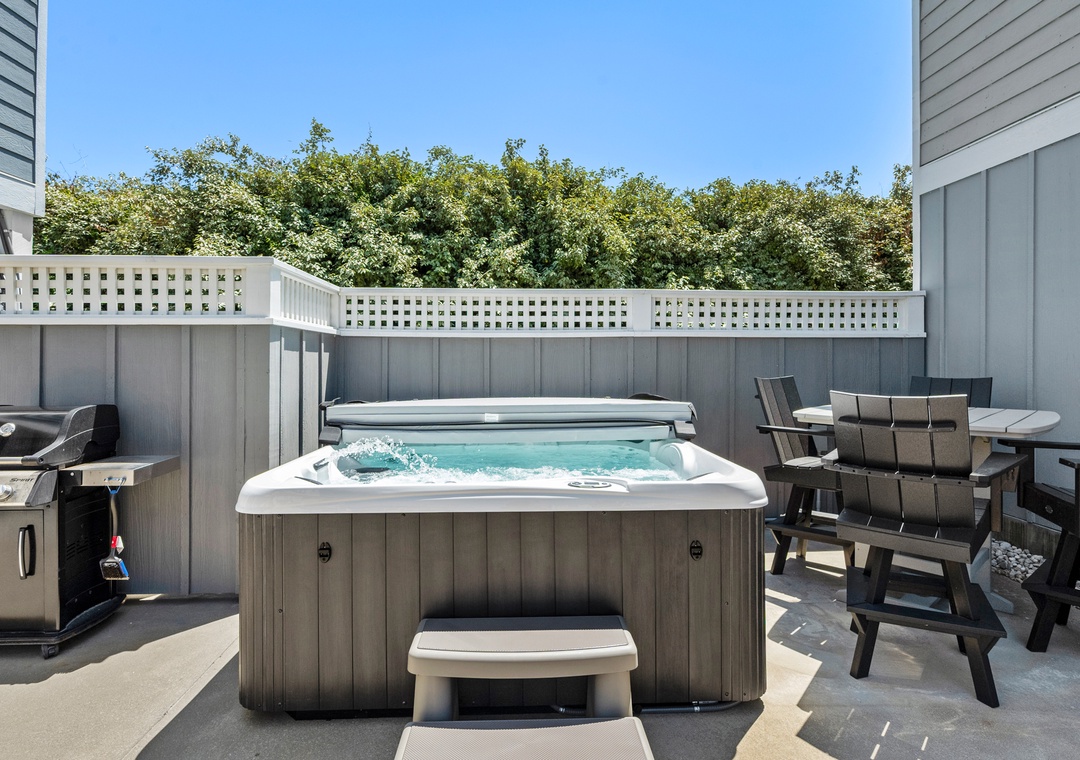 Downstairs, the ground level media room can serve as a second living area or kids hangout space. Use the additional full-size fridge for storing extra groceries or for grabbing a convenient drink or snack without having to go upstairs. Just outside, the enclosed yard with privacy fence is ideal for families with dogs or small children. It includes a grilling area for outdoor gatherings and a bubbly hot tub for a relaxing soak at the end of the evening.