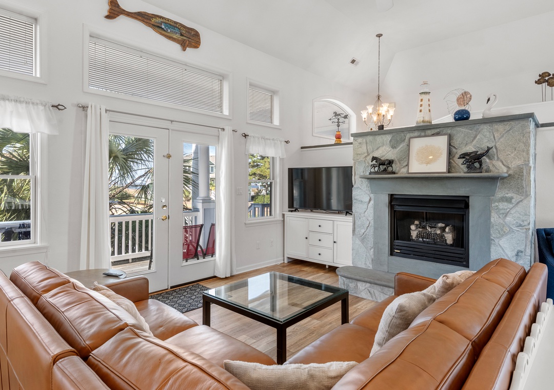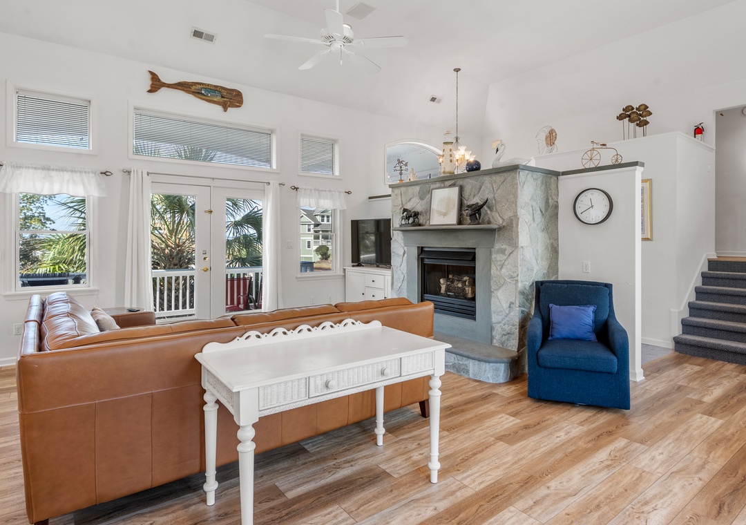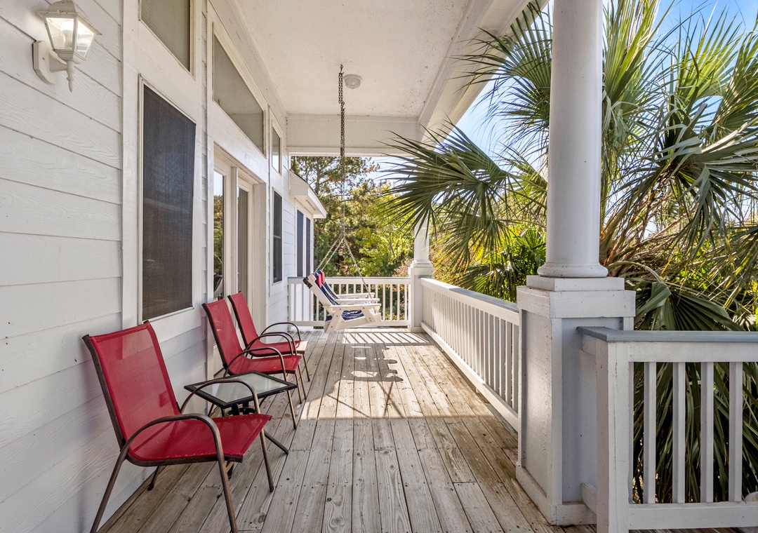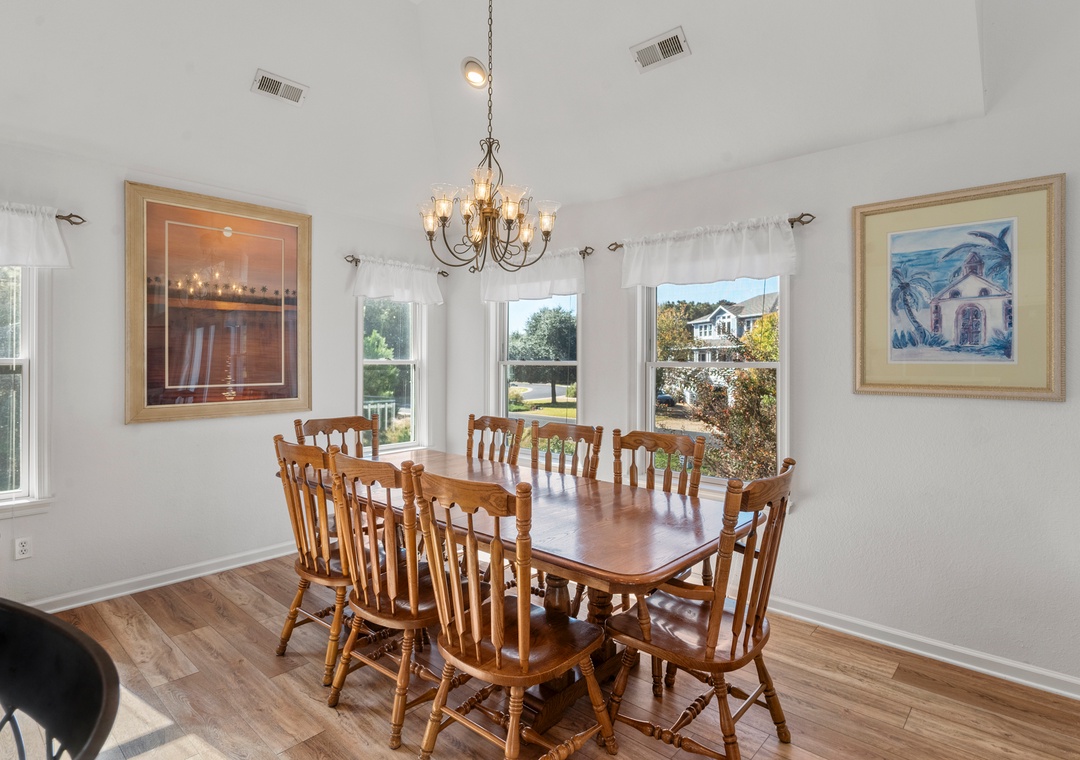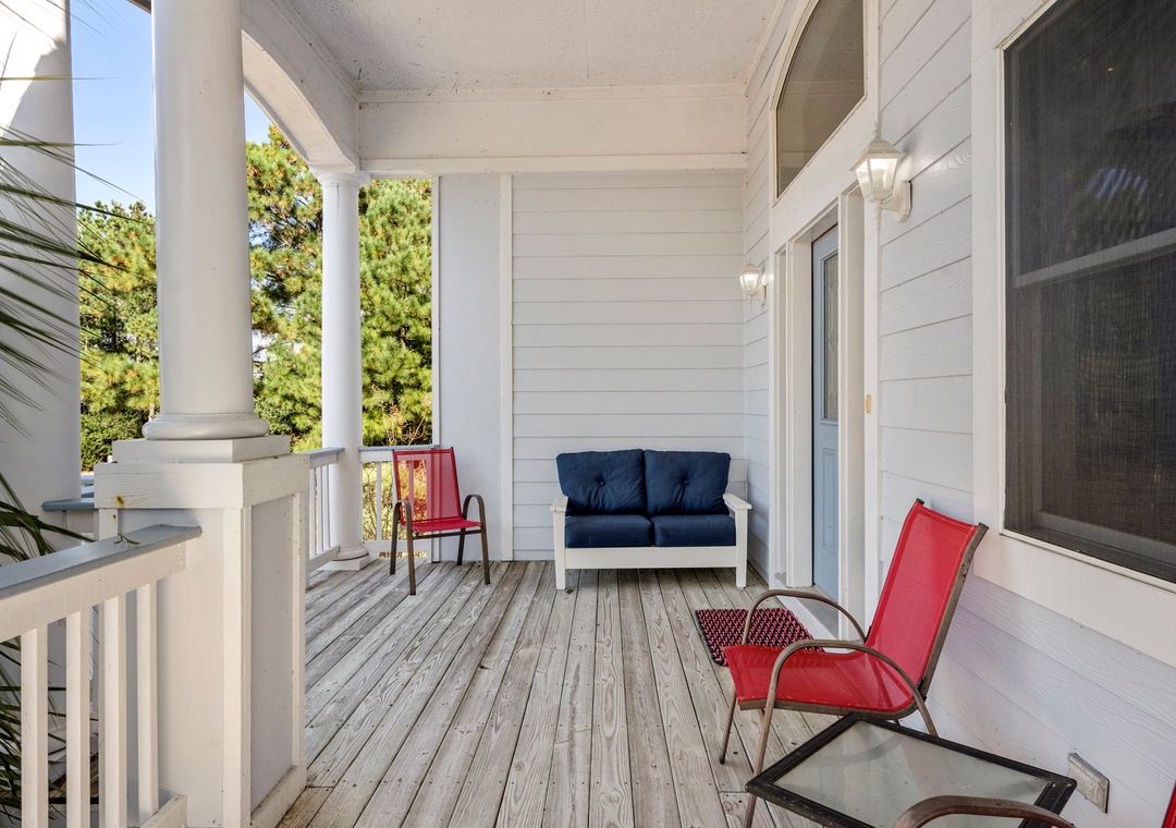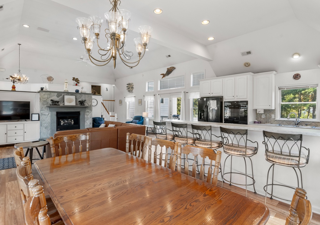 Inside, the open-concept great room has been tastefully furnished for maximum comfort. This bright and airy space boasts a soaring tray ceiling, gas fireplace (off-season only) and direct access to an east-facing sun deck that overlooks the pool and backyard. Get dinner started in the fully stocked kitchen that features a double oven for preparing a family feast. With a dining table for eight and bar seating for four more, there's plenty of room to sit down and enjoy meals together. After a day at the beach or lounging by the pool, wind down in the evenings with a refreshing beverage while watching the sunset from the spacious front porch.