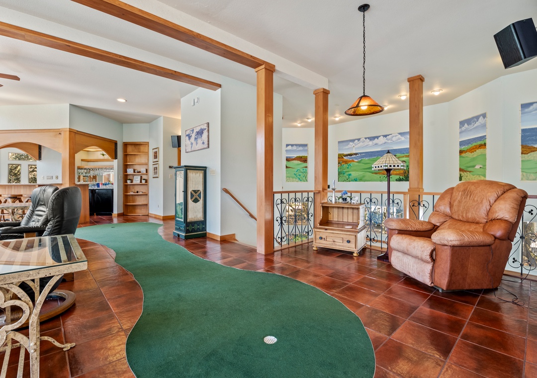 The entire mid-level is dedicated to quality time with family and friends. Watch multiple games at once on the three TV's in the living area, which flows seamlessly into a two-story rec room with pool table and foosball. Connecting the two spaces is an indoor putting green and a full bar that make Sailors Cove feel like your own private resort. The chef in the family will appreciate the well-equipped kitchen that overlooks the living area, complete with a Dynasty range and gas cooktop, plus a huge walk-in pantry for all of your groceries. There's no shortage of outdoor space either, with both covered and sun decks everywhere you turn for seamless indoor/outdoor flow.