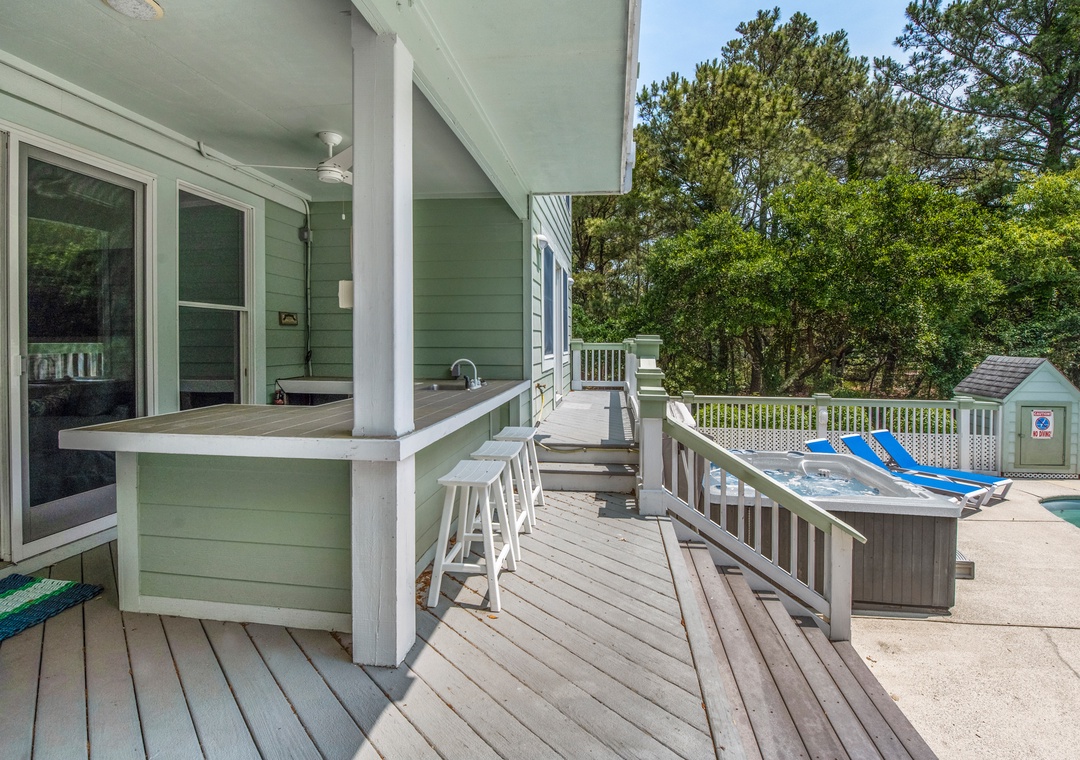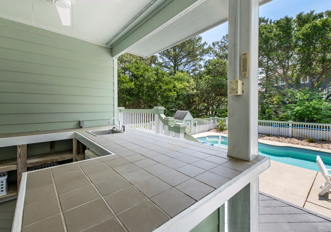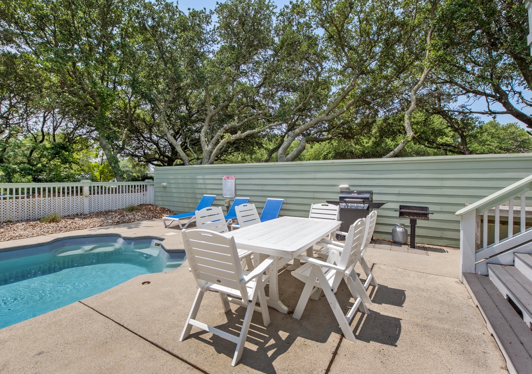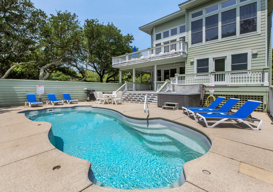 From the beautifully landscaped yard, into the lovely, thoughtfully designed and furnished interior, and out onto the private pool deck where you will find a covered tiki bar, a lighted BBQ area with grill, and lots of poolside furniture for sunning and dining. Located midway between the shopping area and recreation areas in Corolla, NC.