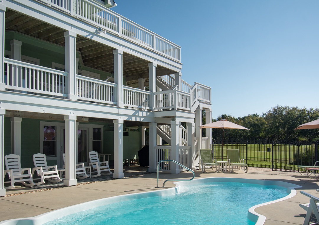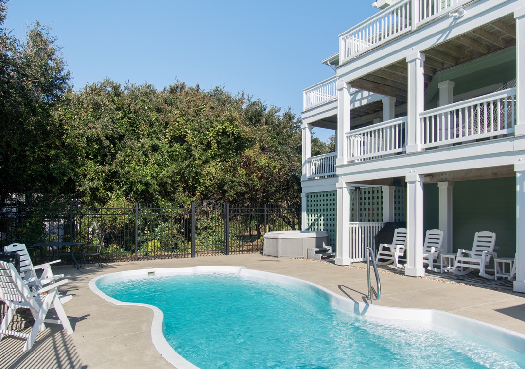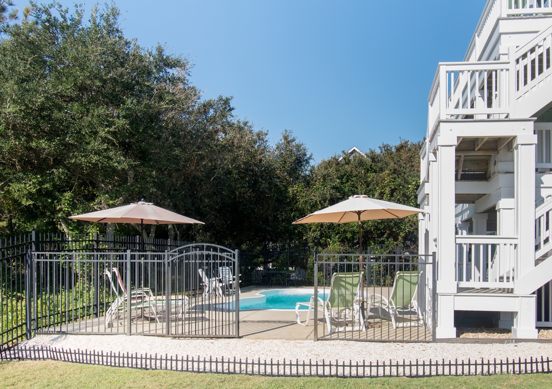 The private pool is located inside a fenced-in area. Relax on our pool loungers or deck furniture and enjoy a truly carefree vacation.