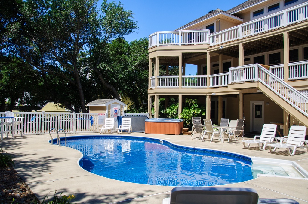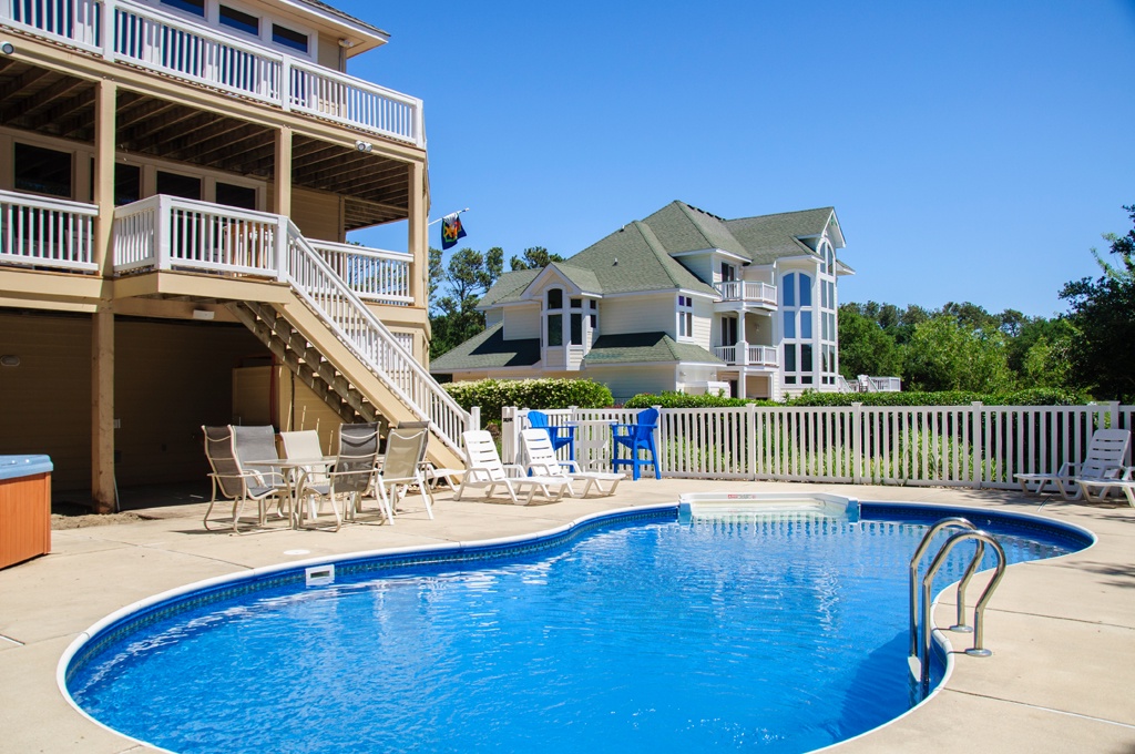 Y7 Fairways & Sunsets, a 5 bedroom well-decorated home has everything needed to accommodate guests in the northern Outer Banks. Situated within the resort-like community of The Currituck Club, guests will enjoy The Currituck Club amenities; tennis courts, community pools and a trolley service (throughout the summer months) and this home also comes with reduced greens fees and priority tee times.. Pamper yourself as this home truly offers luxurious accommodations. Take a dip in your own 16' x 30' private pool or sit back and relax in the hot tub and watch the sun setting over the Currituck Sound. The elevator provides an easy check in and check out and is perfect when carrying groceries.