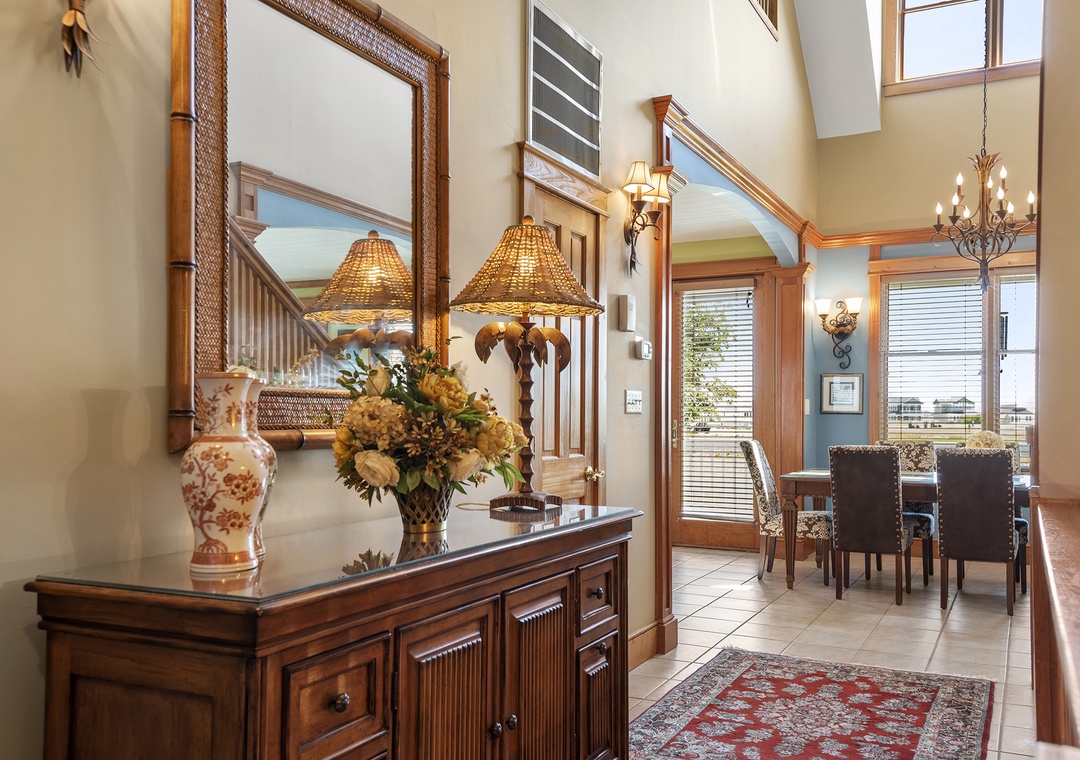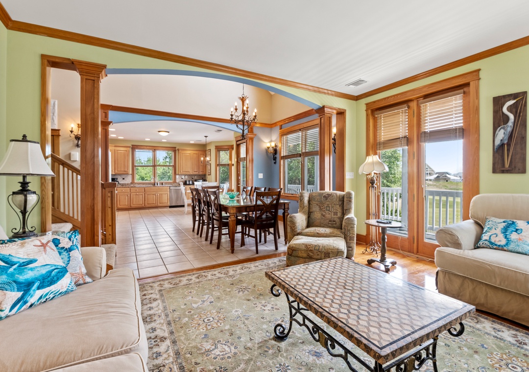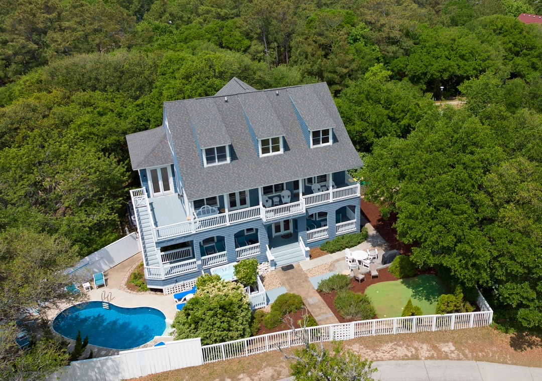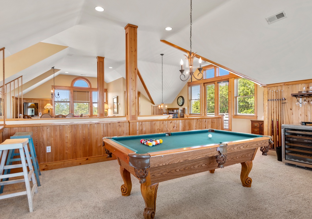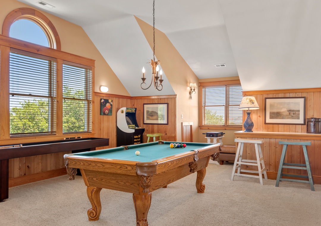 Enjoy classic vacation style in this Currituck Club home situated on the 9th fairway. Five large bedrooms, including two luxurious en-suites with jetted tubs, provide plenty of room for your family. An elegant game suite featuring a pool table, shuffleboard table, poker/game table, Golden Tee arcade game, and a wet bar will provide hours of fun. A 9’ x 25’ private pool, hot tub, putting green (putters and golf balls provided) are the many outdoor amenities that place this home in a category by itself.