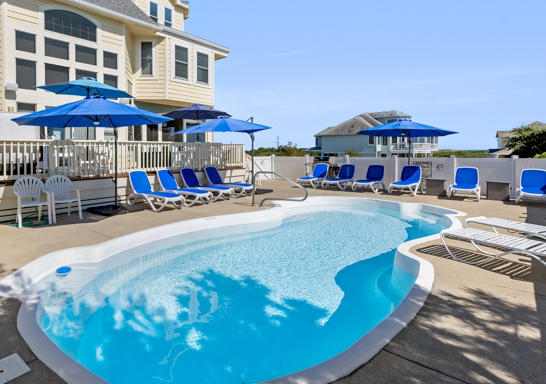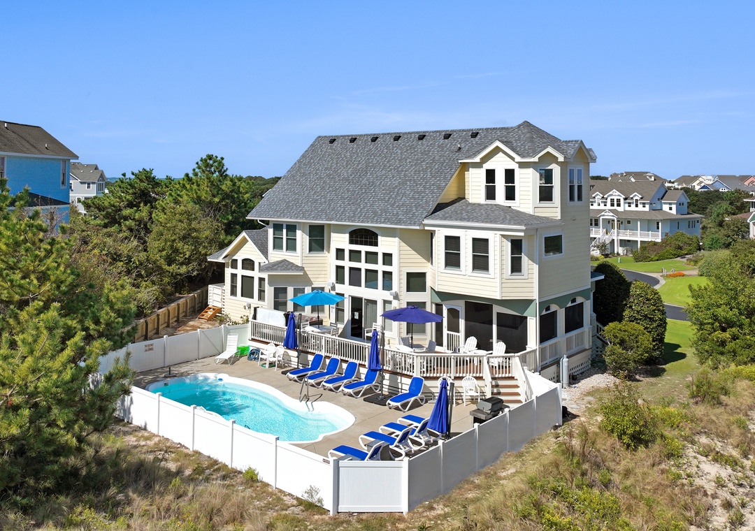 Our group of seven, two adults and five kids, thoroughly enjoyed this house for a week in late June. Every piece of furniture is comfortable and the house was fully stocked. There were numerous umbrellas and pool toys in the garage, and the umbrellas were very much appreciated on the sunny afternoons when the sun pours down. There is a little shade from the trees on one side. The trees also provide excellent coverage between the house on the right. The kitchen is fully stocked and nicely organized. The laundry room is right off the kitchen and makes for great additional storage. The Currituck Club trolley runs consistently and is about a one minute walk from the house; the kids often used it if they wanted to use the community facilities. We had zero issues. The house is even more beautiful than the pictures (the house must have been repainted since the pictures were taken because the widow's watch is a lovely shade of blue). So glad we got to stay in such a beautiful home for a week.- Posted: 6/29/2024
