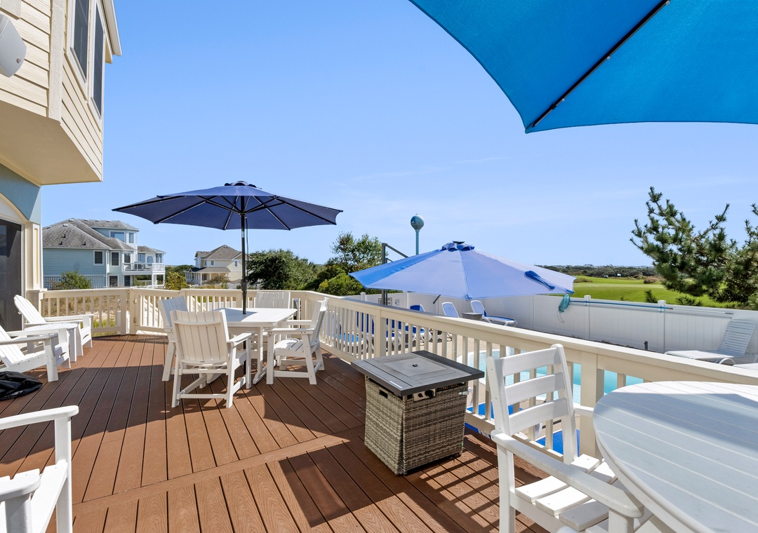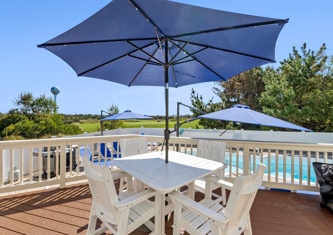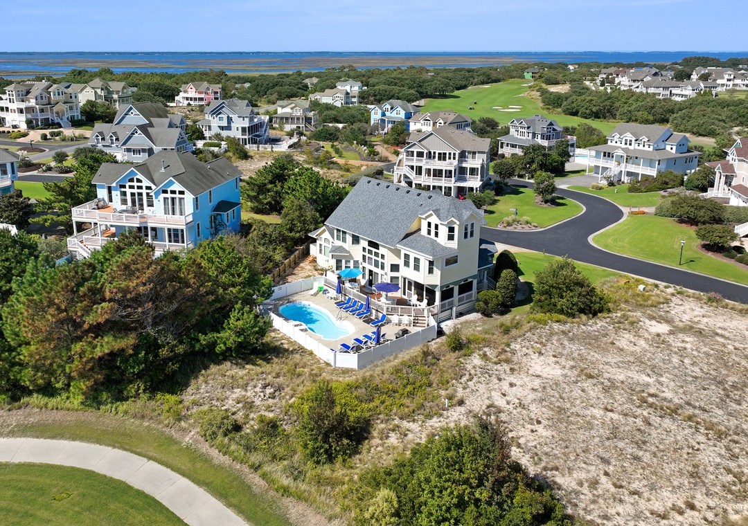 “After Dune Delight” was simply delightful morning, noon and night! Our family had a most wonderful week and this home made our stay that much better. The outdoor deck, pool and hot tub overlooking one of the Par 3 holes on the golf course is perfect for relaxation & fun. There are plenty of umbrellas to provide ample shade as well which is a great plus. Inside, the home has every amenity you look for in a vacation rental: the bedrooms have comfortable mattresses, the kitchen is well stocked, the game room has a pool table and wonderful arcade game console and the Ship’s Watch offers a quiet retreat to read and watch the sunrise. The screened-in porch is perfect for morning coffee and meals during your stay. We also loved the 2 outdoor showers. The garage is complete w a 2nd fridge, plenty of beach extras and bicycles to take a ride through the community. The owners have decorated the home so thoughtfully which provides the perfect OBX vibe throughout your stay. We will definitely be back!- Reviewed On: 8/4/2024